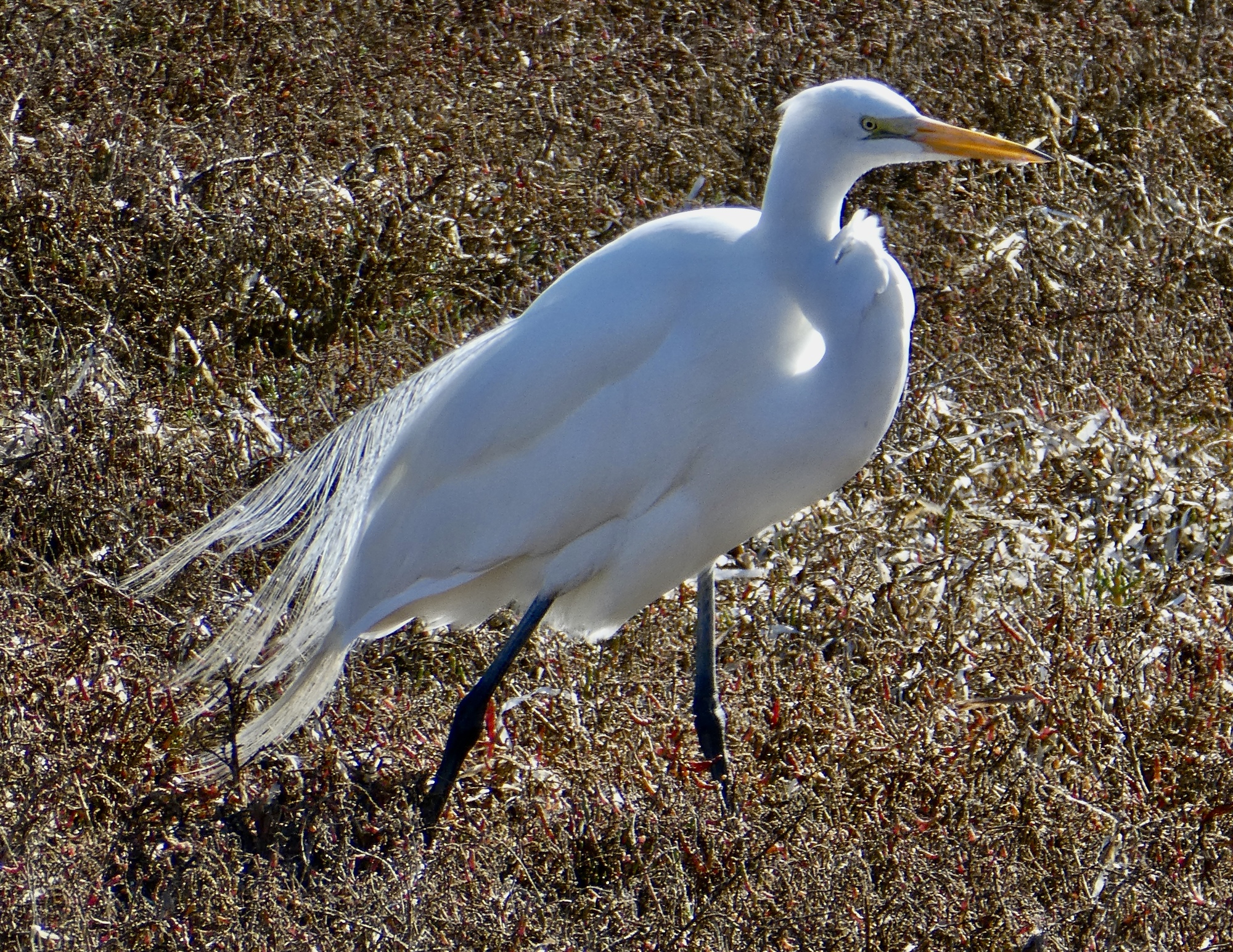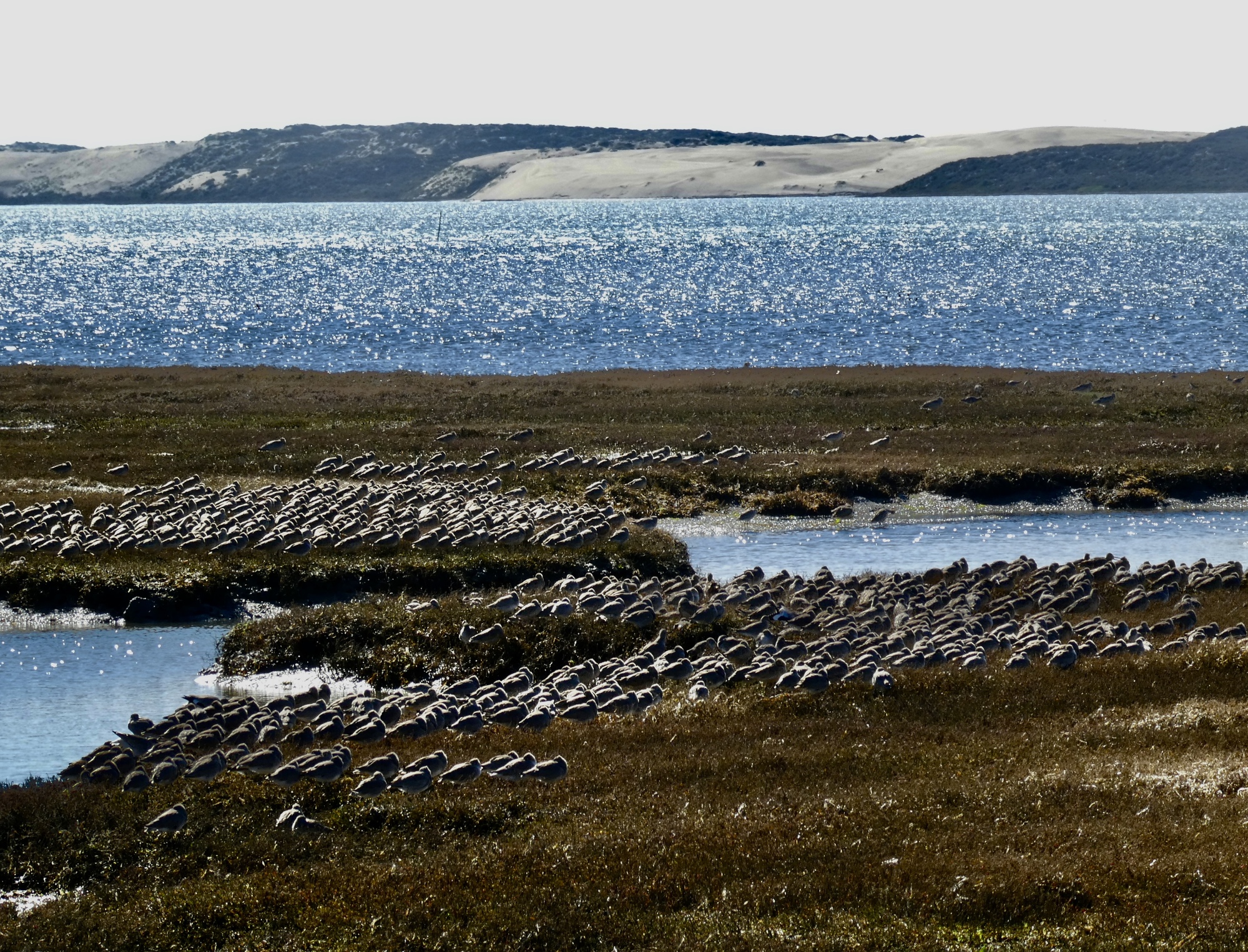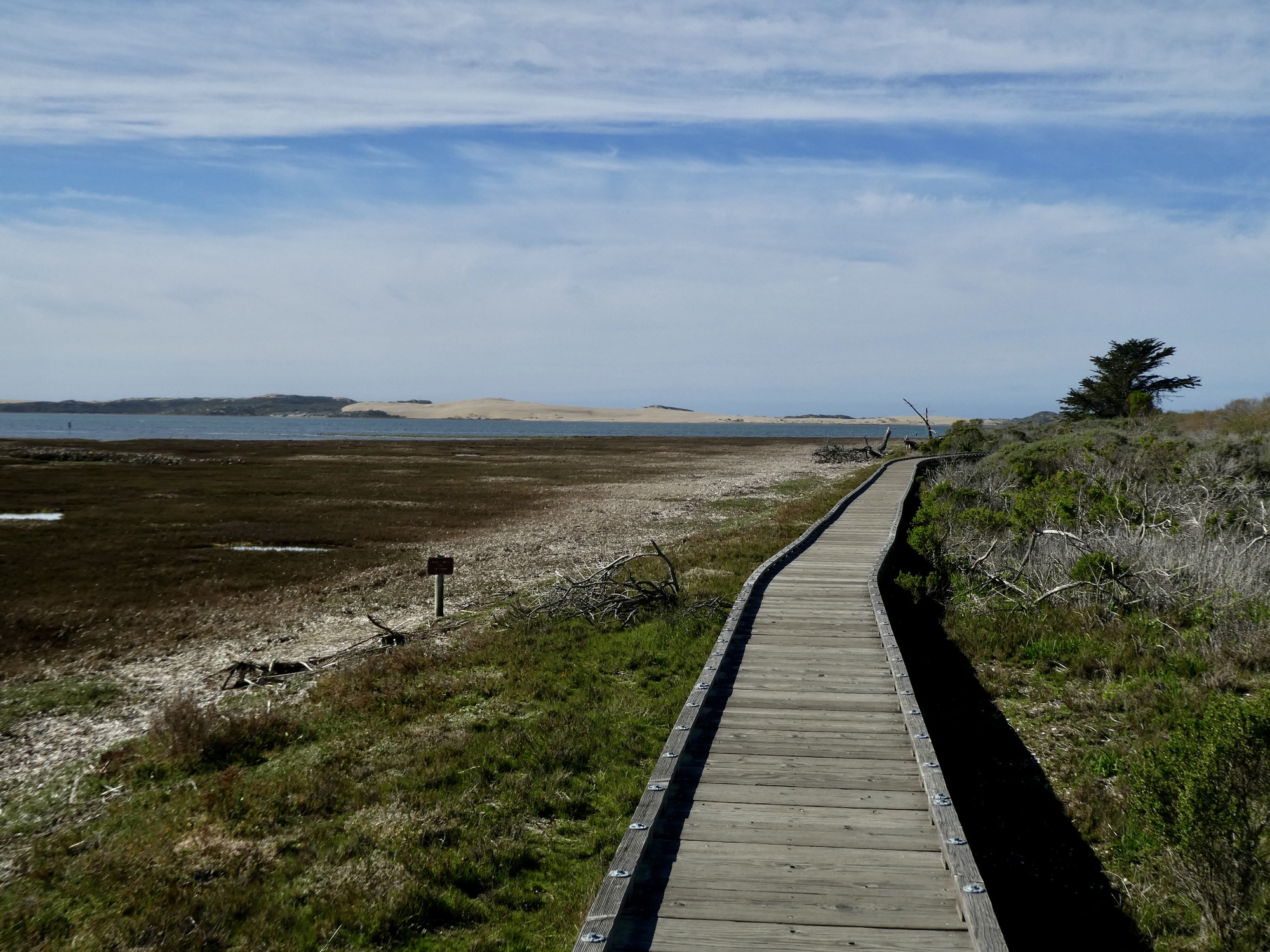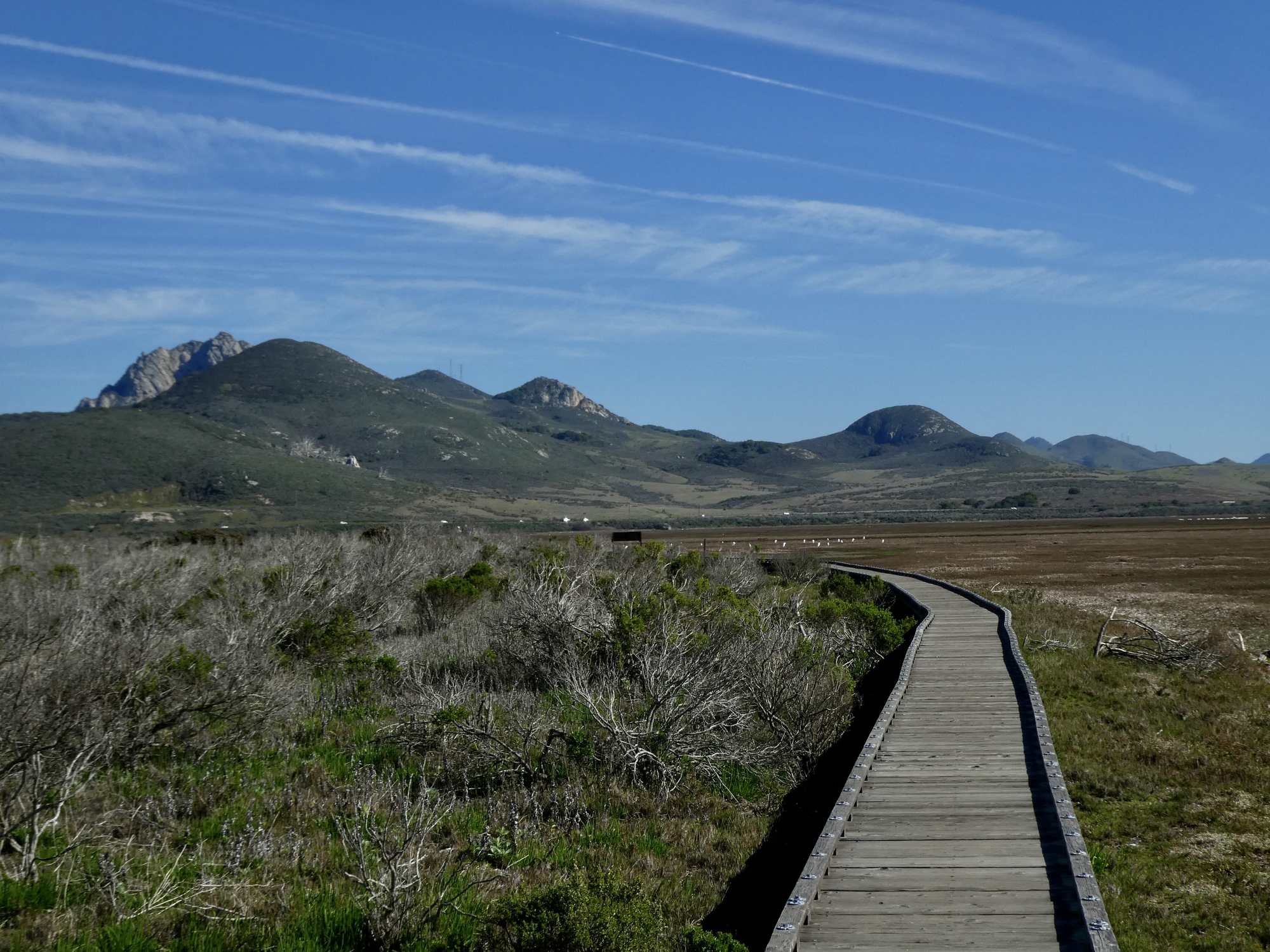 My ankle feels more stable today, so I walked about twice as far at Laguna Lake this time before easing my way back into the car and driving the short distance to Morro Bay State Park to check out the bayside trail and boardwalk that Rachael pointed out to me last night. A perfectly flat half mile loop around a small peninsula, it’s a fine hike with a startling number of birds to be seen far out on the mudflats. I identified seven new species here today and I’m certain that there were a number of others that I could have identified with a set of good binoculars. I’m sure there were willets, sanderlings and a variety of peeps out in that tightly bunched dense mass of thousands of sleeping birds, but I’ll just credit the ones I was certain of for now. I’m pretty sure I’ll be back again during our stay in Morro Bay, maybe at dawn or sunset next time.
