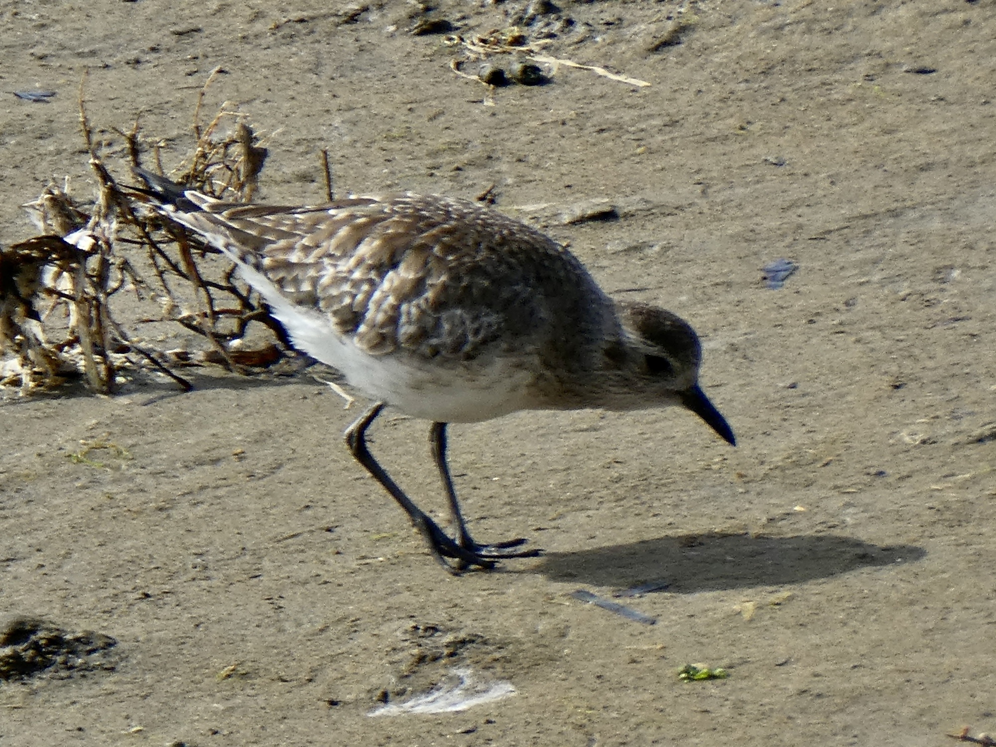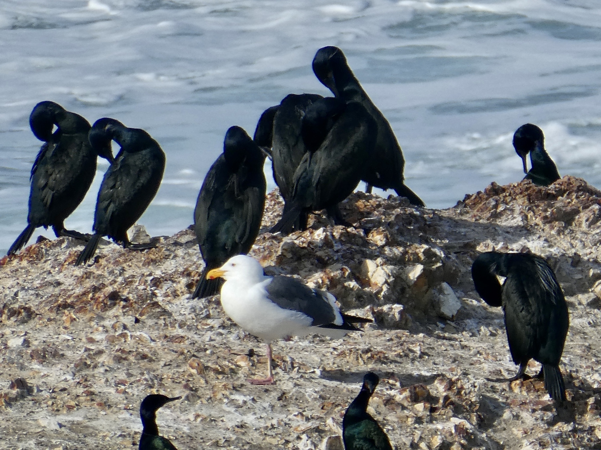 That took me about two hours; so with an abundance of time on my hands and few birds in evidence on the bluff I drove back down to Los Osos for some bayside birding and a pleasant break at a cafe, sitting in the sun enjoying my ham and cheese croissant and coffee and trying to decide if these are Brewers blackbirds or cowbirds hopping around nearby.