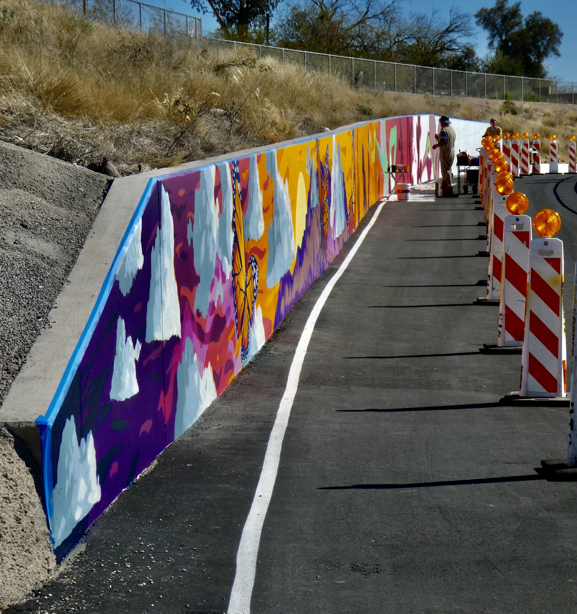 And still later it will occur to me to read up in this new creation. I learn that it’s a significant public art project with a $75,000 budget to paint the new retaining wall, awarded last year to prominent Tucson muralists Jessica Gonzales and Rock Martinez who teamed up and submitted the winning proposal. It will give us one more reason to want to come back again next winter and see it after its completion. Here is a background article from last winter about the then-planned project and the muralists.