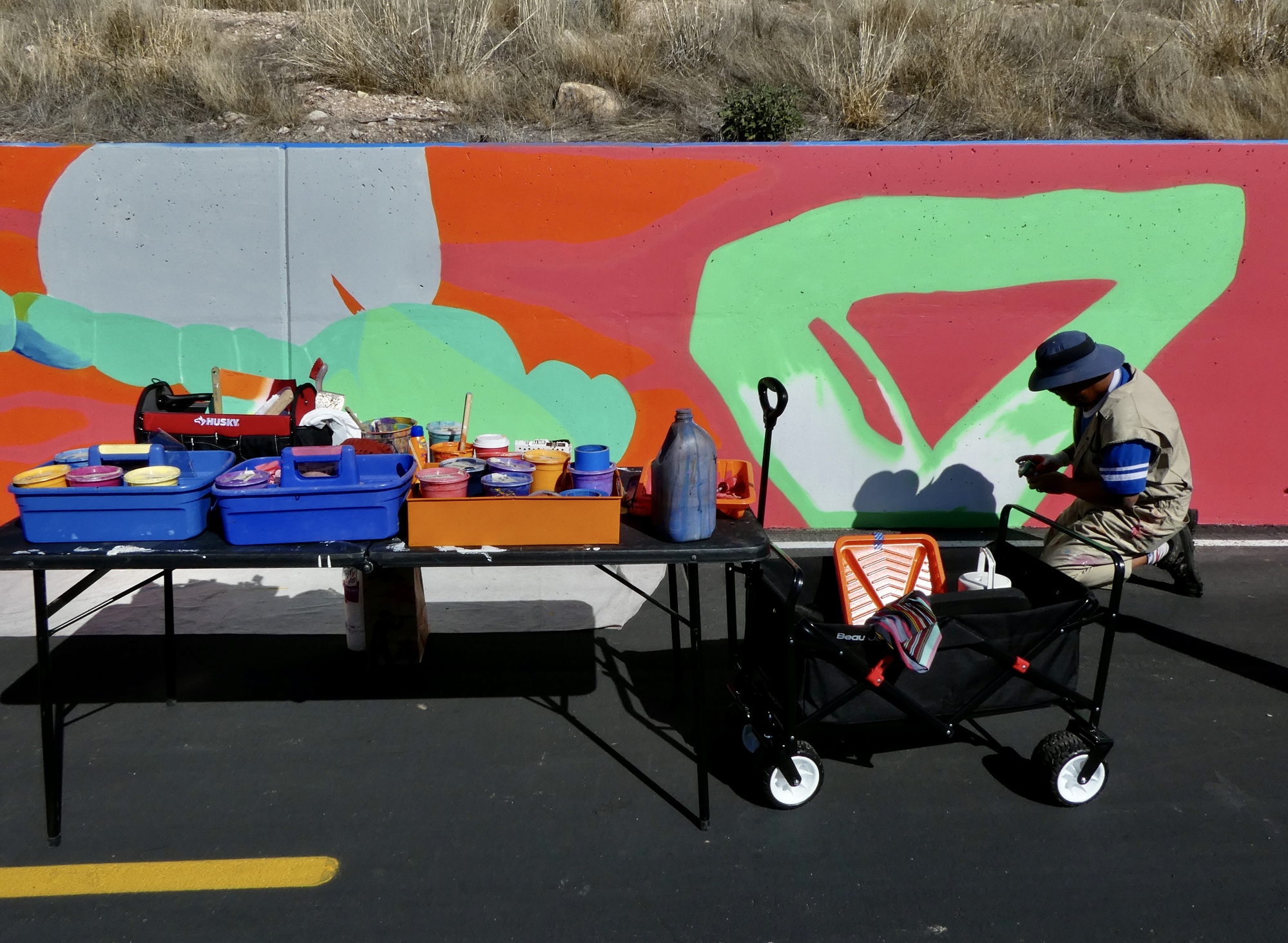 It’s about noon when we meet up near Ren. With an hour to fill we head further east, and agree to double back in about twenty minutes so we’re back in plenty of time for our lunch date. We don’t get far when I look ahead and am puzzled to see a long, colorful panel I don’t recognize. I decide to hold back and let Rachael gets there first to capture a distant shot of her for the Where’s Rachael album.