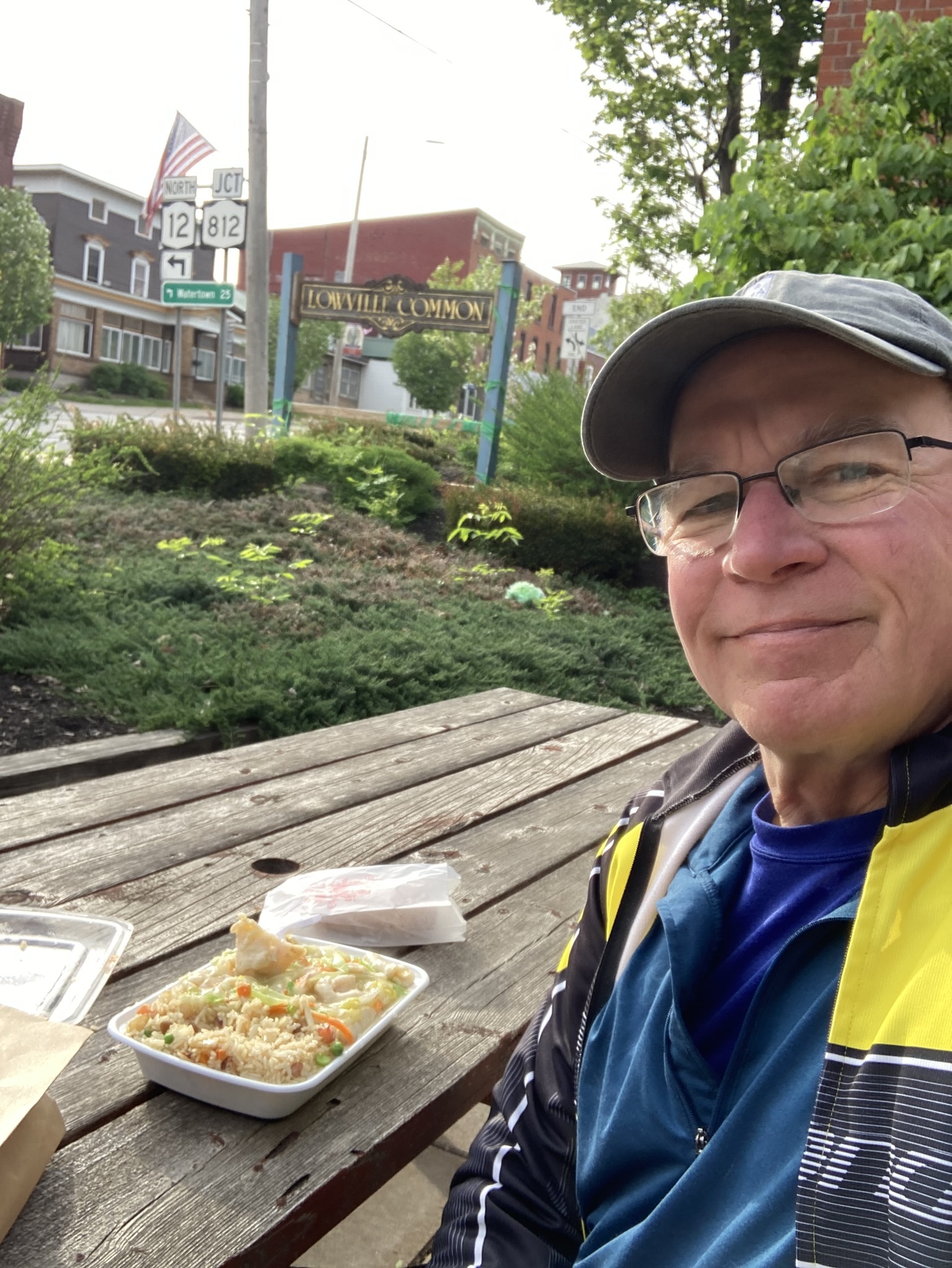I spent a great evening with John and Cathy, among other things, rethinking my route south from here. Cathy’s cycling friend suggested a route with less traffic that worked out well, even if it was a bit hillier. The weather turned brilliant but still a bit cool, a big improvement over the day before. Rte 24, then Rte 812 traversed open farmland and stunning hardwood forests, and along many rivers and streams. But it was a long day and I was quite exhausted when I reached Lowville. My motel was suitable and I walked downtown (no more riding!) to find dinner. Lowville has seen better days, but the Chinese takeout was good and I found a nice picnic table to enjoy it.