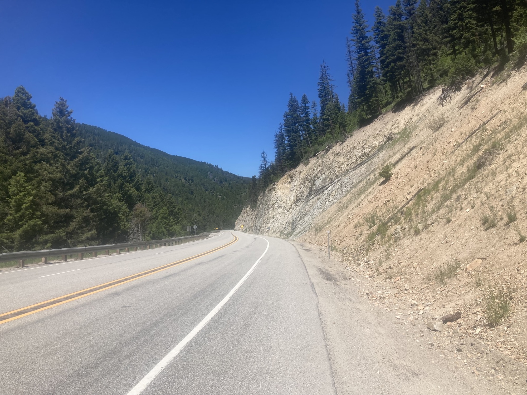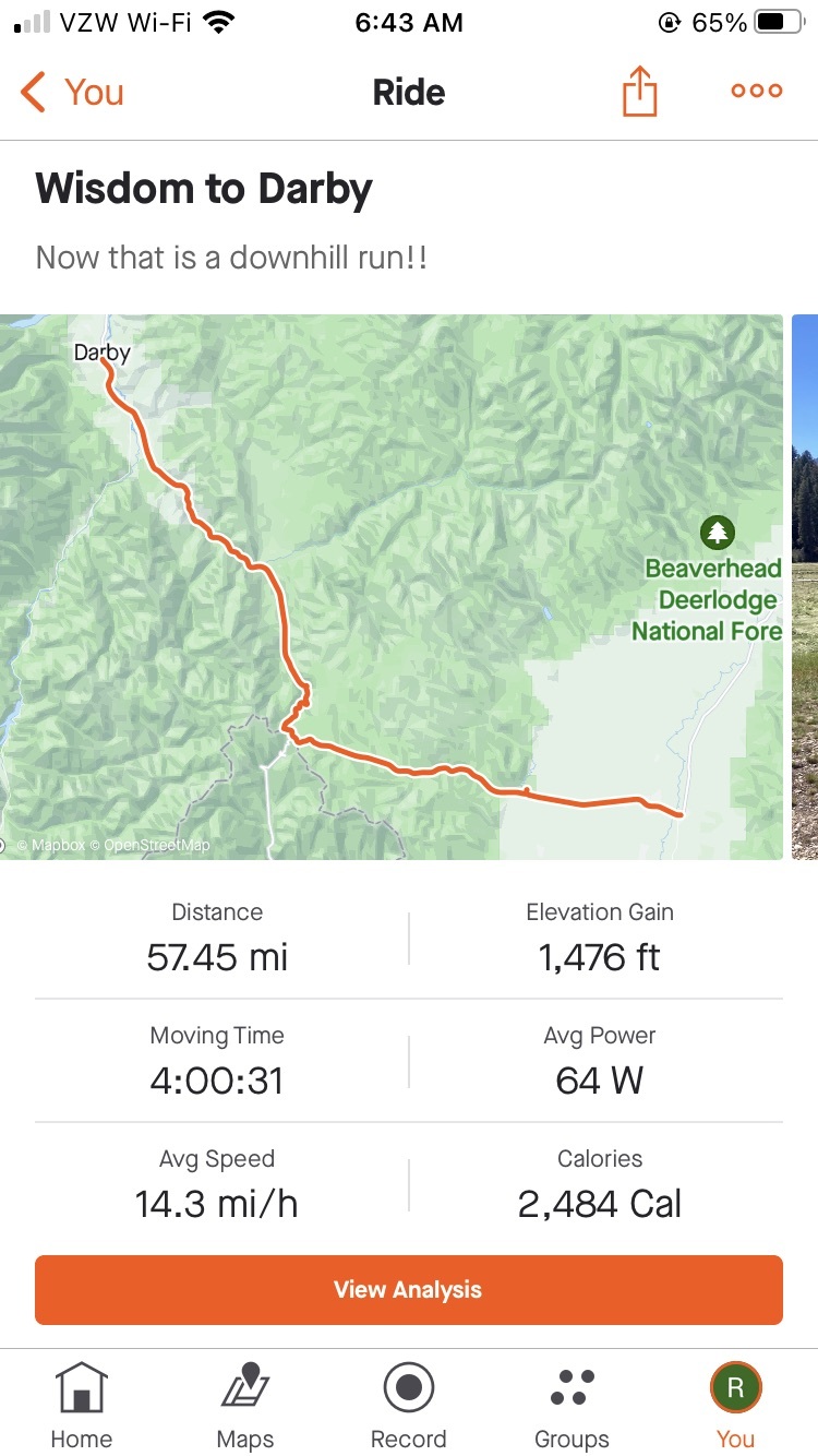 My pictures don’t really give good perspective on the fantastic downhill run on Rte 93 toward Darby, MT. Crossing the Divide again, the road pitched -6-7% for 7 or 8 miles! What a ride! The total descent was about 3500 feet. This would be a very challenging uphill grind.