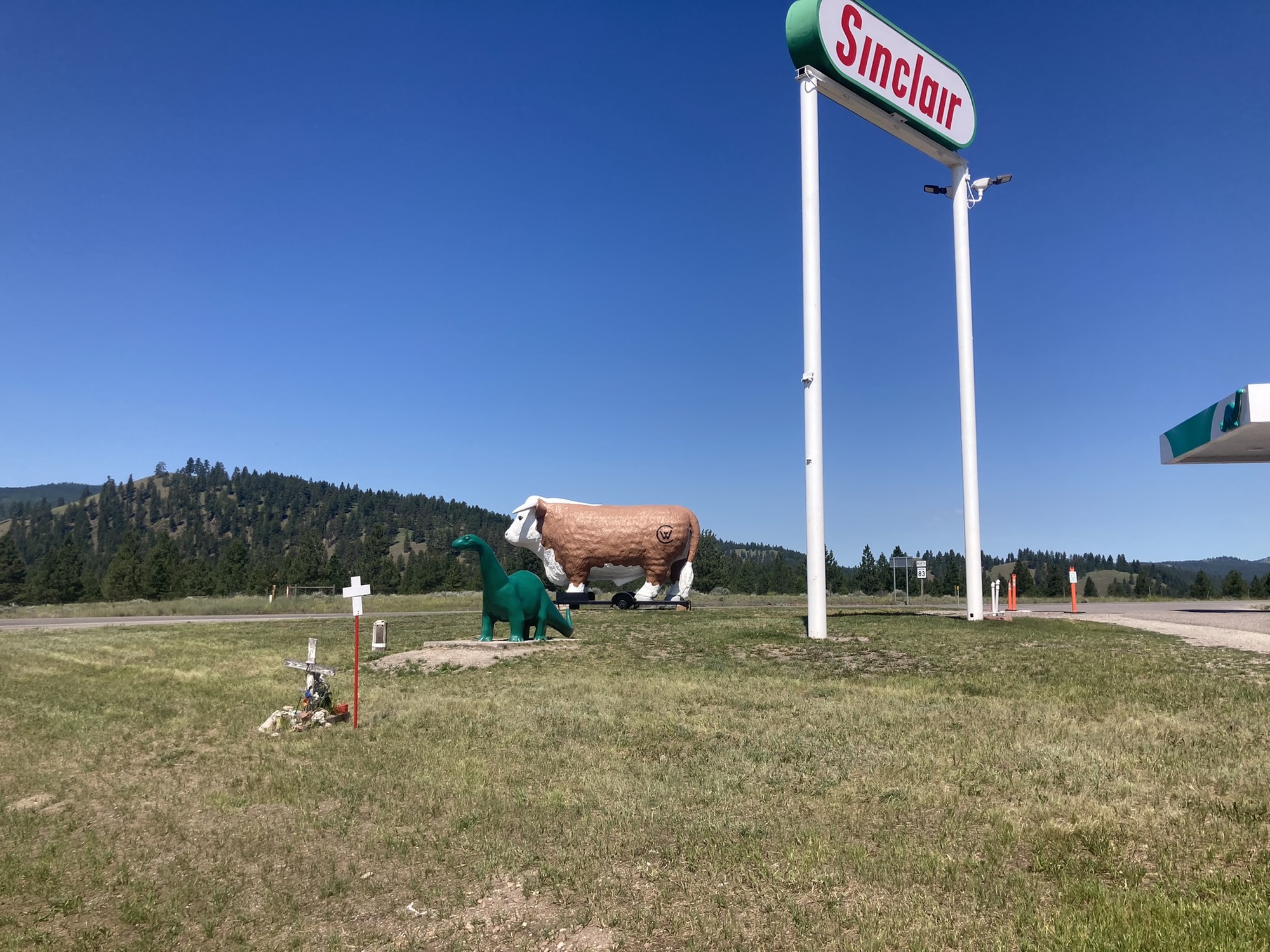 The turn north to Seeley Lake on Rte 83 is marked by a classic cow and dinosaur!