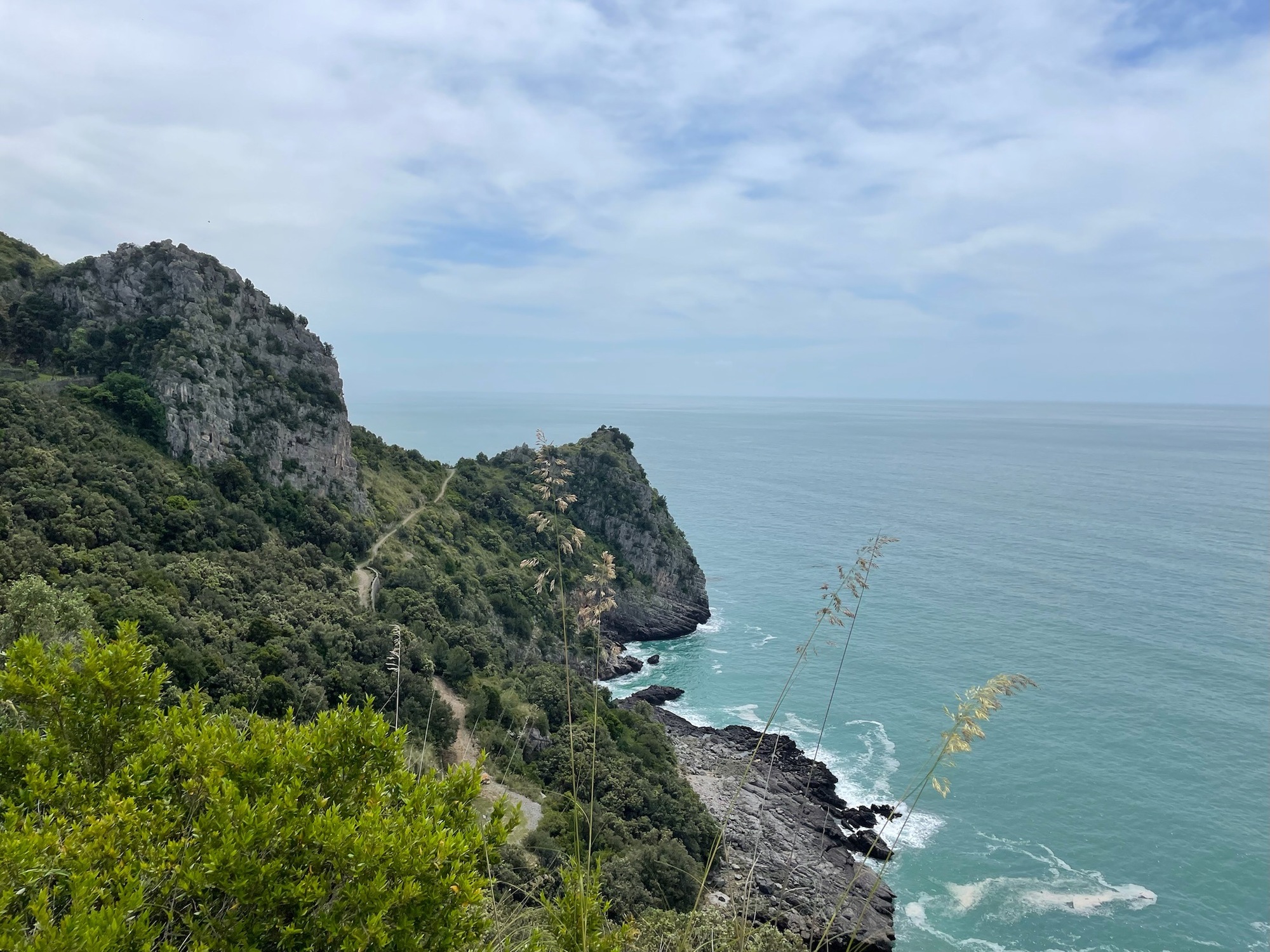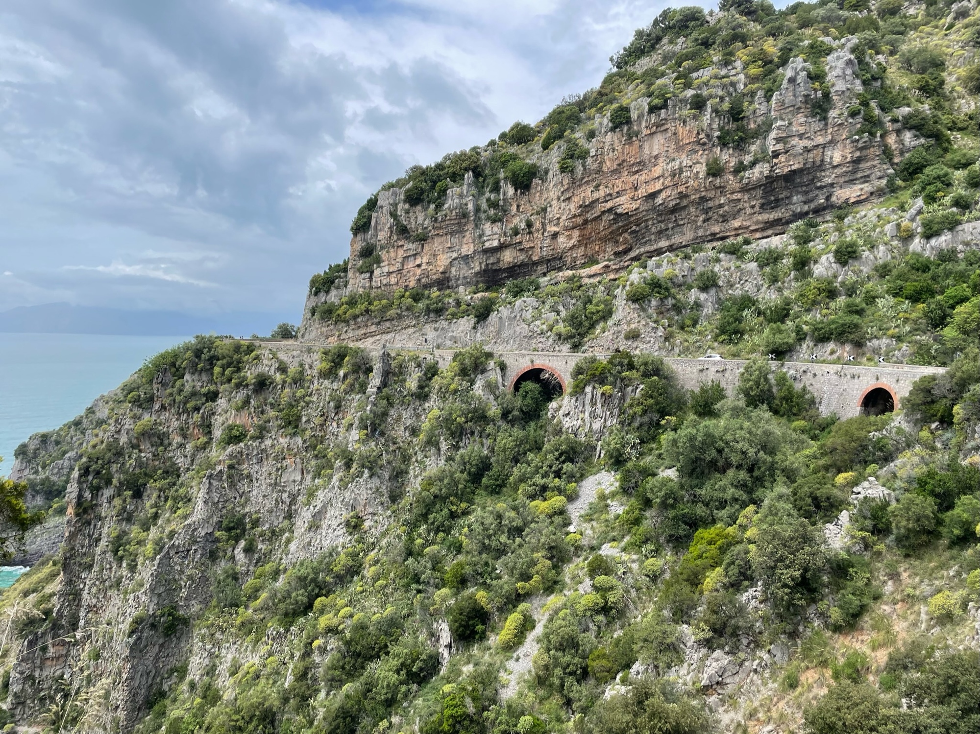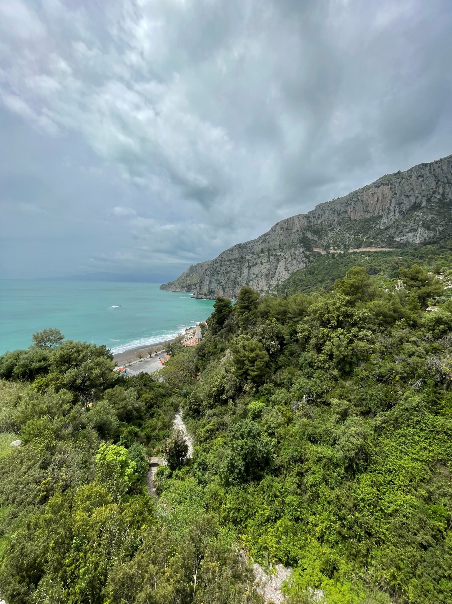 We emerged from the series of tunnels to this view over Aquafredda. You can see the coastal road in the distance. It is a very rugged coastline.