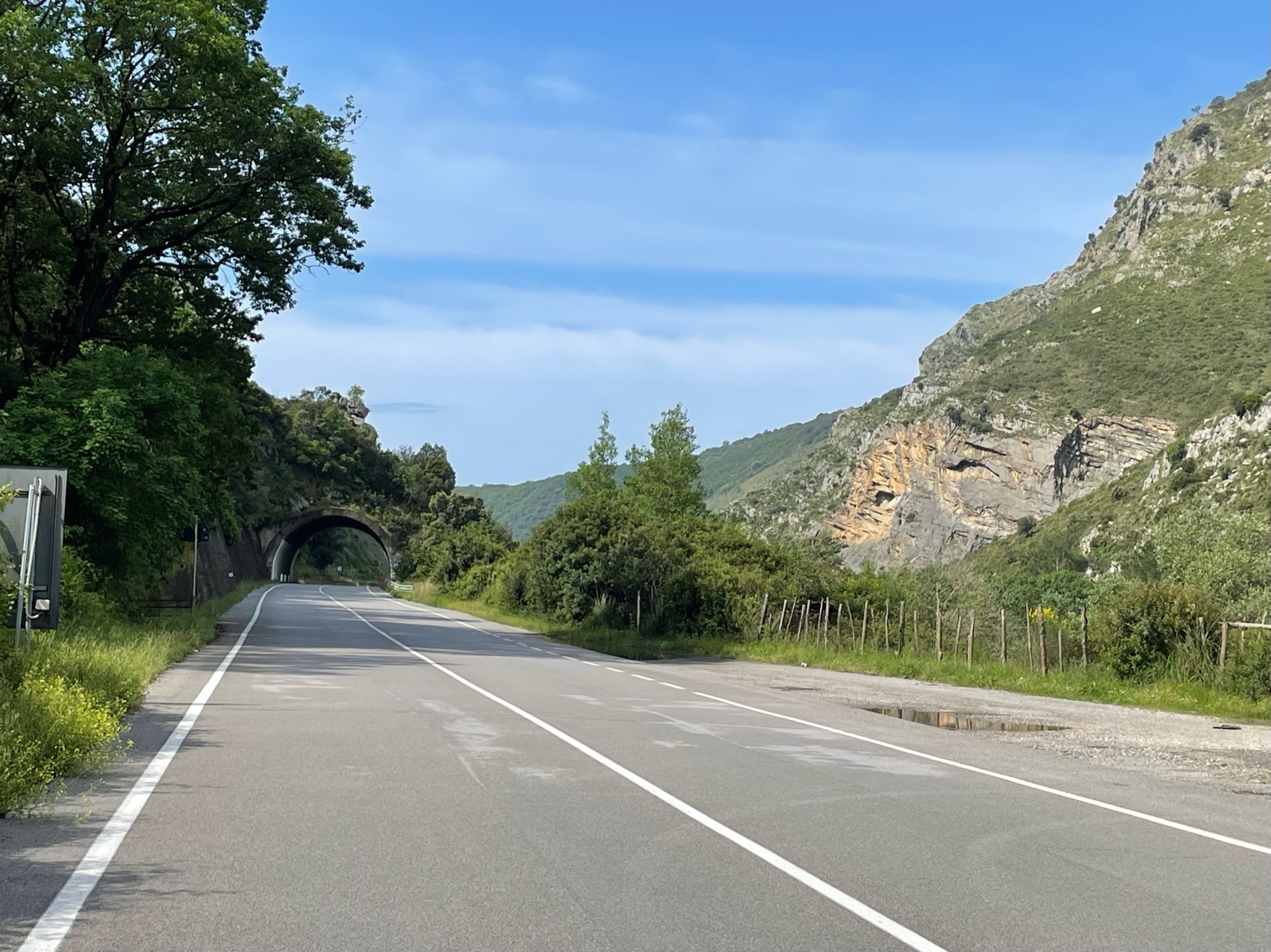 We passed through several short tunnels along the way and as we approached the last tunnel, we saw the bright hi-viz jackets of the workers at the far end. There’s always a bit of trepidation about being turned away in these situations but as we got closer, the workers saw us and let out an ‘aye-aye-ay’ and waved us through. In front of us was an enormous bolder that had crashed down and landed right at the exit of the tunnel. It brought trees and rocks with it. We humped the bikes on our shoulders to made our way through the mess and scooted out of there.