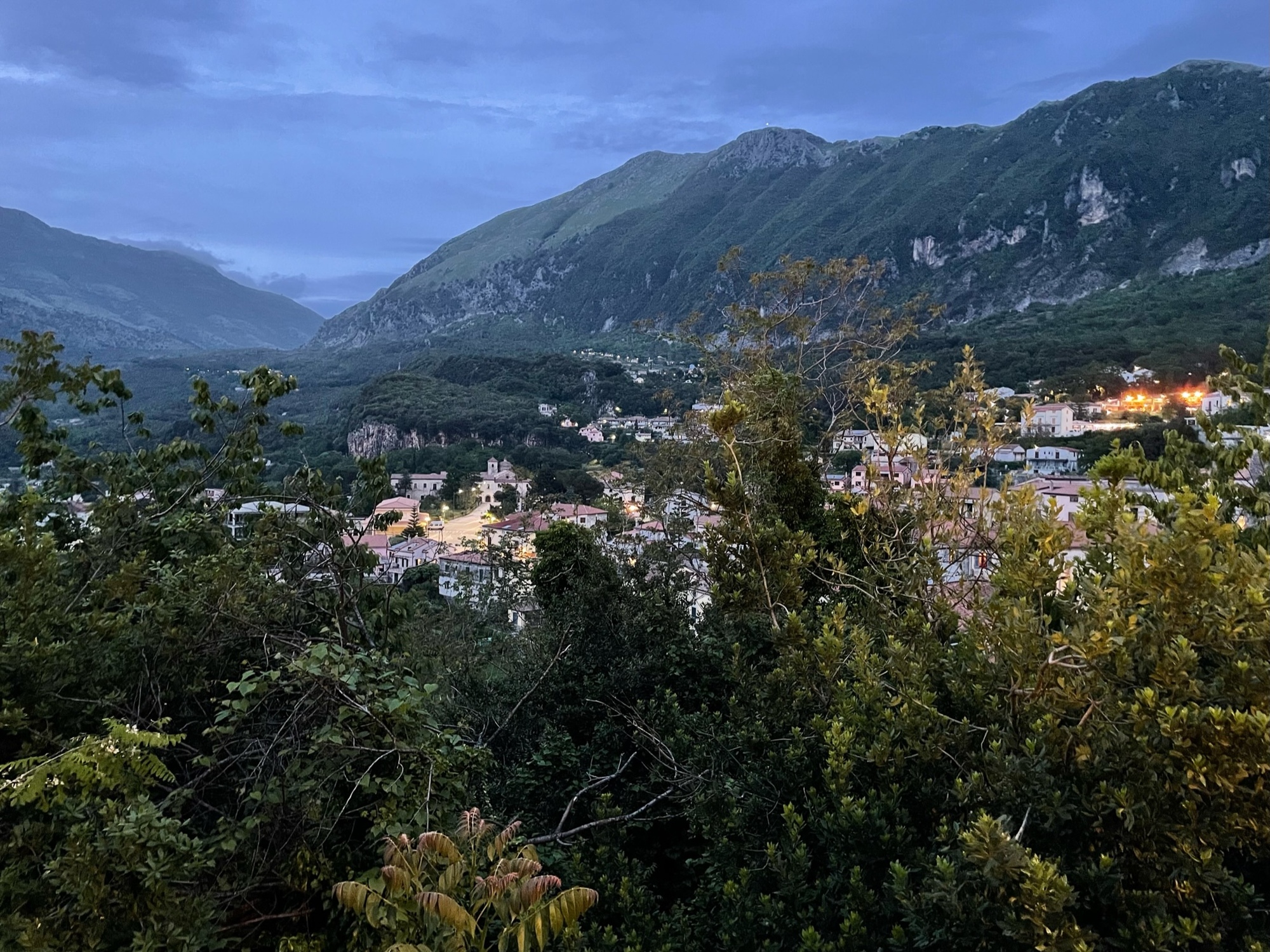 Dinner tonight was tomato salad, ravioli and spaghetti at a small enotica next to our B&B. Afterwards, we went for a stroll to take in the view of the small hamlets dotting the hills below Maratea.