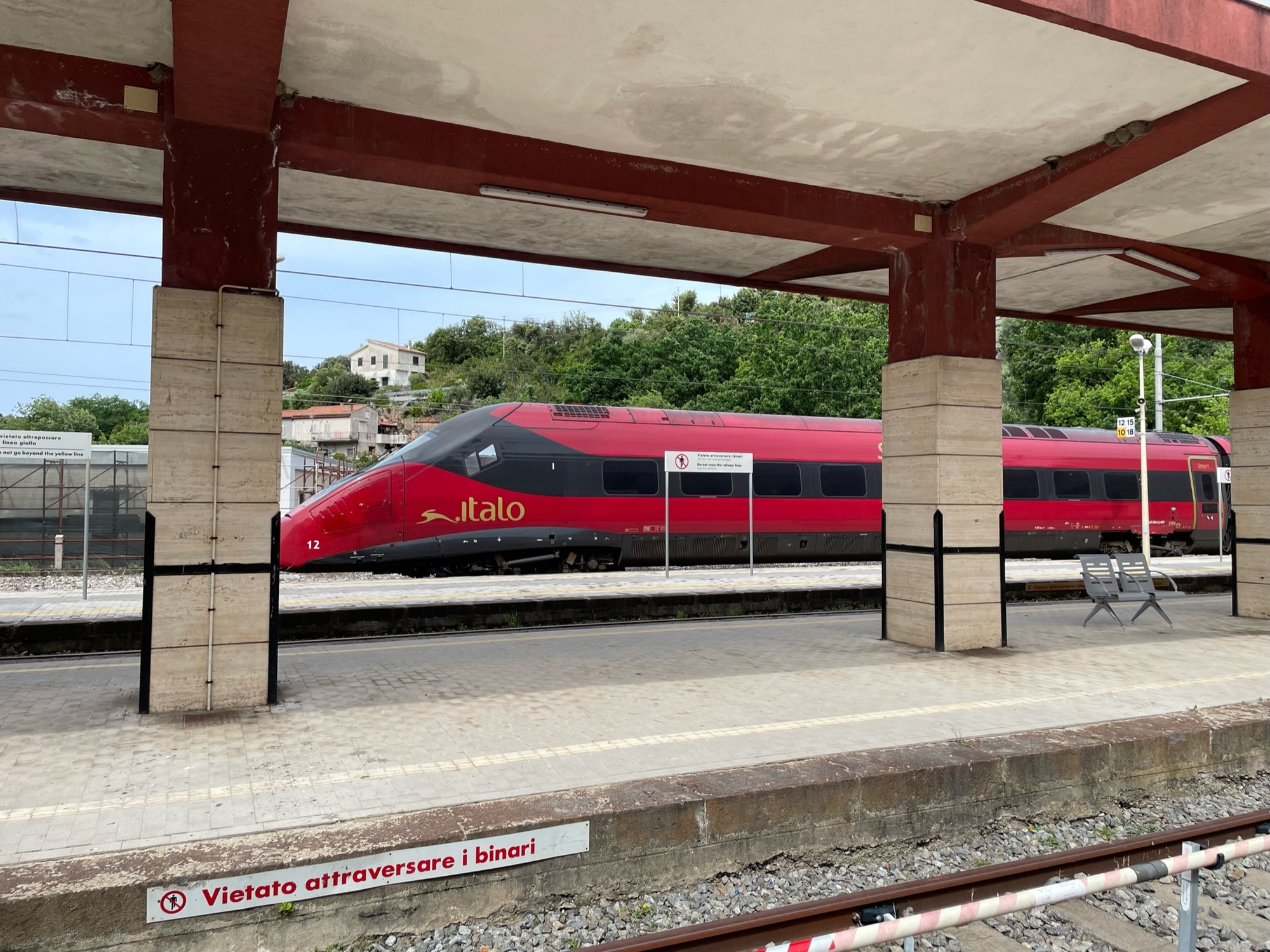 We pushed off after trucking our bikes down the steep staircase from the B&B and loading up the panniers. It was a real treat to coast down the long hill to the train station. Christina had told us about the landslide on the highway between Marina de Maratea and Scalea that had happened last December so we were prepared to take the train this morning. We could have taken it all the way to Scalea but we opted to get off at the first stop after the slide so we could ride the rest of the way.