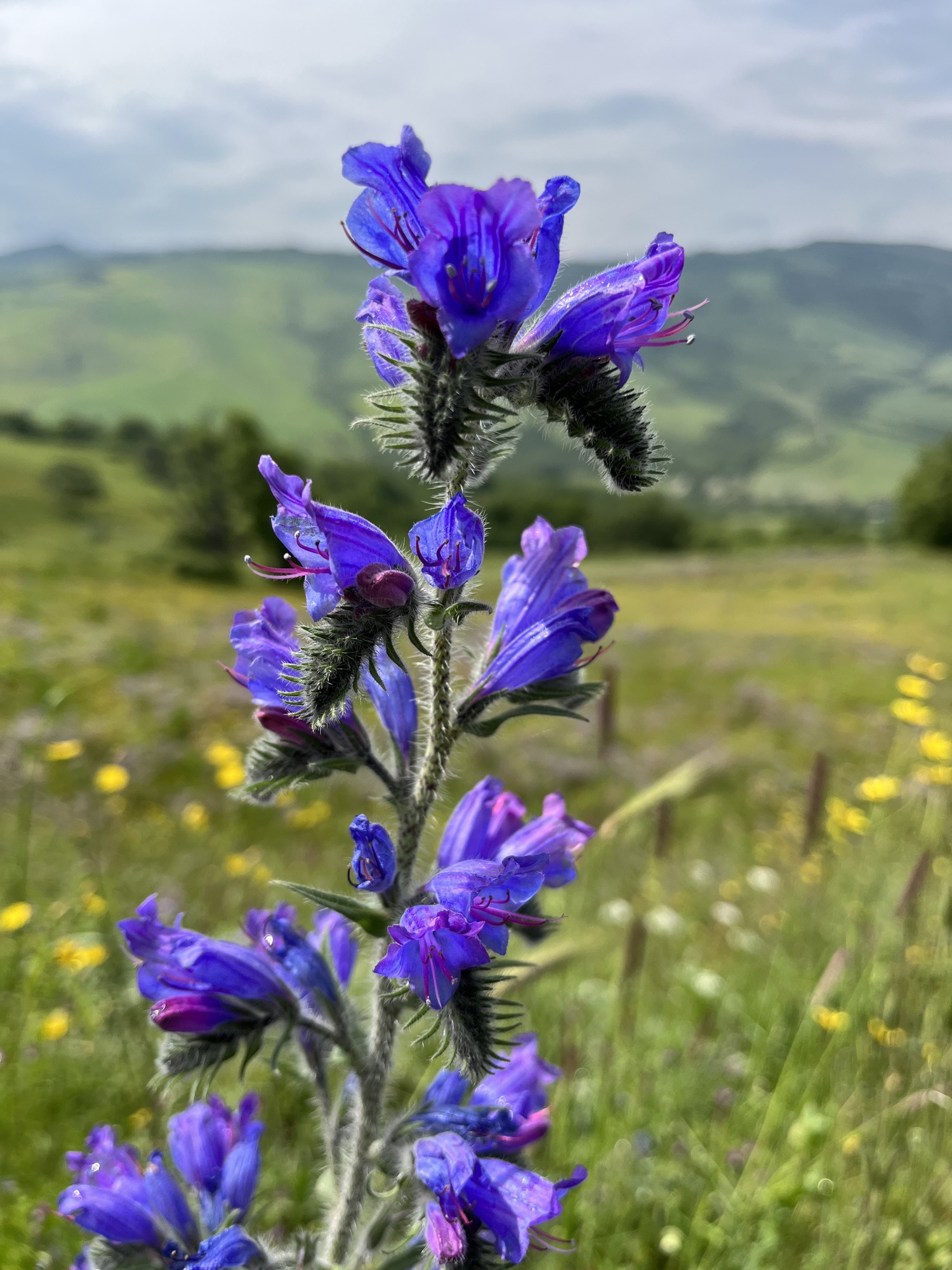 Soon, we were cycling in the the most beautiful countryside and as we made our way uphill, the views became more expansive. It was green in every direction and the roadsides were one huge floral display. Although there is a lot of cloud in this photo, there were blue skies overhead, which brought out the colours today.