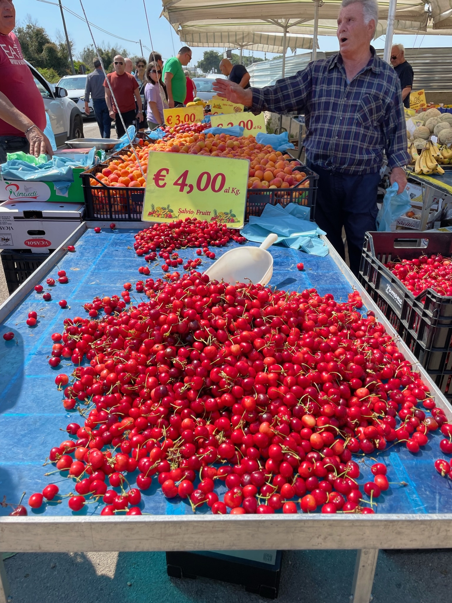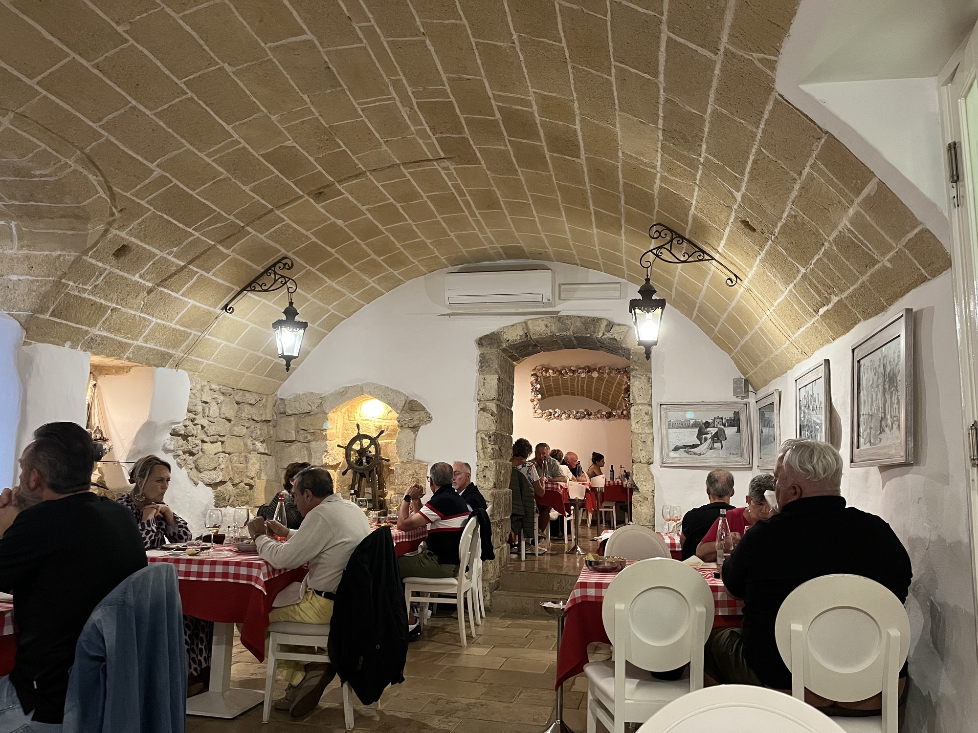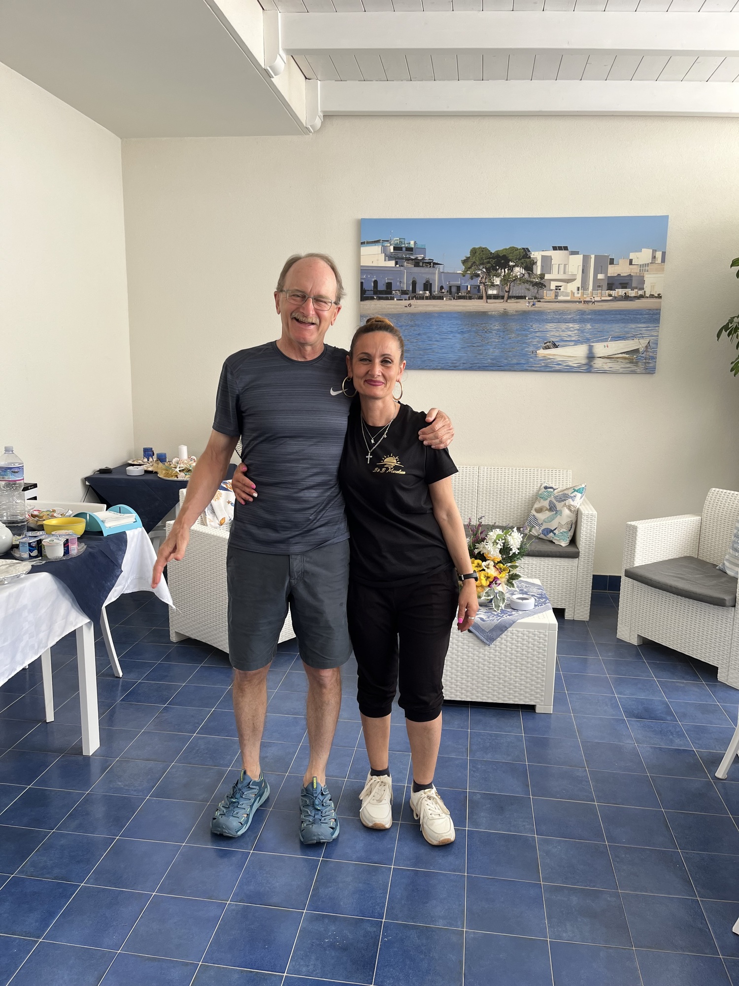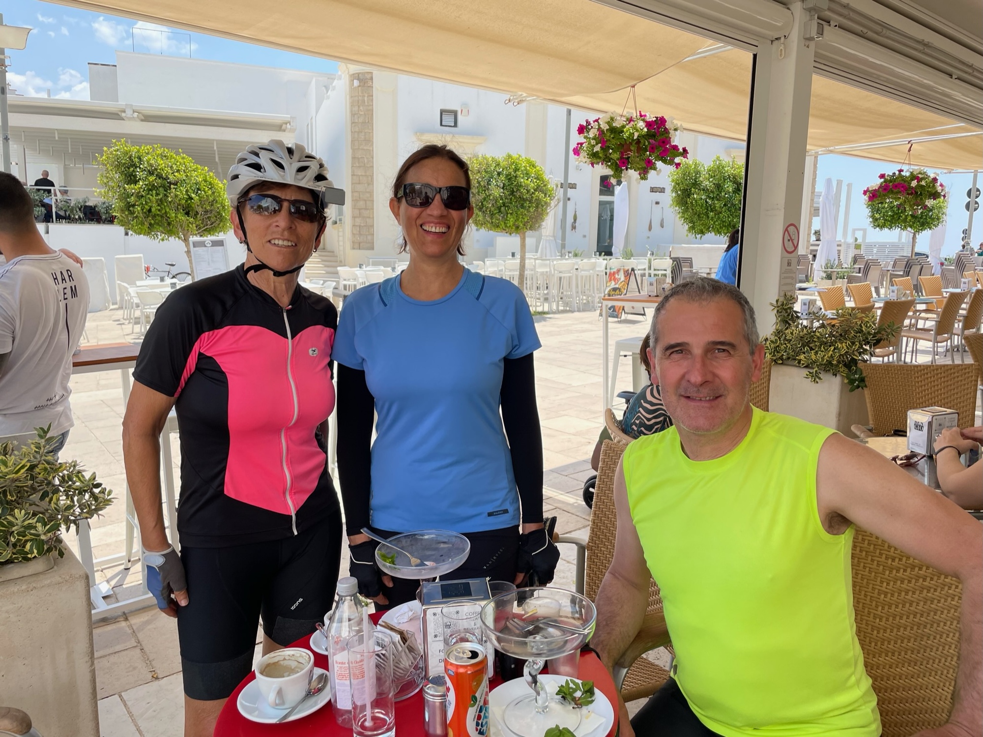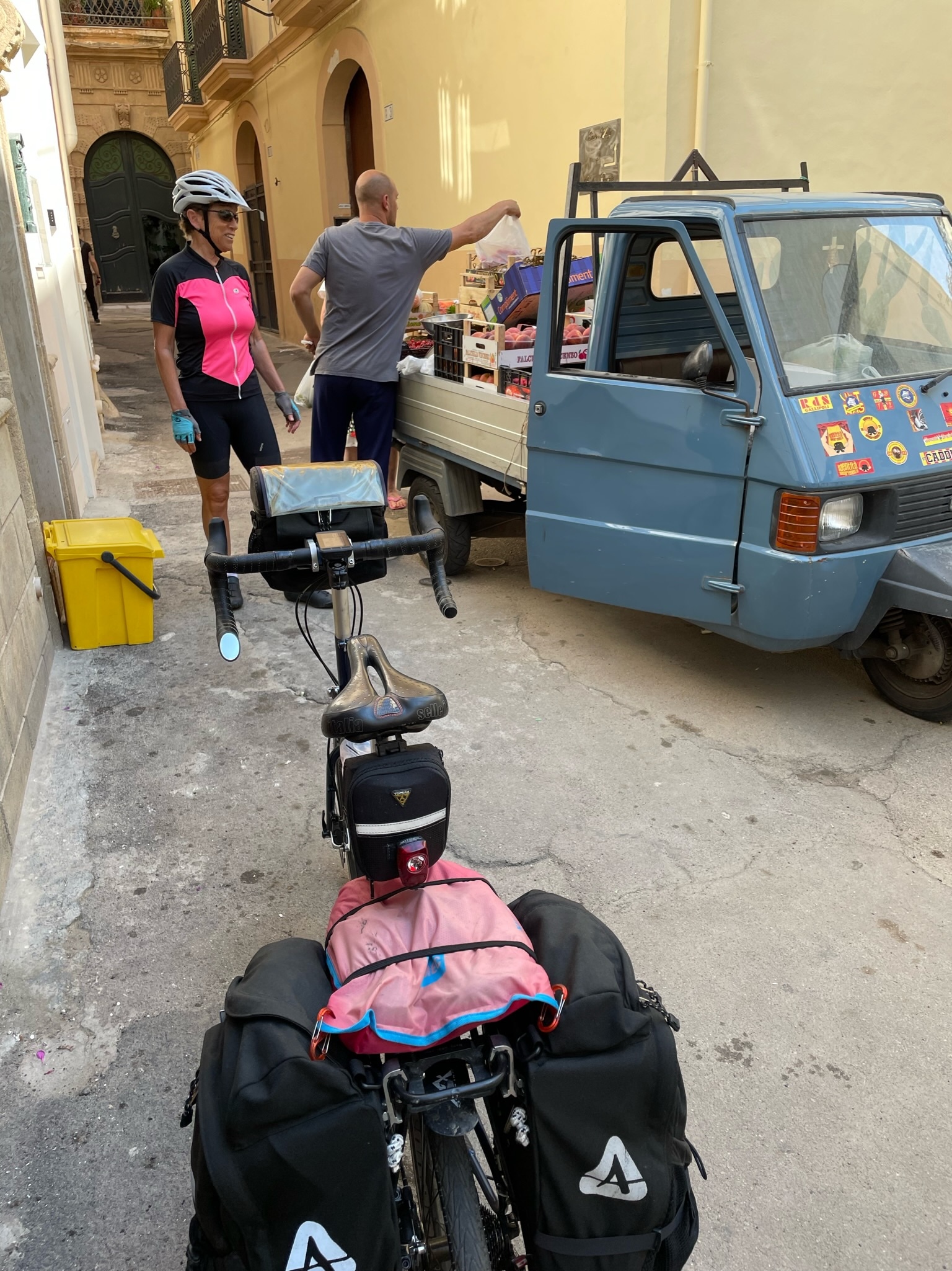 Soon after sitting down, up rode Katrina and Mauro so we invited them to join us. We had a nice chat with them. They had driven their car from Bergamo to Lecce for this one week your of Puglia. Normally they would take the train but the disastrous floods in Emilia-Romagna have taken out the tracks that link to southern Italy and they won’t be repaired for another week or so. This was the third day of their tour.