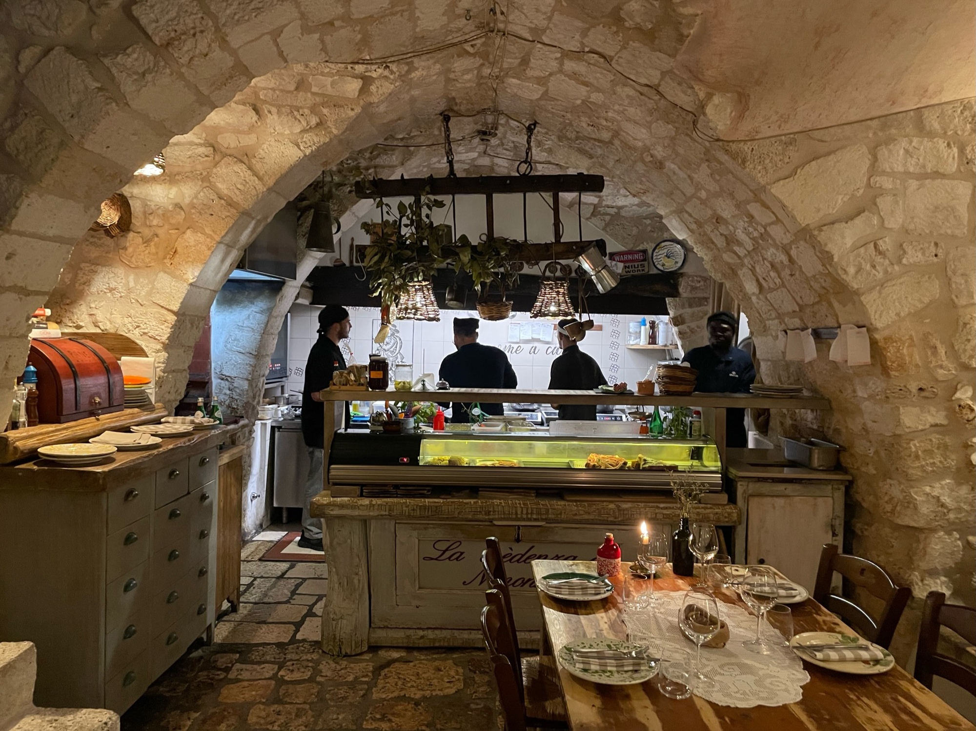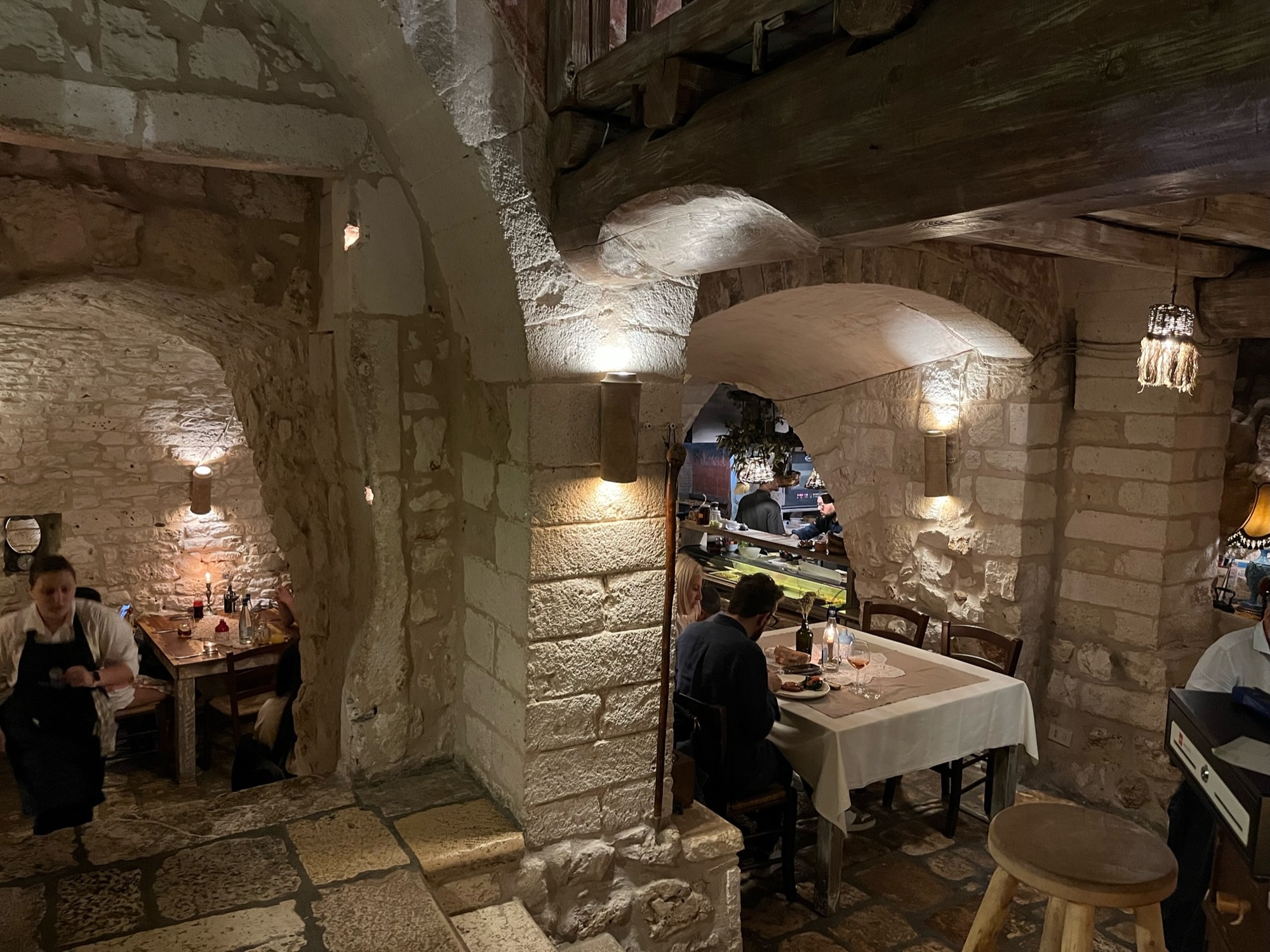 We are almost always first to be seated at dinner. Most often, we are lucky and easily get a table, but now that the tourists are starting to appear, things are changing. Still, we managed to get a table in our chosen restaurant in Ostuni. It was a small restaurant in a multi-level cave.