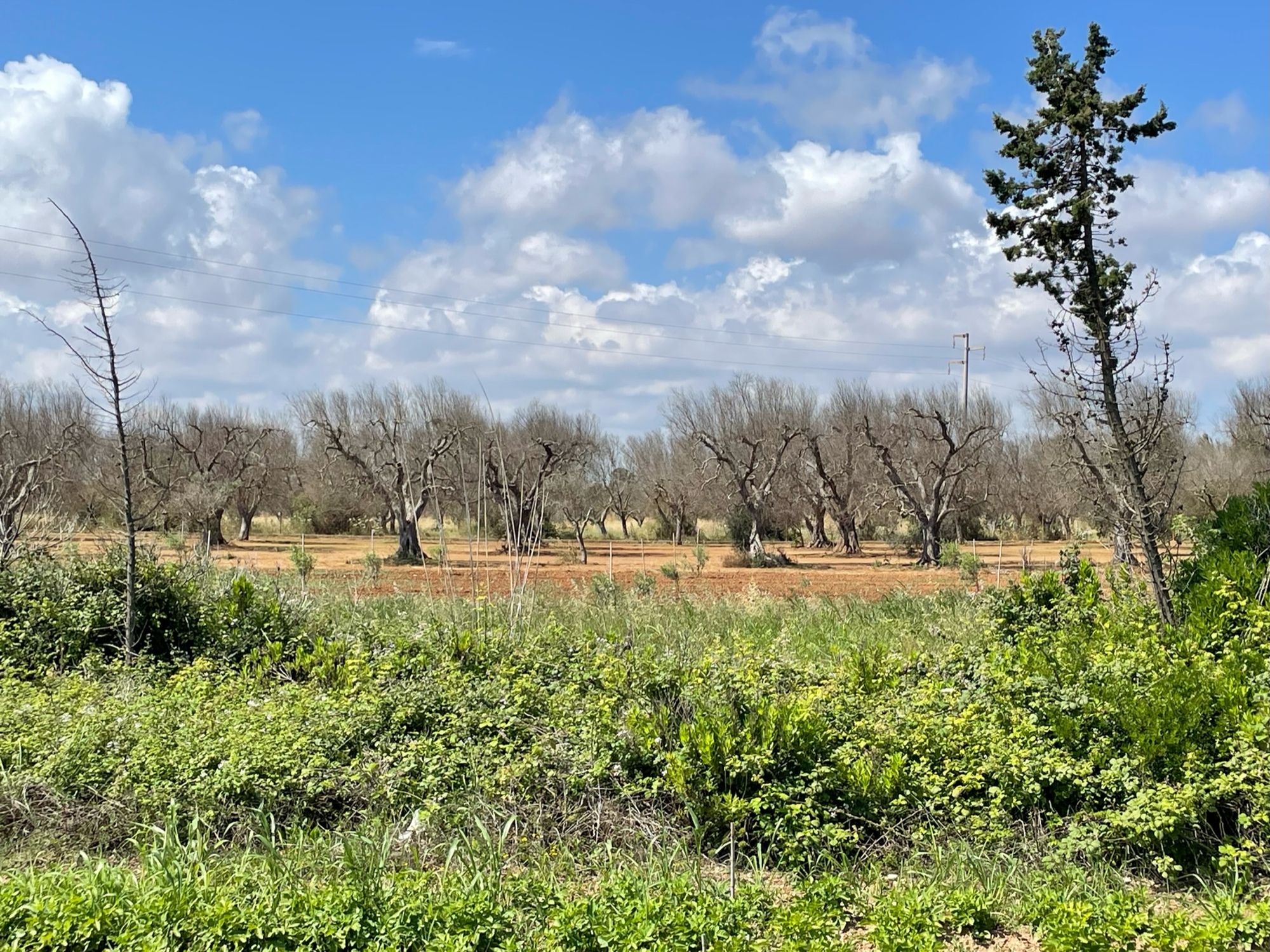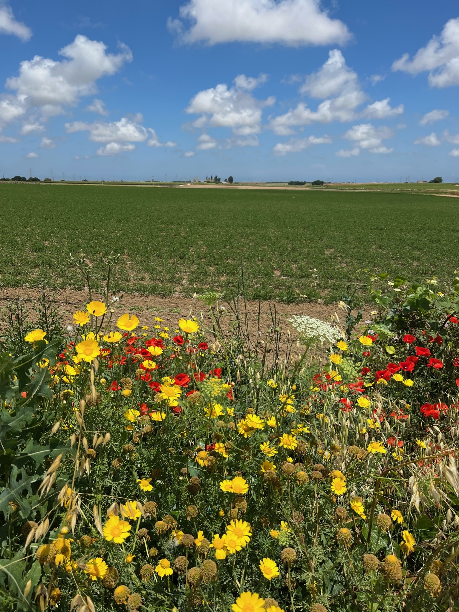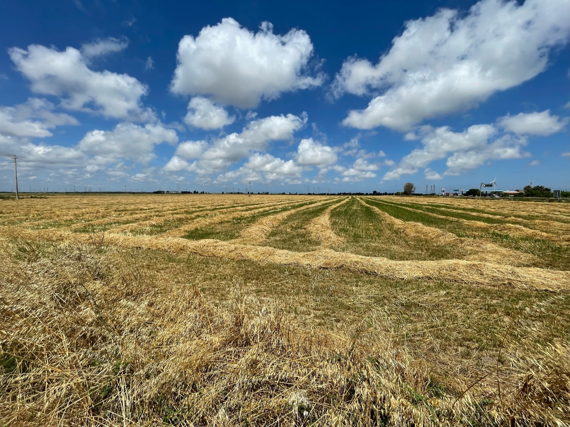 After passing the plant, we headed west and the wind was at our side. This is when the road became as straight as an arrow. It’s our least favourite sort of road and we just gut it out to get it over with. We call it putting the hammer down. And that’s what we did. Not many photos to show but I did notice that the land was cultivated with wheat, oats and sometimes tomatoes, as well as olive orchards. The tomato plants are surprisingly small so it may be that the damp cool weather has had an impact on the planting schedule.