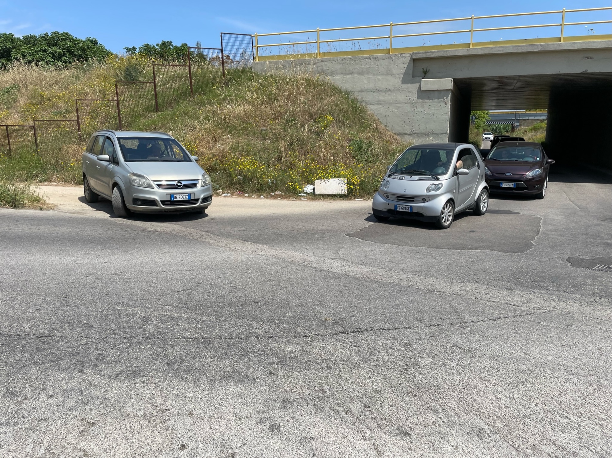 After a couple of minutes of watching traffic, we decided to follow it along a goatpath of a road that passed under the struts of the freeway. It didn't look promising as it narrowed and the thick grasses encroached on the roadway, but we pushed on. The traffic came to a bottleneck when the road went under yet another bridge and took a sharp right uphill turn. Cars and trucks were u-turning and entering and exiting an even smaller footpath. It was mayhem and that told us we were onto something. When two recreational cyclists whizzed past, we stopped checking the map and followed the flow.