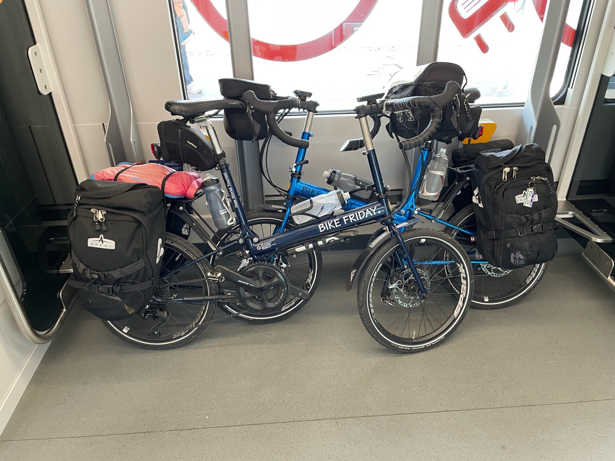Meanwhile, I spotted a car with a huge bicycle sign on it. I told David I was headed that way and grabbed my loaded bike. No elevators here, so I heaved it under my armpit and ran down the stairs, across to bin 3 and then up the stairs to the platform with 3 minutes to spare. I shouted to David to follow me as I ran up to the conductor and explained we were unable to buy tickets from the machine. No problem he said, get on board. David emerged onto the platform just in time and we both jumped on board. Whew! It was a nice modern train and there was plenty of space for the bikes. We paid for the tickets when the conductor came by.