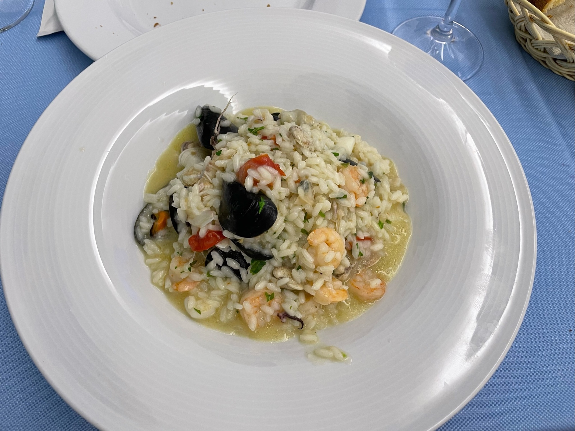 Dinner tonight was at a traditional old style family restaurant. Our server was old school and loved his job and the food and wine he served. He had not a lick of English so everything was with gestures. I hadn’t tried risotto yet and really wanted to see how it should be cooked. It was delicious and, like their pasta, the rice was slightly al dente.