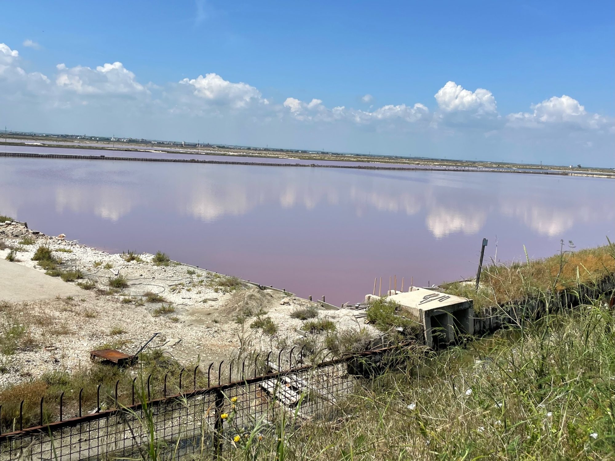 Leaving Margherita di Savoie, we entered an area with natural salt pans, the largest in Europe. We saw huge salt piles, but sadly there was no activity. In fact, the huge conveyer belt above the mountains of salt had collapsed and there it sat. It seemed like such a loss to waste all that work harvesting the salt. Maybe one day, someone will pick up where the work left off.