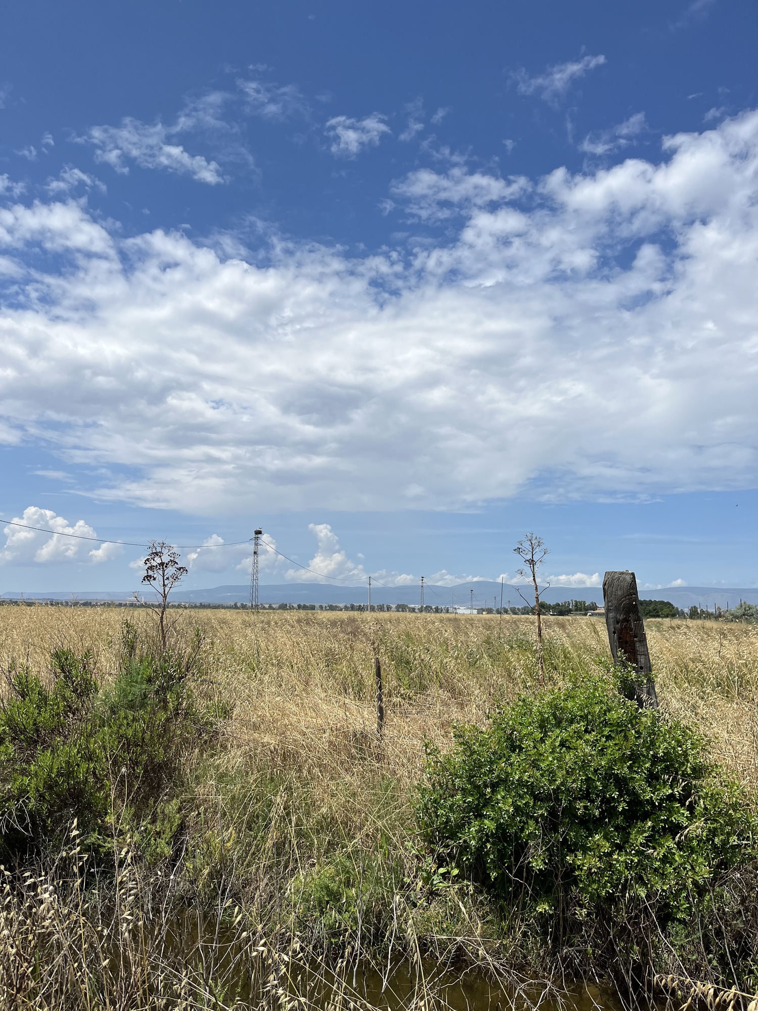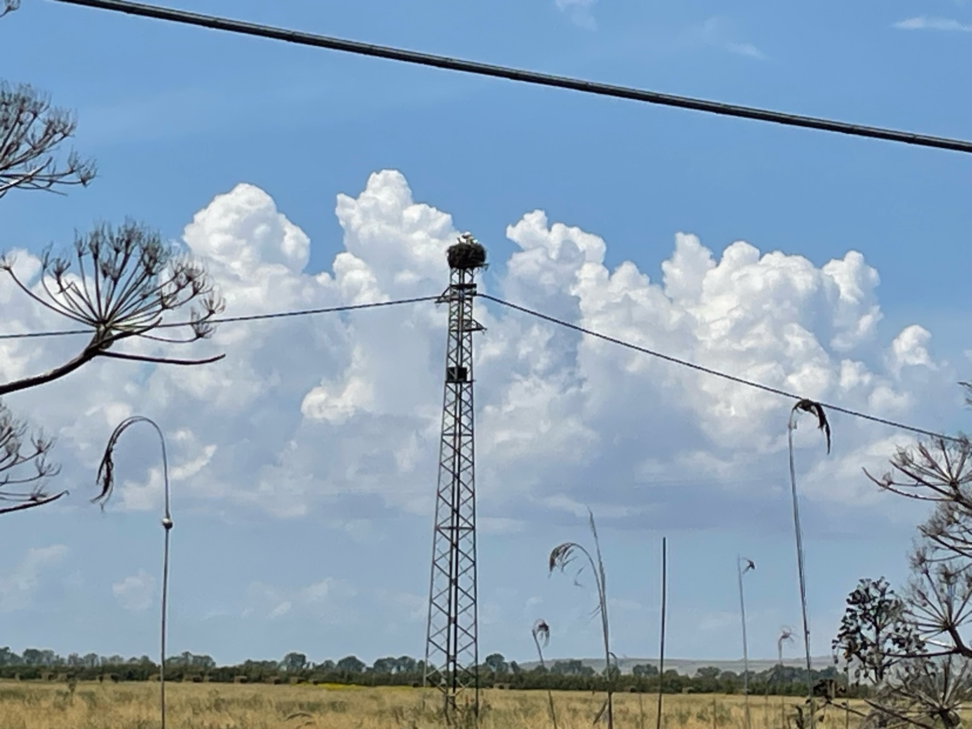 Eventually the salt pans ended, the fields were cultivated with grains and the bird life changed. Now, we saw storks on their huge nests atop the power poles. It’s hard to see, but the closest nest had 3 chicks in it.