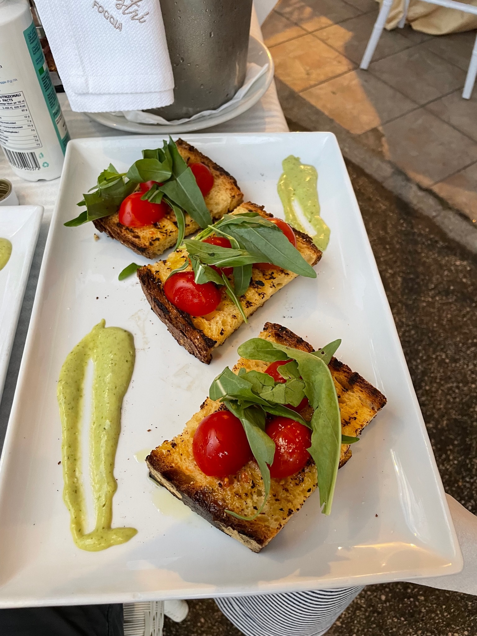 We ate several slices and then our bruschettas arrived. They were made with the same pane di Altamura. What were we to do, but continue noshing on this incredible bread? It felt disrespectful to leave any behind, but we met our match with two slices remaining. Then, it was on to the bruschettas.