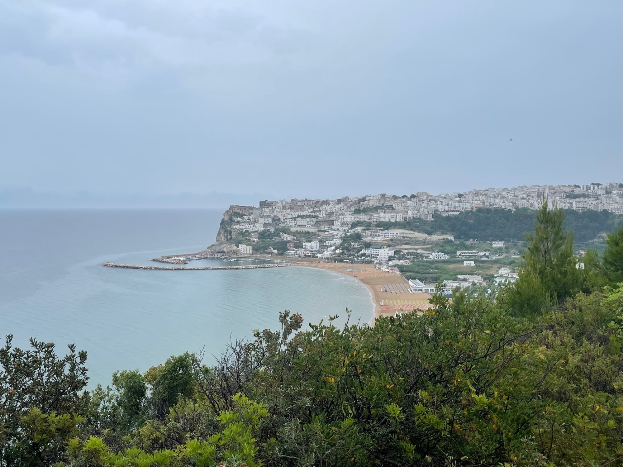 The beachy coastline of the Gargano was visible from this final hill and in the distance we could just make out Rodi Garganico. The rain had lightened up by the time we pushed off from the Monte Pucci summit for the final descent to the train station.