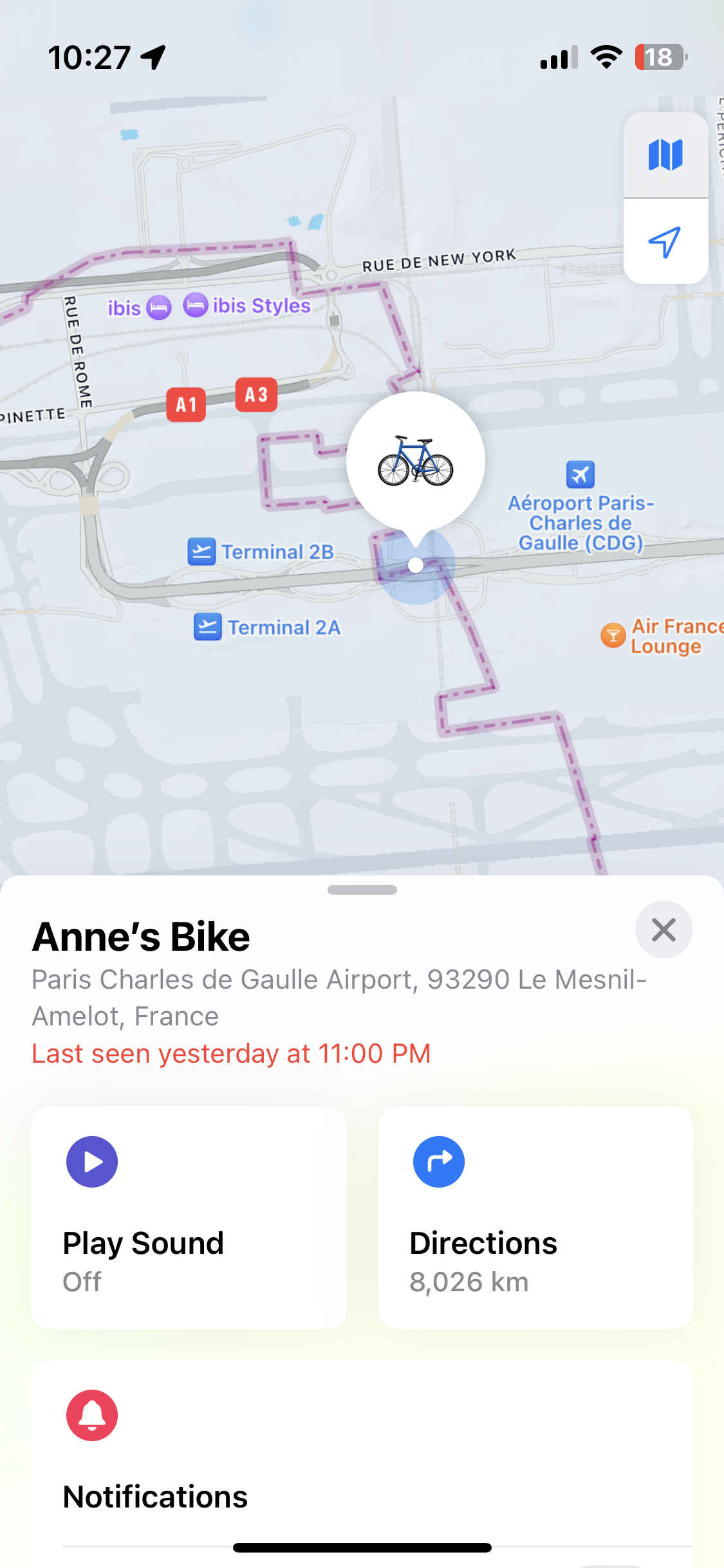After a half hour, we noticed there were still plenty of other Air France passengers waiting for their bags, so we kept hoping our bikes would arrive. But, when we noticed the same bags going past us time and again, we checked our airtags. Mine showed that my Bike Friday was at CDG, while David’s was in-communicado.