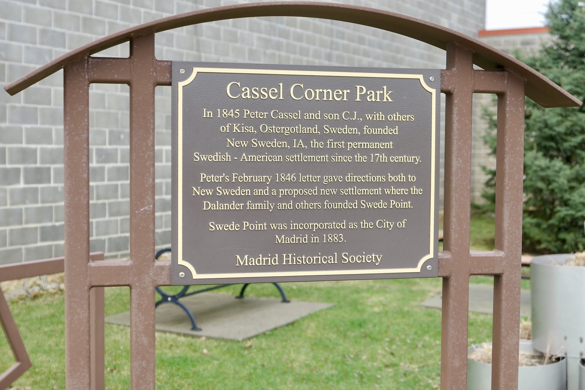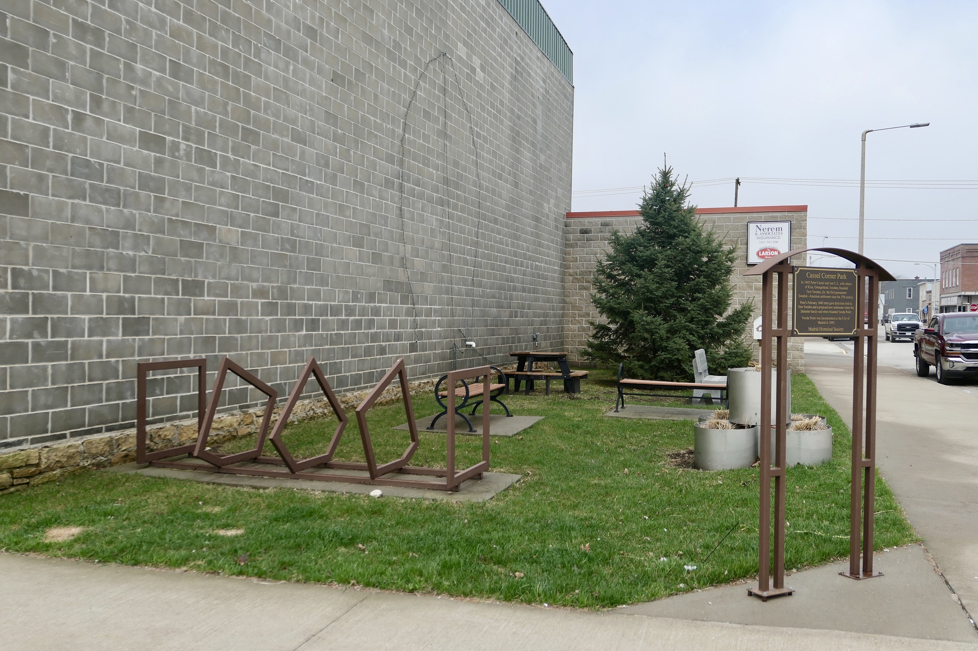 The postage-stamp Cassel Corner Park in downtown Madrid celebrates the original Swedish settlers. The bike rack, like the signs along the trail, evokes the steel cribbings of the High Trestle Bridge