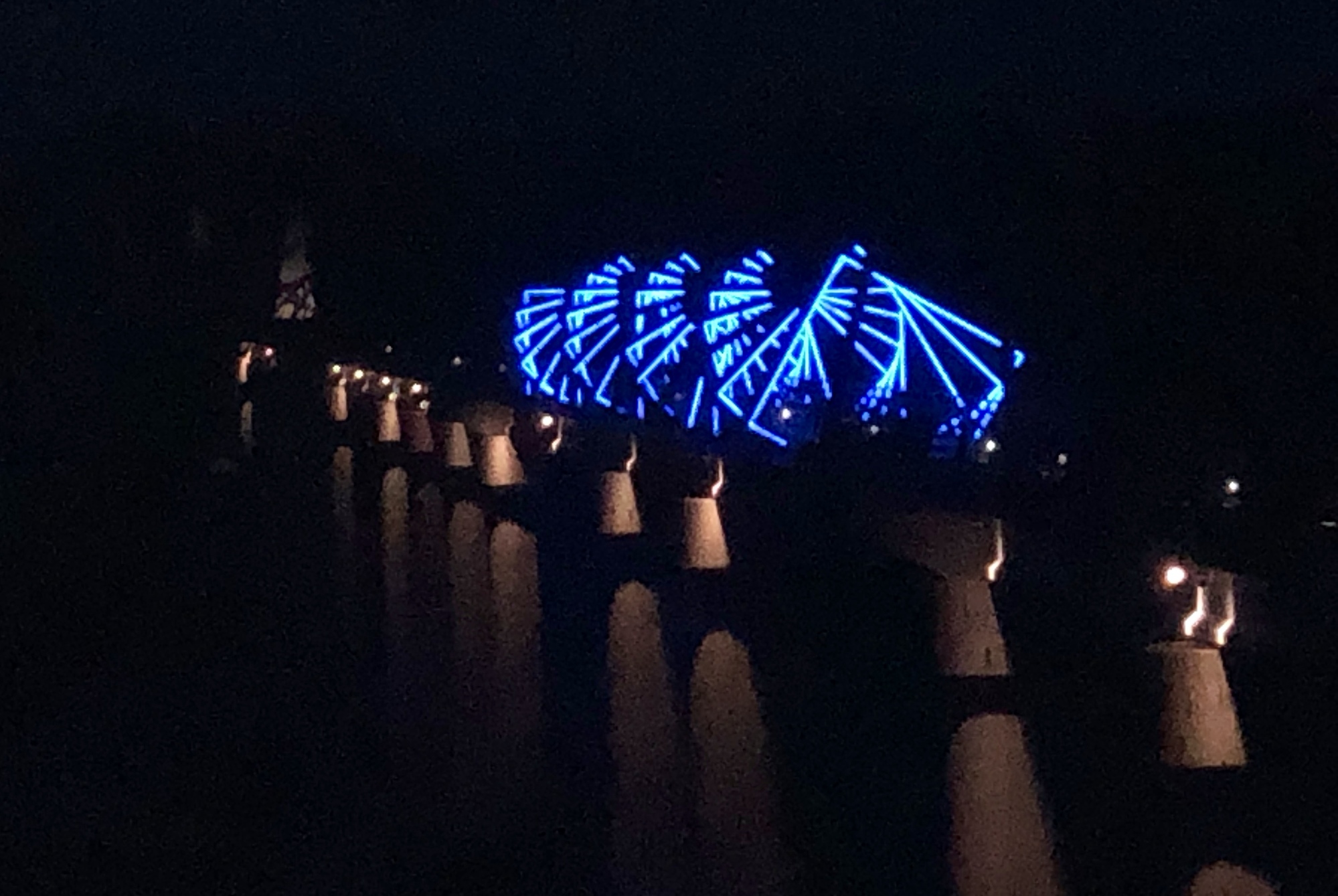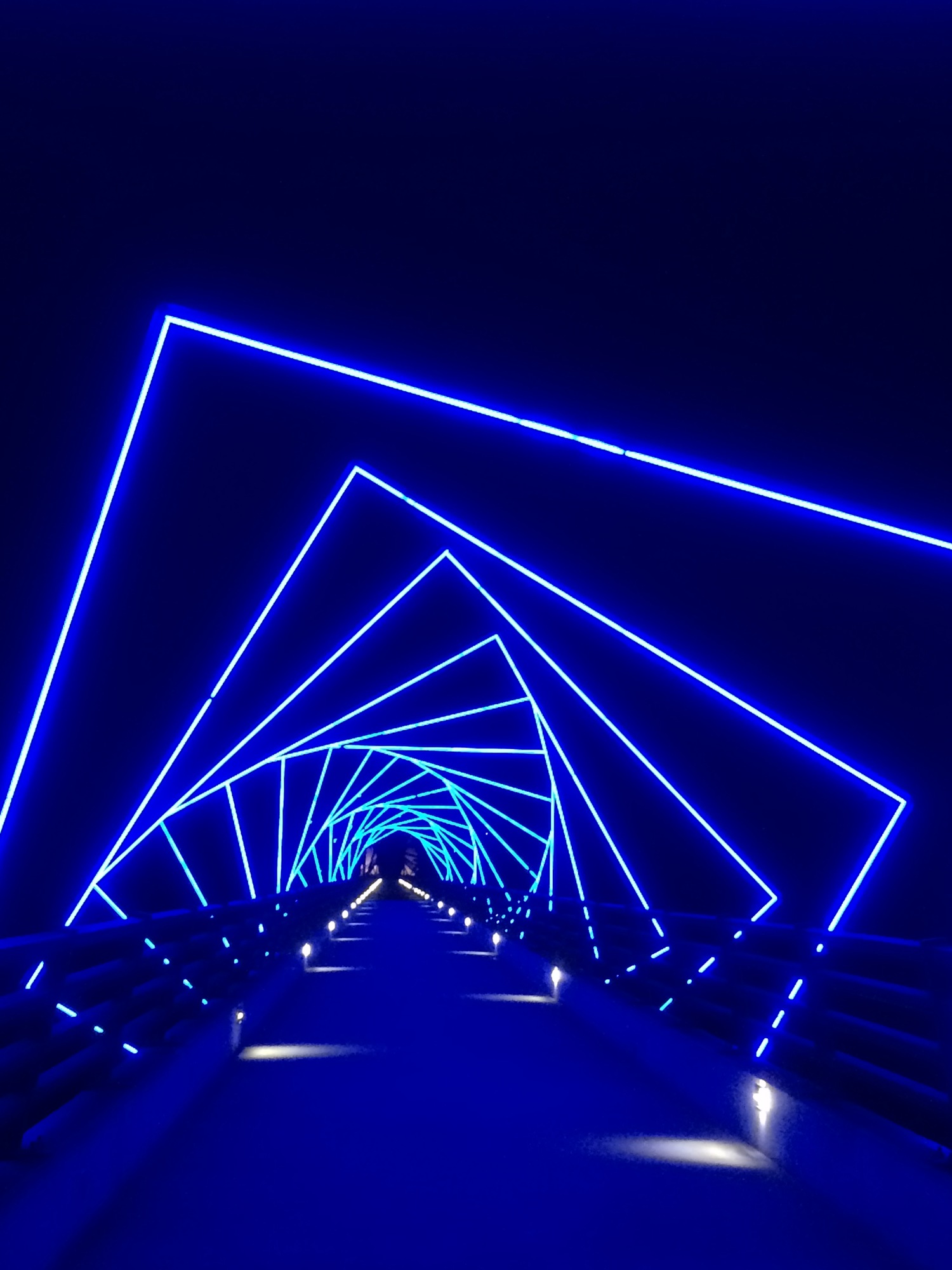 Iowa has almost 300 bike trails, totaling more than 2,400 miles. The crown jewel in this system is the 26 mile long High Trestle Trail, highlighted by the High Trestle Bridge, a half-mile span thirteen stories above the Des Moines River. The Bridge boasts an award-winning art installation, From Here to There, that evokes the coal-mining history of the region. As you pass through the 130-foot tall columnar portals at each end of the bridge, diamond-shaped steel cribbings radiate above in a changing geometry meant to evoke the sensation of traveling down a mine shaft. LED lights line the cribbings over the main river channel, giving the Bridge an even more dramatic appearance at night. Cycling the trail at night – rolling slowly past the portals, above a dark void and into an eerie blue glow - is arguably the most memorable experience of my cycling life.