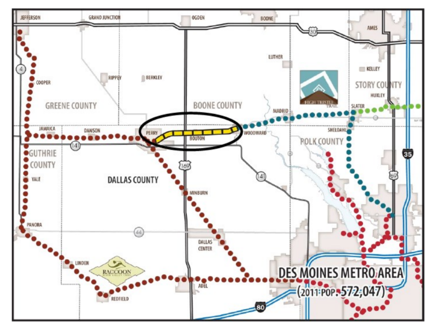 Map showing several trails of the Central Iowa trail network, including the High Trestle Trail (in teal), the Heart of Iowa Trail (green) and the Raccoon River Valley trail (maroon). The yellow Connector Link is circled
