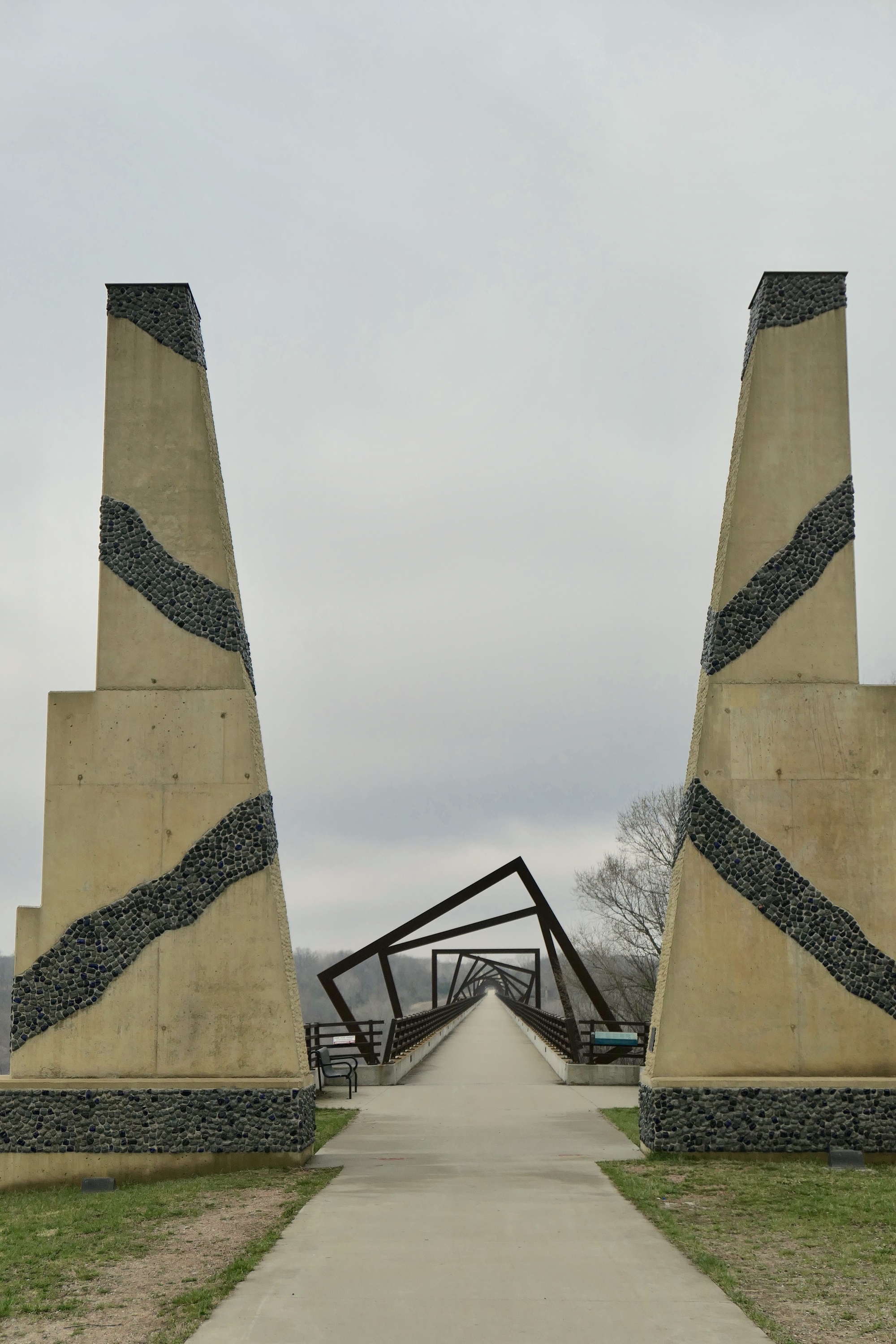 The eastern approach to the bridge. The 130 foot pillars form a gateway to the Bridge and are meant as sculptural symbols of the "cutting and slicing of nature that forms this river valley". The steel cribbings over the trail appear to rotate, and are meant to evoke the sensation of traveling down a mine shaft as you make you way across the bridge
