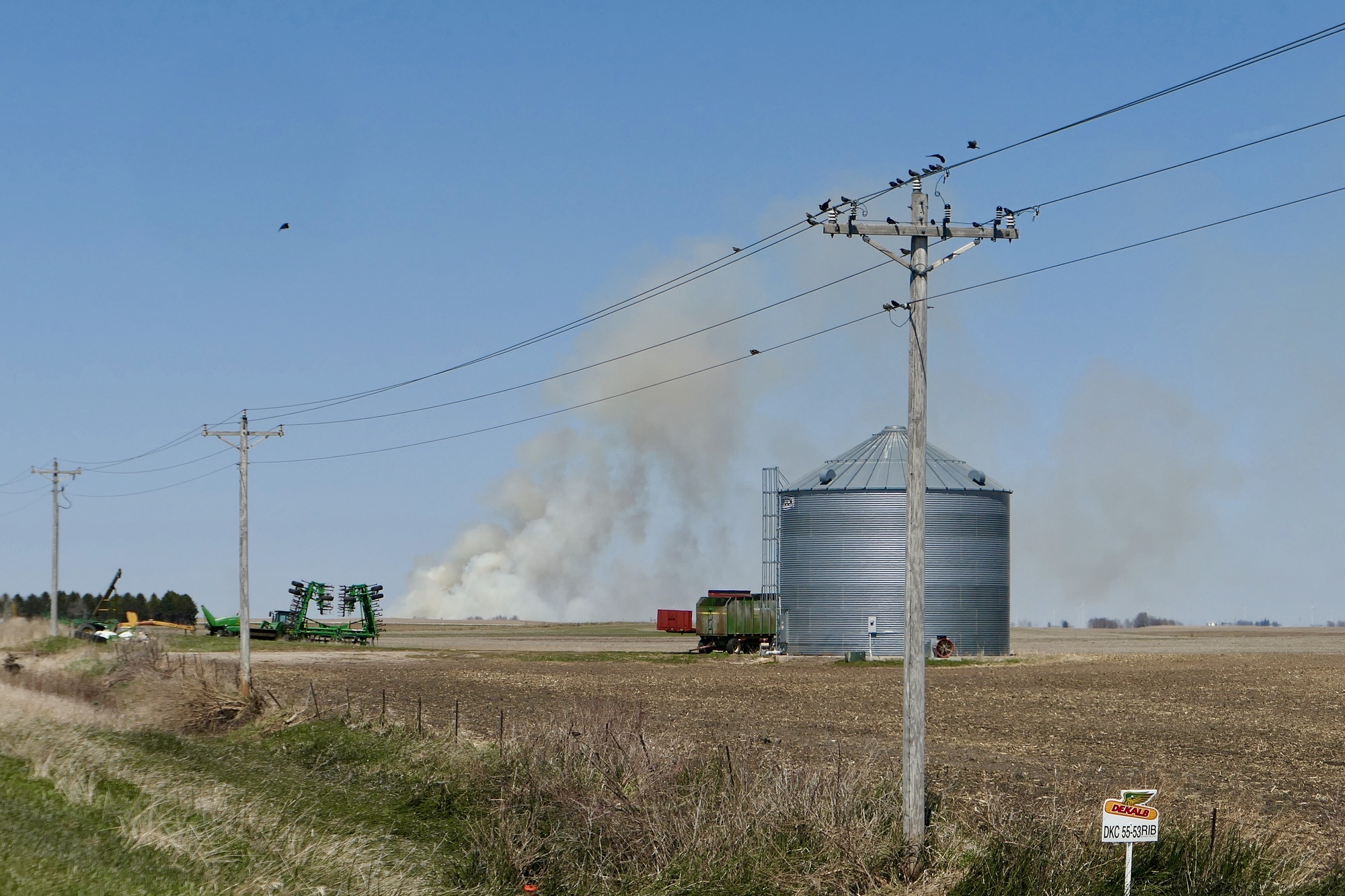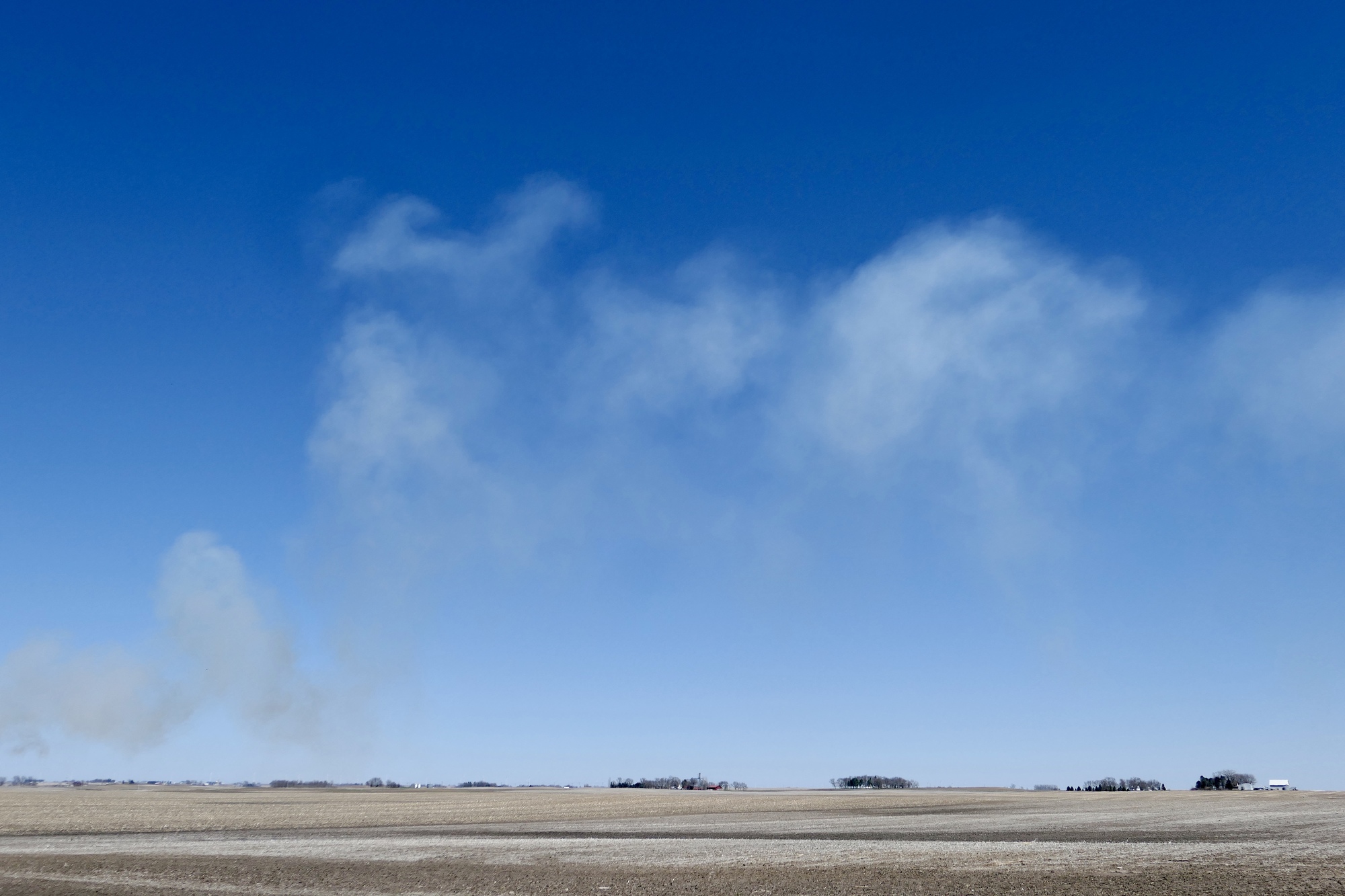 After four miles, I turned north toward Roland on R77, one of the least travelled of the county highways around Ames. I’ve ridden this road many times and always enjoy it. The road passes a number of small family farms, most with signage noting their longevity and/or date of origin. The wind seemed to be increasing but it didn’t prevent me from taking in the views, those nearby and in the distance. I was about three miles from Roland when I noticed a fire up ahead. A plume of black smoke that had been drifting southward suddenly exploded with large billows of white smoke. I couldn’t see flames, but wondered if a “controlled burn” had gotten out of hand. By the time I reached Roland, the only evidence of fire was a faint smell of smoke on the eastern edge of town.