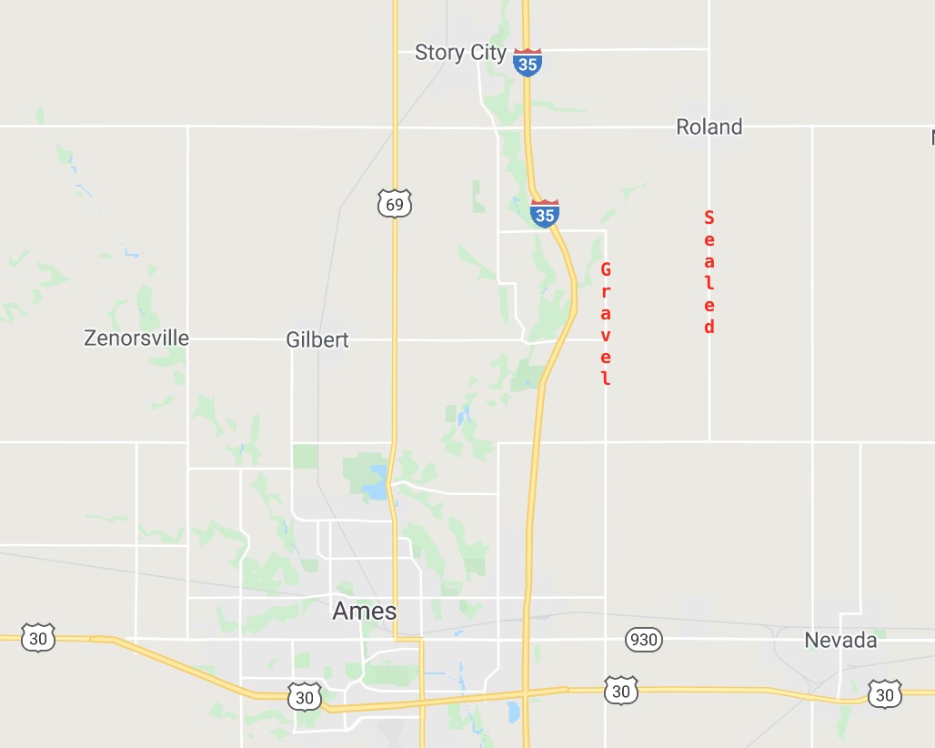 As I’ve mentioned earlier, rural Iowa is largely divided into square mile sections by an amazing network of roads, most of which are gravel. However, some roads, including the county highways, are sealed and provide mile after mile of quiet roadways for cycling. The trick in route planning is knowing which roads are gravel and which are sealed. And, as I learned today, the thickness of the map line is not always predictive of the road surface.