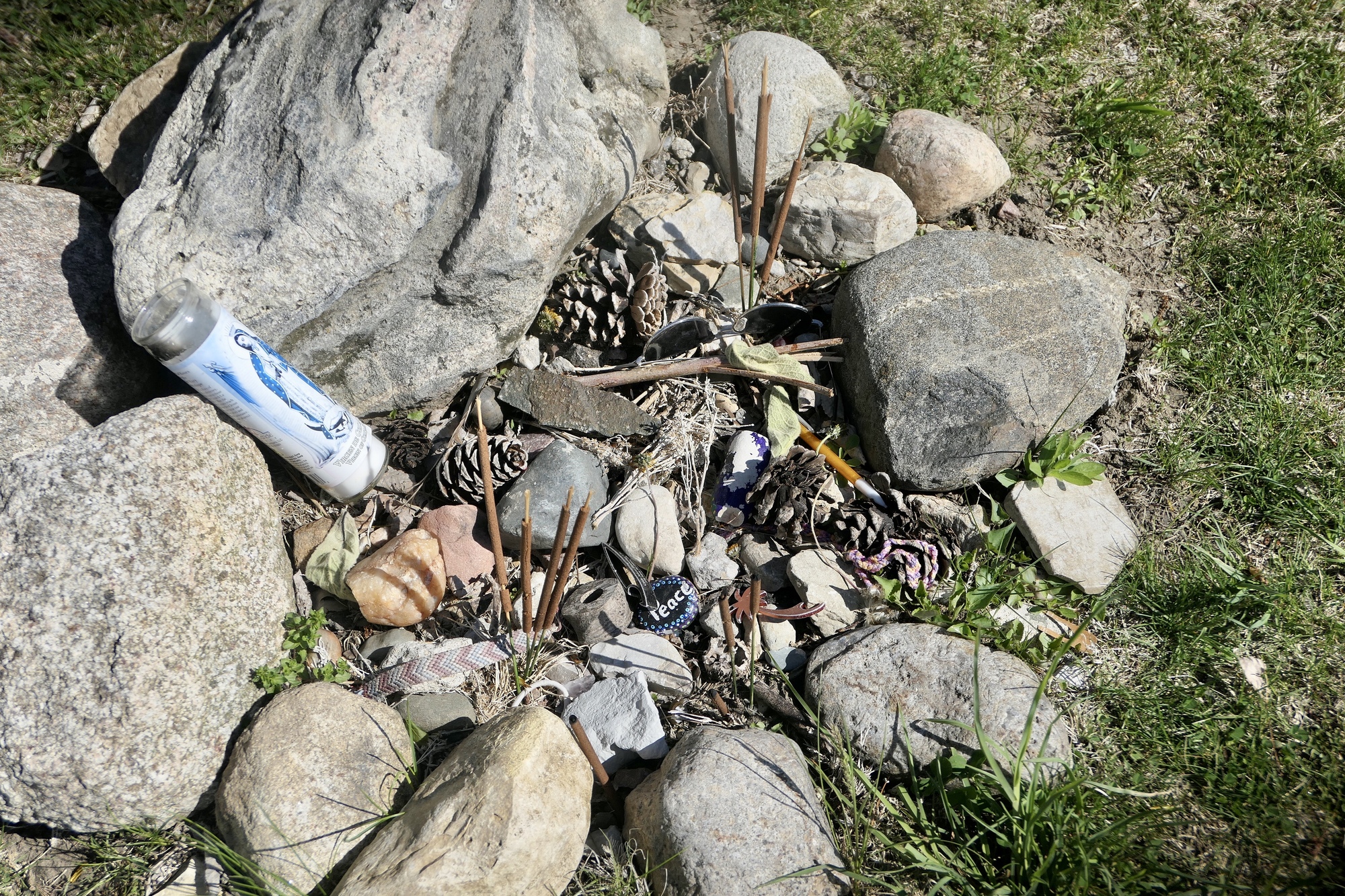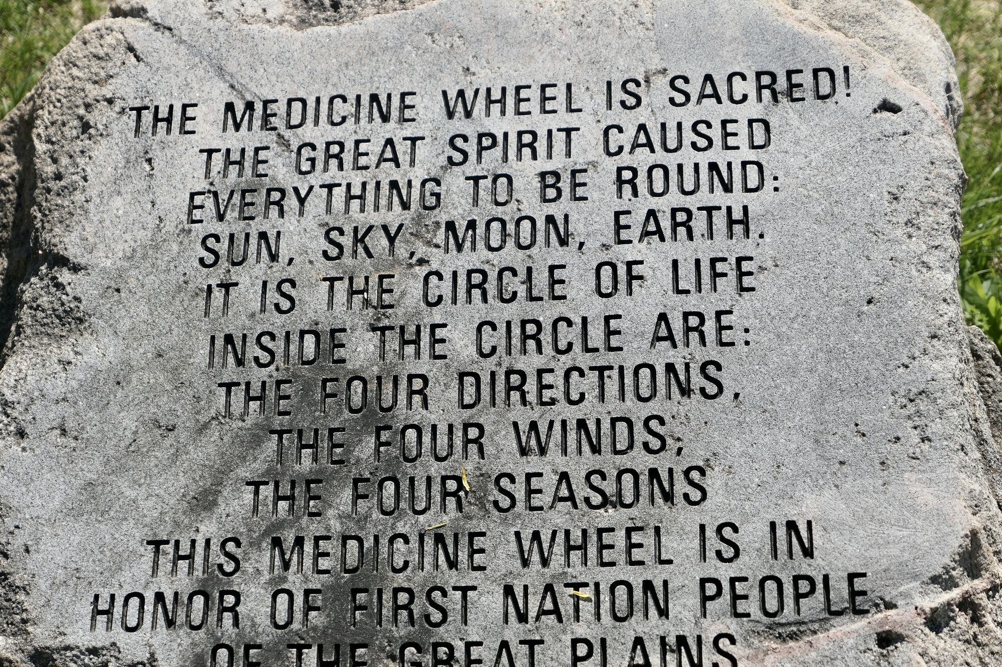 I headed north through the Ada Hayden Heritage Park, taking the upper gravel trail and stopping at the Medicine Wheel, which was constructed to honor the First Nation people the Great Plains. This wheel lacks the spokes that are common in most Medicine Wheels, but does include a central stone cairn and colored flags denoting the four cardinal directions. Joining me at the wheel was a very well-behaved Brittany Spaniel – whose human sister was somewhere in the woods taking a nature break.