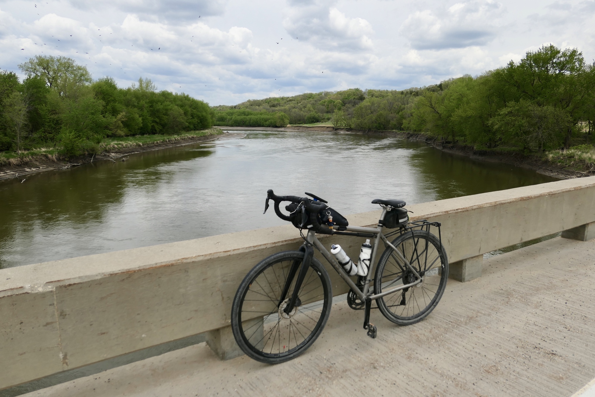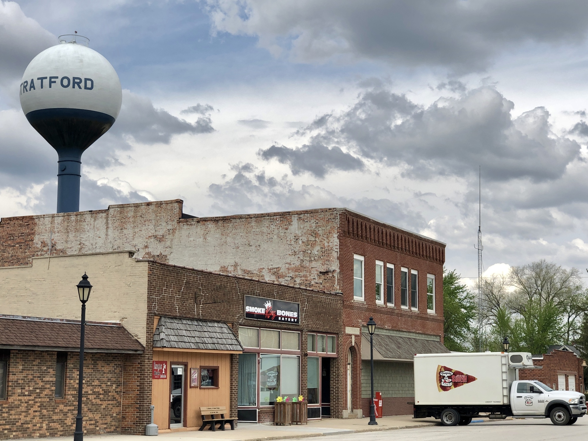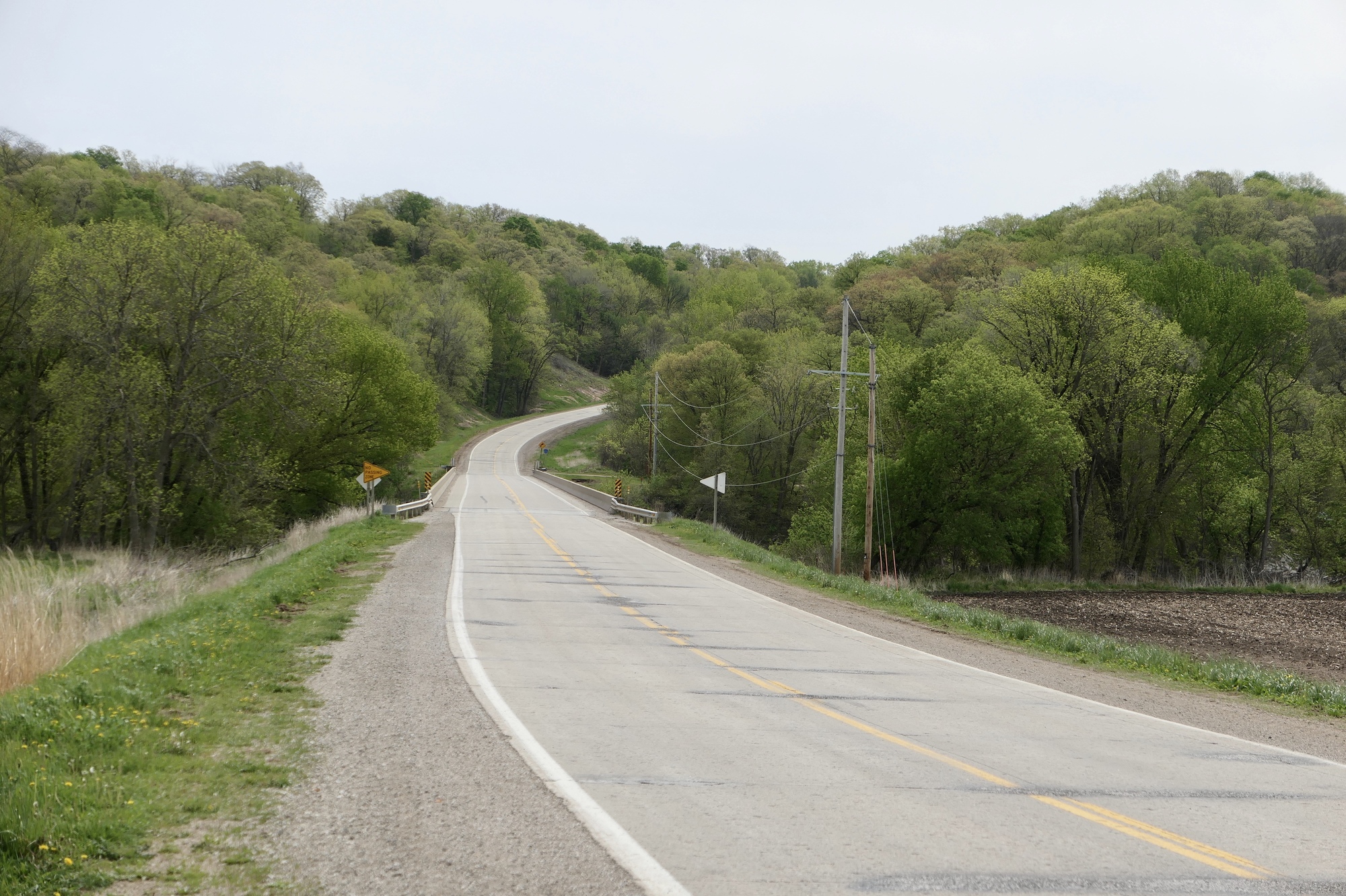 I continued east for another couple of miles and turned north onto R21, also known as Nature Road. A modest uphill climb took me through the unincorporated community of Ridgeport, formerly known as Mineral Ridge. There was a wonderful sweeping descent through rolling fields, and I was back on a quiet flat road, surrounded by farmland. The winds were inching up while the temperature hovered around 60°F, and I was looking forward to a lunch stop in Stratford, a town I fondly remembered from my 2012 RAGBRAI century ride. This town of ~700, named for Stratford-on-Avon, appears to be pretty robust, though there was decidedly less activity than the last time I passed through. The local grocery store was open, but the Smoke King Bones Eatery was closed as were most of the other shops along Shakespeare Ave, the main thoroughfare. I exchanged brief pleasantries with the few locals that passed by as I enjoyed my lunch, then headed out for another dip down to the Des Moines River.