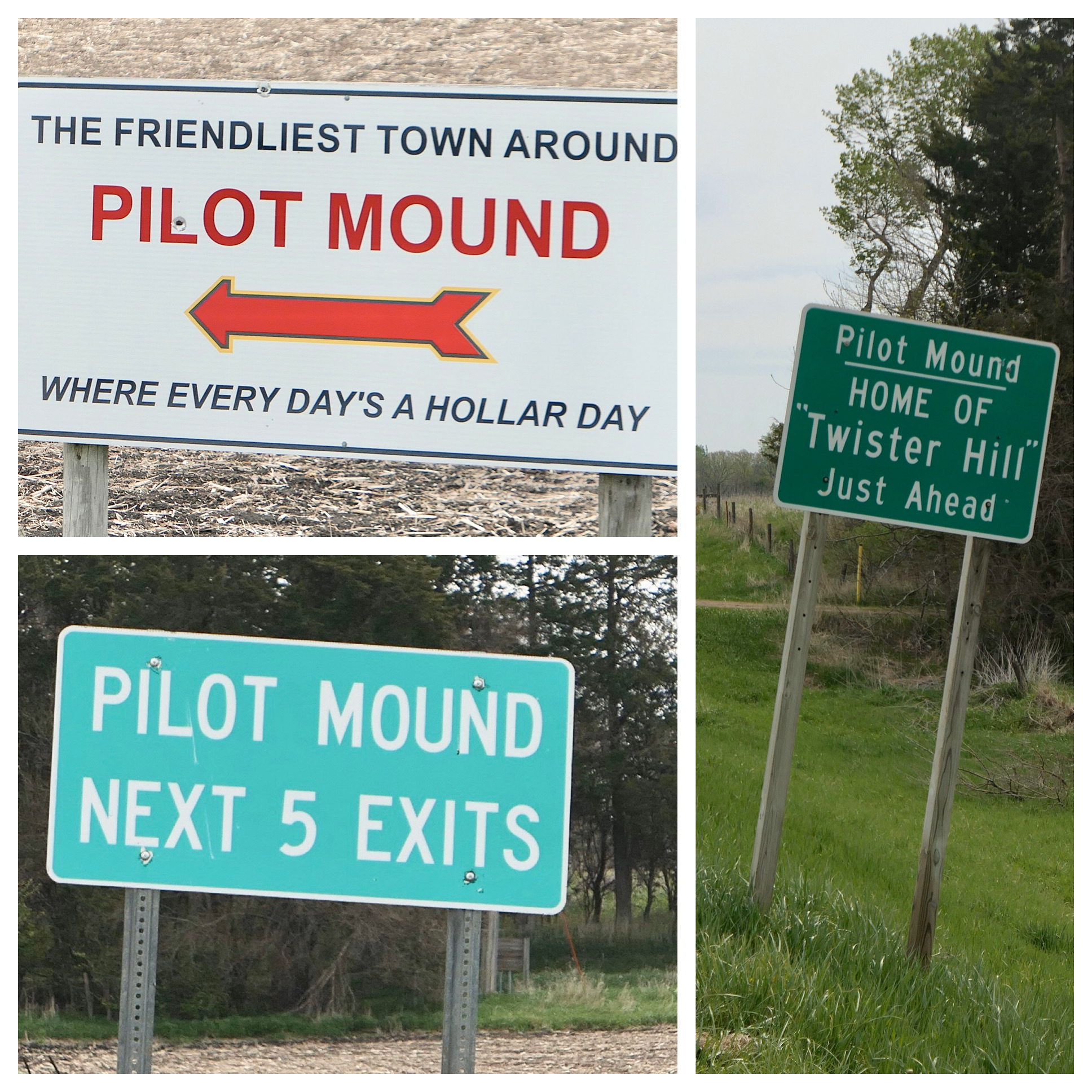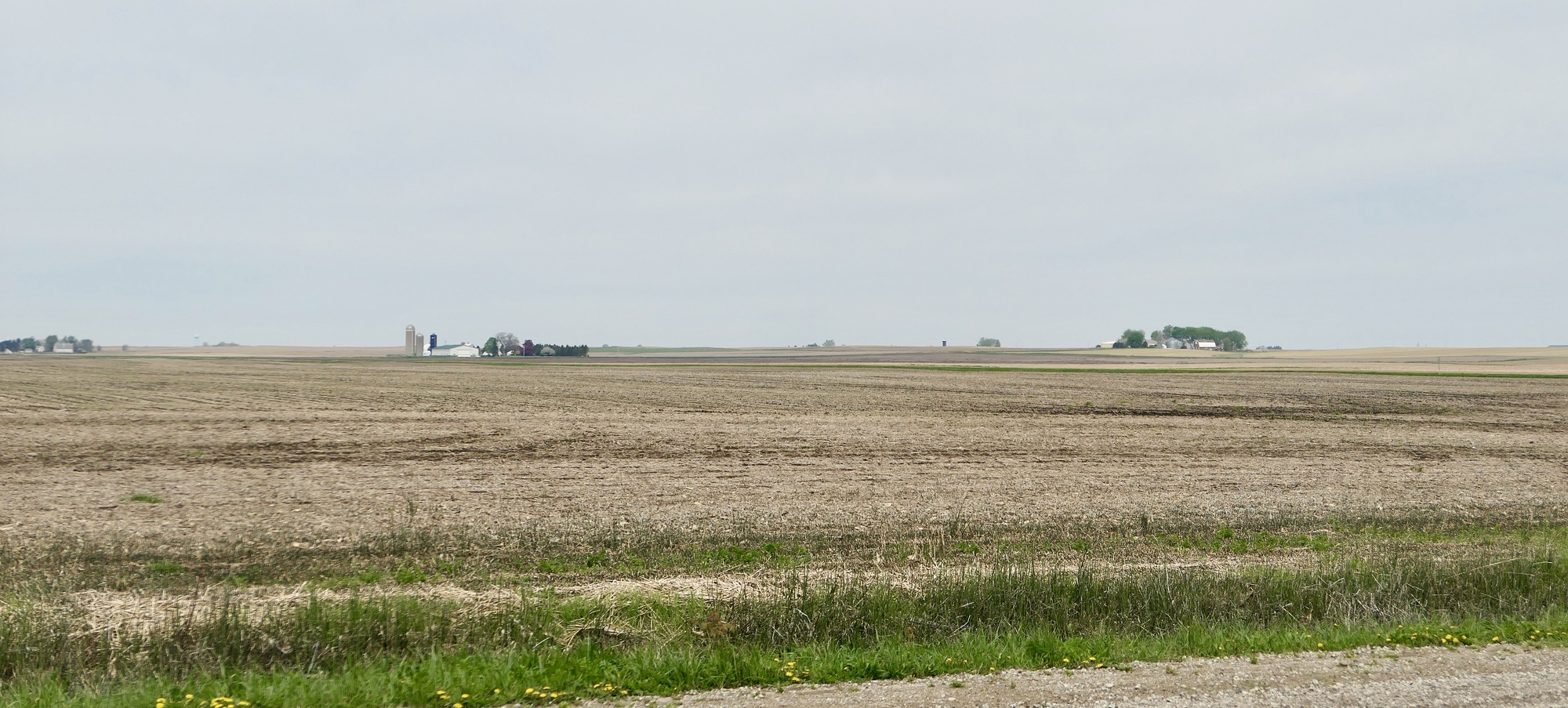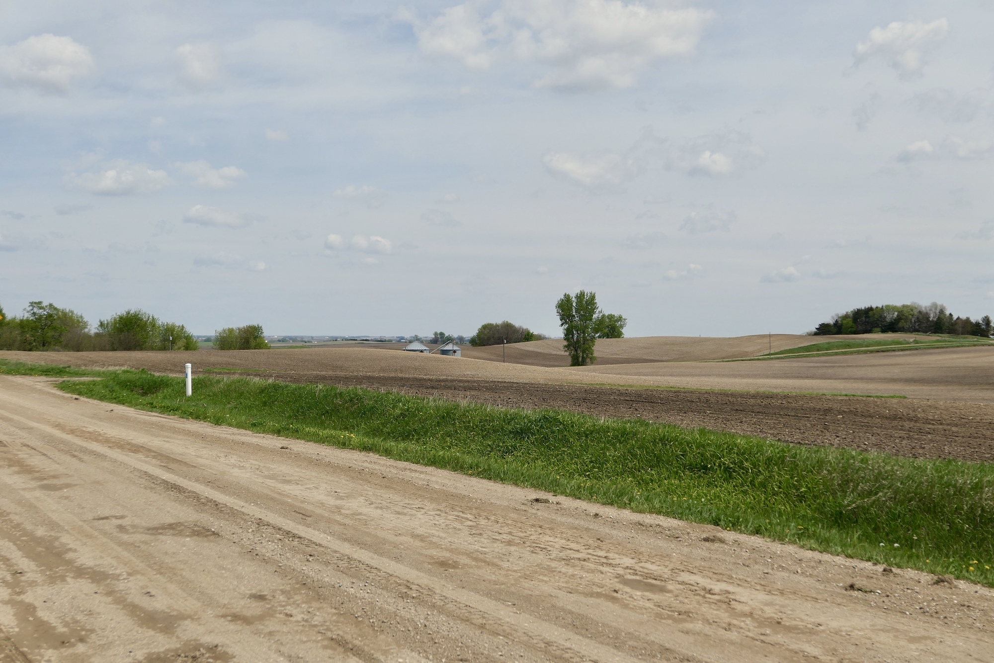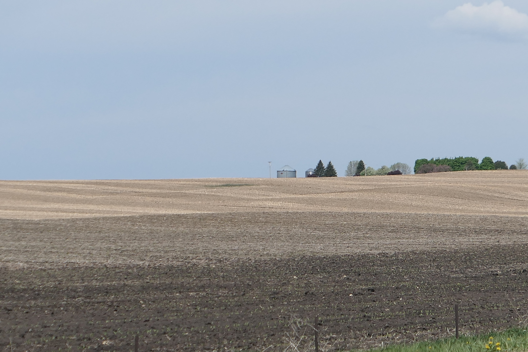 It was a somewhat pleasant riding day - overcast with temperatures around 60°F. Westerly winds were fairly light, but were forecast to pick up as the day wore on. I drove out to Don Williams Recreation Area, about 25 mile WNW of Ames, and headed north along county highway P70. The terrain to the east, toward the river, was mostly pastures dotted with cattle while farm fields stretched out to the west. After four miles, I turned east toward the small town of Pilot Mound and, as the signs indicated, Twister Hill. Pilot Mound (pop 170) is a conclave of small residents and empty storefronts just off E18, a primary east-west county highway. The Moundview Motel(?) seems to function more as an apartment complex than as place for visitors. After a quick look-see around town, it was time for Twister Hill. Before I could start my descent however, I had to stop and look at the corn – yes, small sprouts of corn in evenly spaced rows. This corn had been planted early, in the risky shoulder season, but I welcomed the seedlings as another signal of seasonal change and the greening of the Iowa landscape.