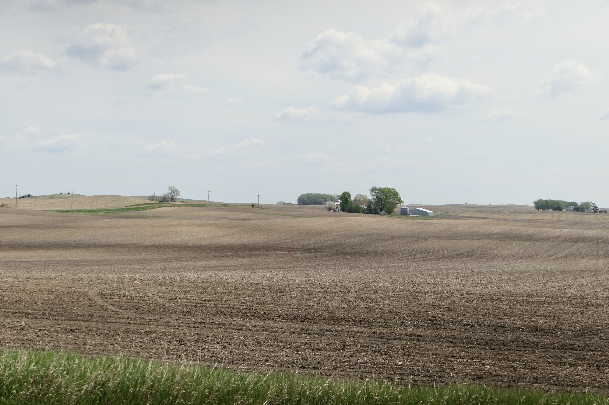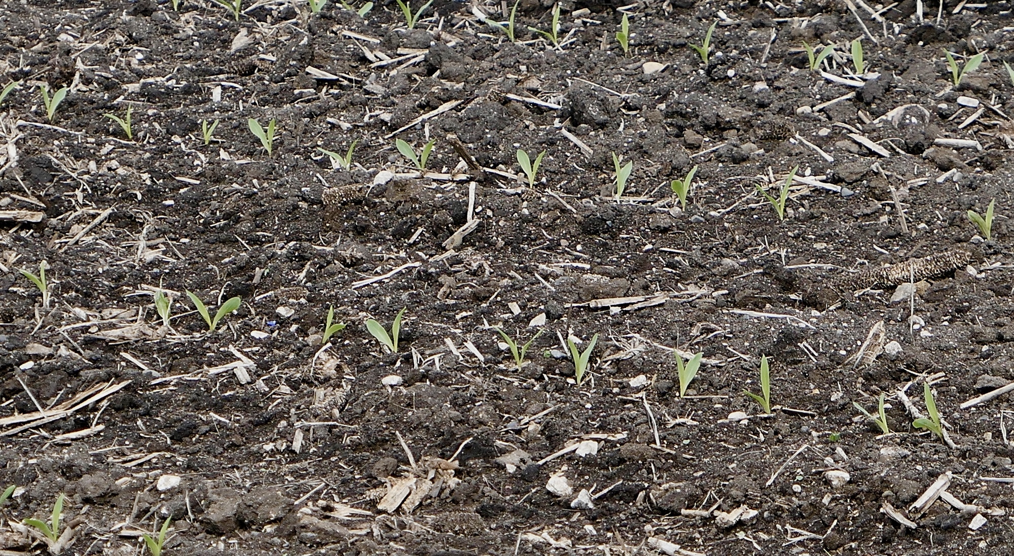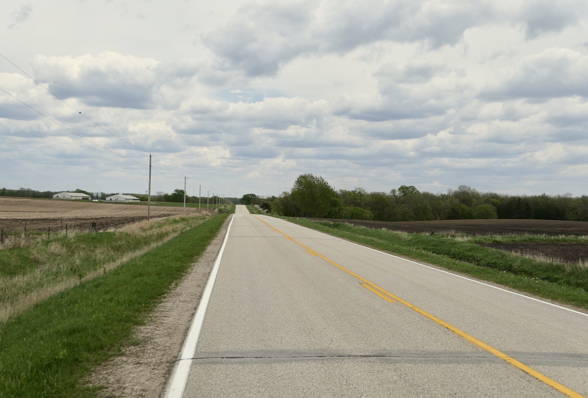 It was a somewhat pleasant riding day - overcast with temperatures around 60°F. Westerly winds were fairly light, but were forecast to pick up as the day wore on. I drove out to Don Williams Recreation Area, about 25 mile WNW of Ames, and headed north along county highway P70. The terrain to the east, toward the river, was mostly pastures dotted with cattle while farm fields stretched out to the west. After four miles, I turned east toward the small town of Pilot Mound and, as the signs indicated, Twister Hill. Pilot Mound (pop 170) is a conclave of small residents and empty storefronts just off E18, a primary east-west county highway. The Moundview Motel(?) seems to function more as an apartment complex than as place for visitors. After a quick look-see around town, it was time for Twister Hill. Before I could start my descent however, I had to stop and look at the corn – yes, small sprouts of corn in evenly spaced rows. This corn had been planted early, in the risky shoulder season, but I welcomed the seedlings as another signal of seasonal change and the greening of the Iowa landscape.
