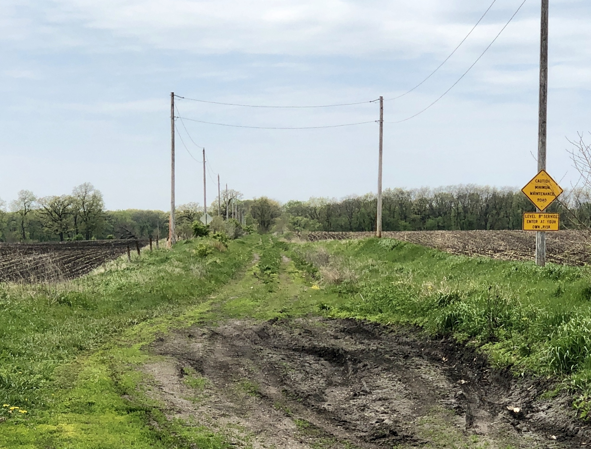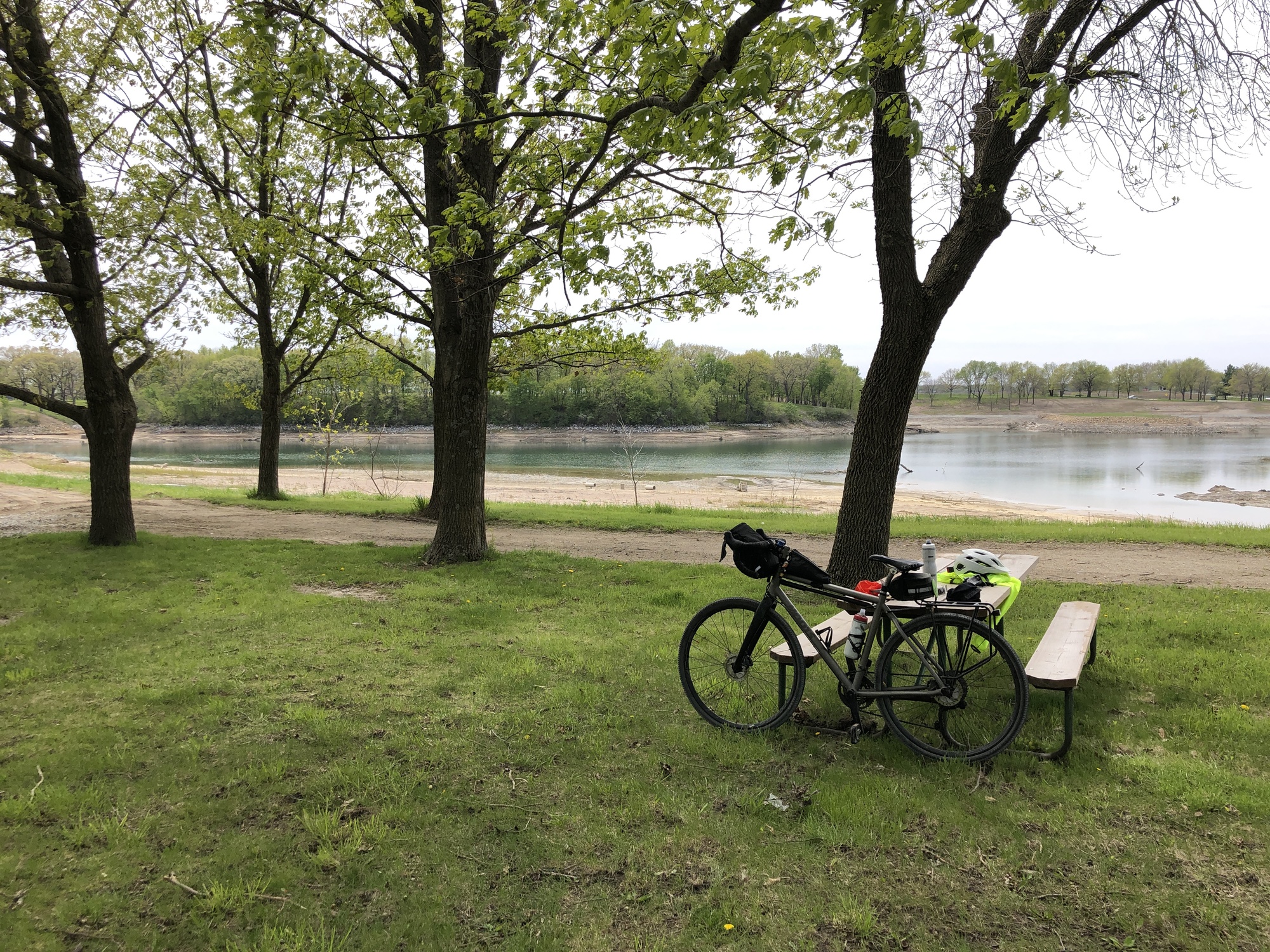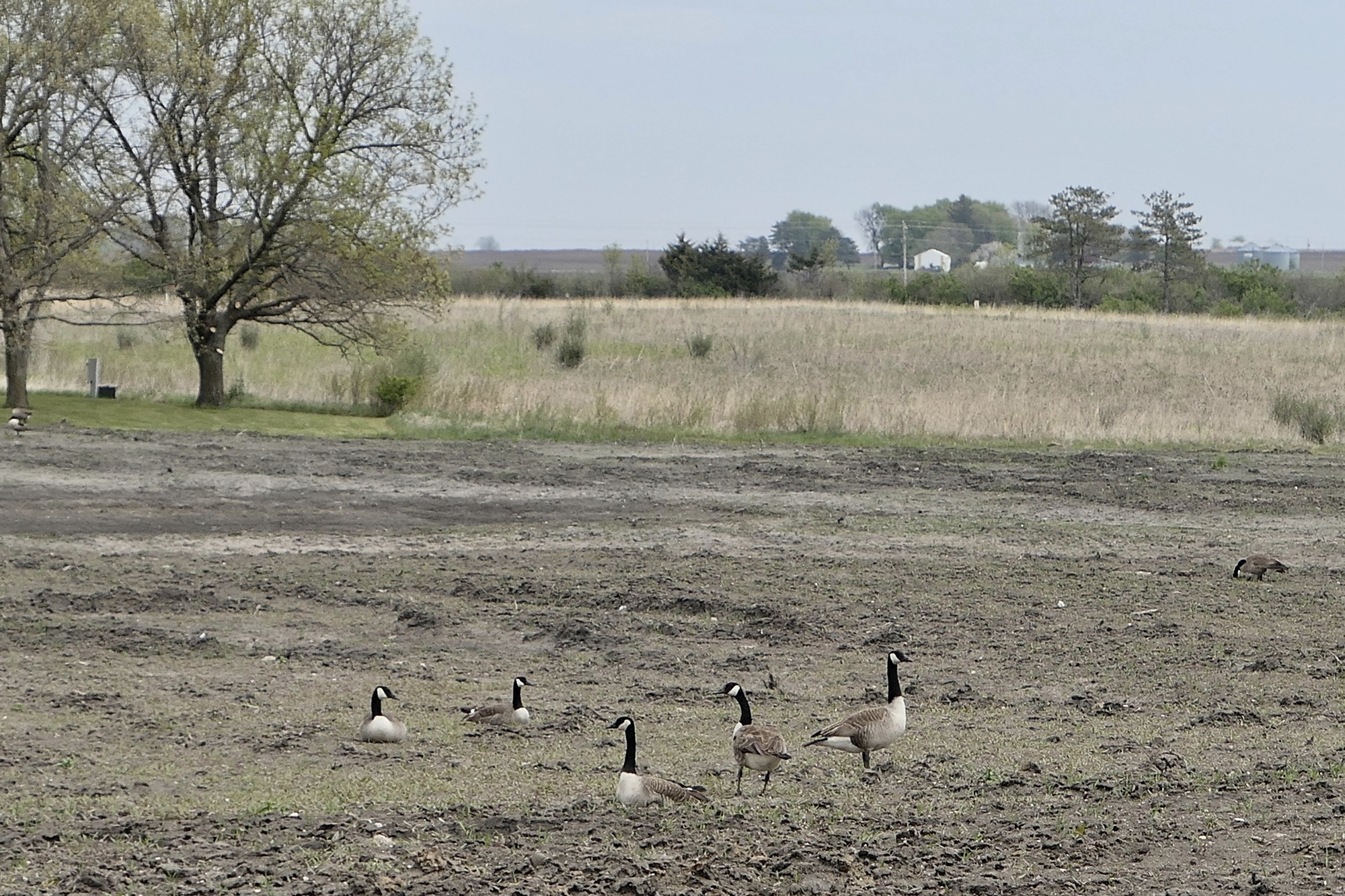 The Lincoln Highway continues east from Nevada, but the shoulder does not. There was little traffic though, so my anxiety level was low. Nonetheless, I had already decided on a backroads route to Hickory Park. About a mile out of town, I turned south on county highway S27 then east on a gravel road that took me into the park. The 445-acre park was closed for Covid and the 98-acre lake was currently undergoing a “lake restoration project” – one which involves draining and removal of the common carp that disrupt the normal ecosystem of the lake. I cycled past the road closed barrier and stopped for lunch at picnic table overlooking the partially filled lake. A chill breeze was blowing off the lake and after quickly downing my sandwich I headed off to explore a bit. As the broken-concrete roadway gave way to crushed gravel, there was an overall sense of sadness, of a park that had seen better days. It may have the gray skies, the chill in the air, the pandemic closure, or the half-drained lake but it felt like a park out of synch with both man and nature. Even the geese seemed to have lost their way – wandering about in a muddy field.