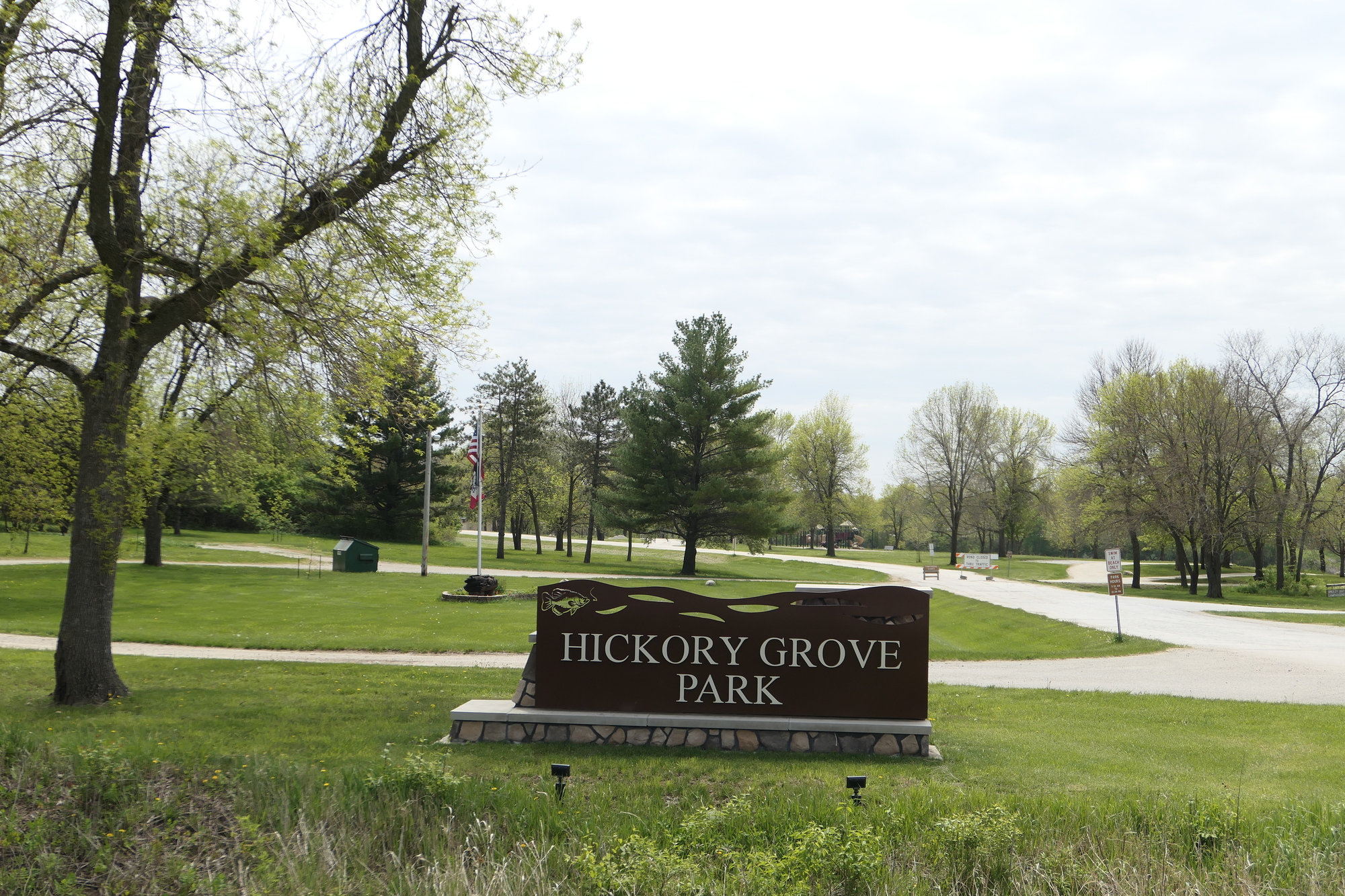 A large stone sign welcomed me to Nevada (pronounced Nuh-VAY-Dah), which in 1853 was selected as the seat of Story County based on its location in the center of the county. At the time, Nevada was also the population center of the county but it has long since ceded that distinction to Ames. Nevada sits at the intersection of two transcontinental highways constructed in the early 20th century: the Lincoln Highway (running east-west from New York City to San Francisco) and the Jefferson Highway (running north-south from Winnipeg, Manitoba to New Orleans). The town takes great pride in this fact and holds an annual festival to commemorate the highways. Today, the town was in the process of getting a new main street and I didn’t linger before moving on to Hickory Grove Park.