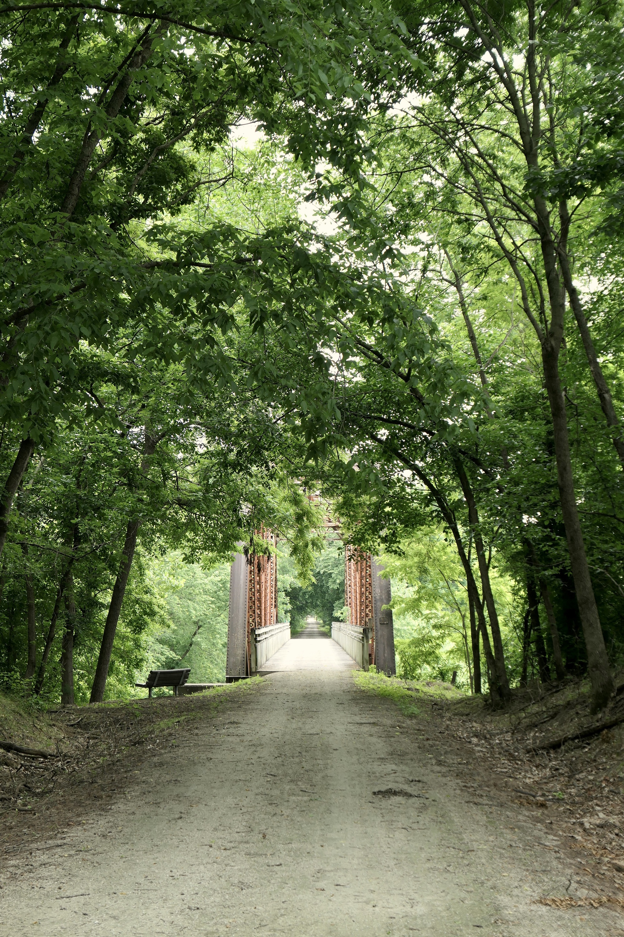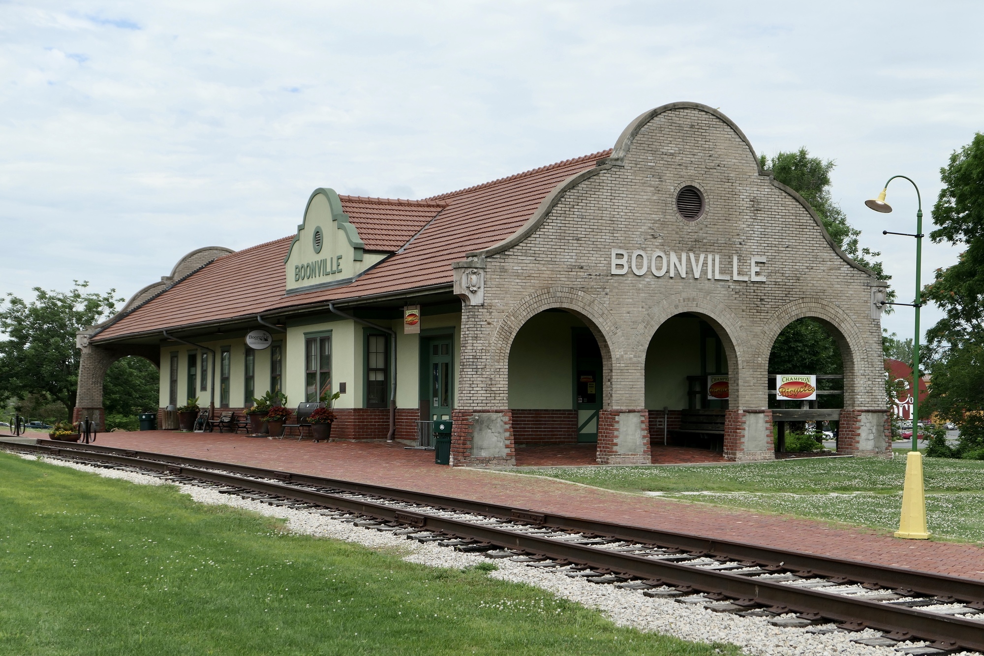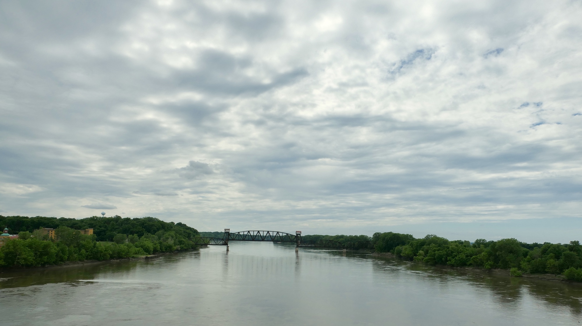 As the morning passed, I began to think that I might miss the rain. It had been a muggy morning, and I stopped in Pilot Grove for a quick snack and more water. By noon however, patches of blue sky started to appear and the trail was dappled in sunlight as it continued to gently roll its way down to Boonville and the Missouri River. I had a picnic lunch at the Boonville Trailhead and made a quick look-see ride through town before crossing the Missouri on a nice dedicated bike path. Several markers on the east bank of the river noted the beginning of the Santa Fe Trail and the Lewis and Clark Expedition.