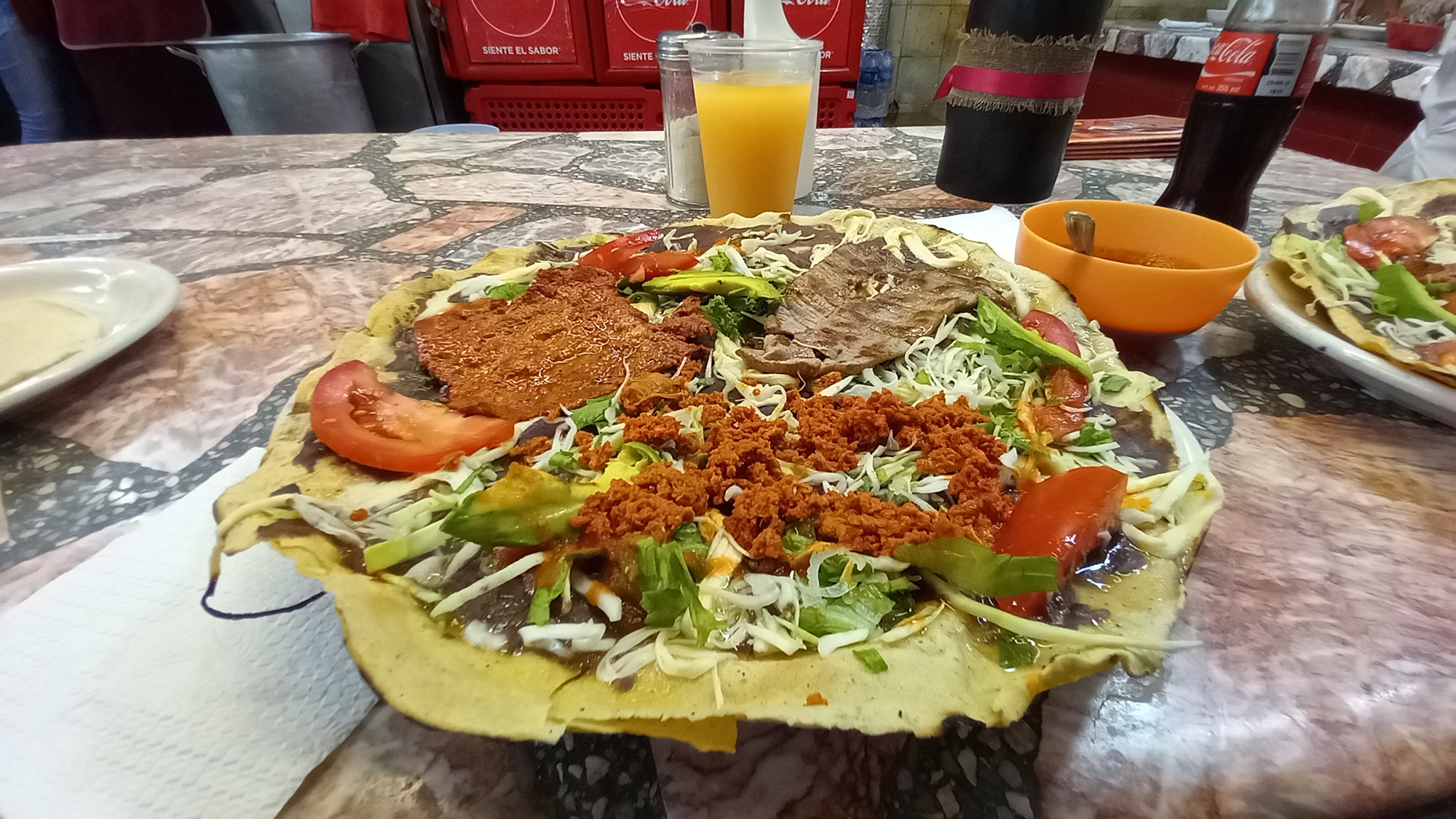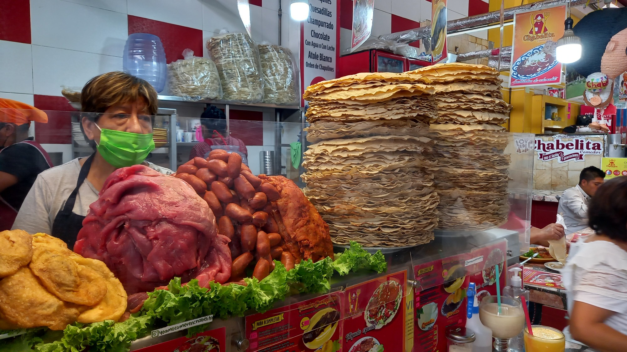 Then we headed to the food market next to the Mercado de Benito Juarez. We had missed it two days ago - if we had found it I might not have been struck down with food poisoning - but today we enjoyed a magnificent lunch there. It is just what we were hoping to find in terms of Mexican food. Our tlayudas (a pile of meats, cheeses and vegetables on top of a large fried tortilla) were full of flavour and variety.