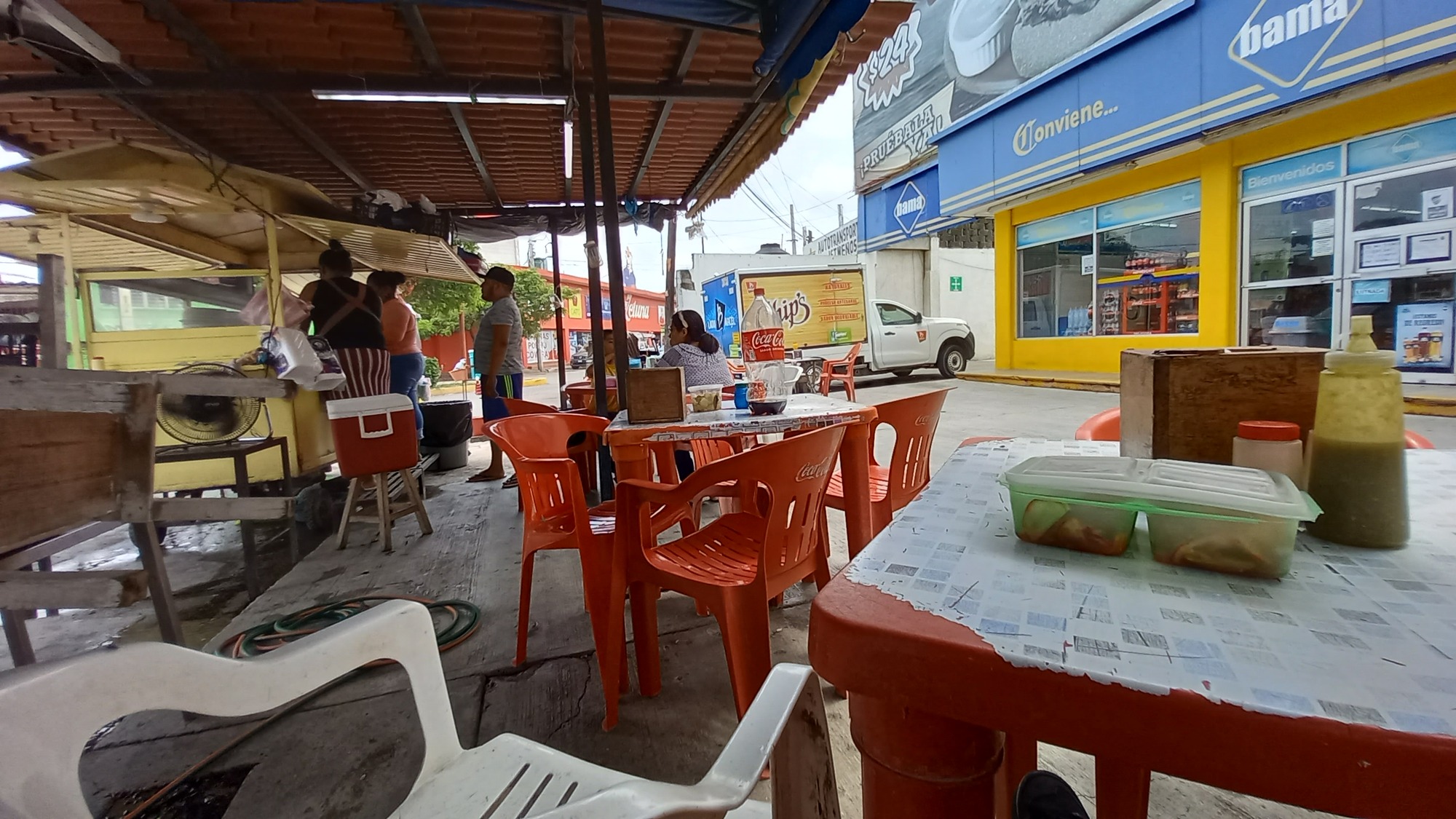 Check out time in most Mexican hotels is noon with earliest check in usually two or three in the afternoon. Despite leaving after ten thirty this morning we got to Juchitan just after twelve. Our hotel asked to return at one thirty so we cycled into the town to get some lunch (nice pork tacos) before returning to check in and cool off in the hotel's pool.