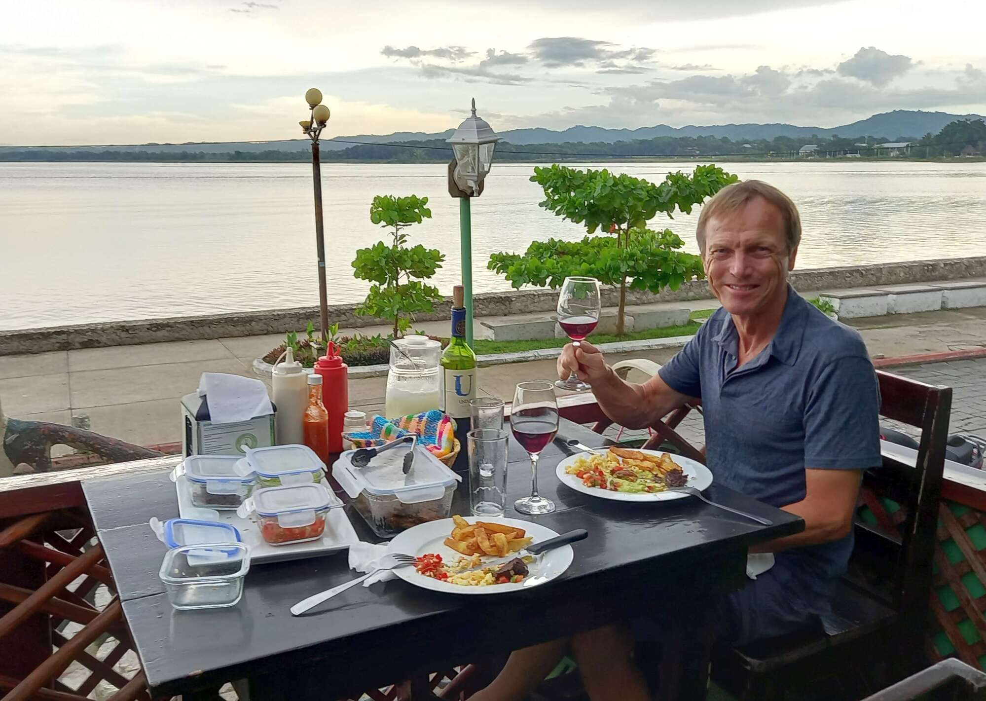 This evening we took a stroll over to the island, just a few hundred meters away. With a storm having just expended itself, we sat in the gloom on the balcony of a lake side restaurant and had a rather heavy meal and some very forgettable Chilean Merlot. This is the first wine we have had on this trip because wine in Mexico had been just too expensive.