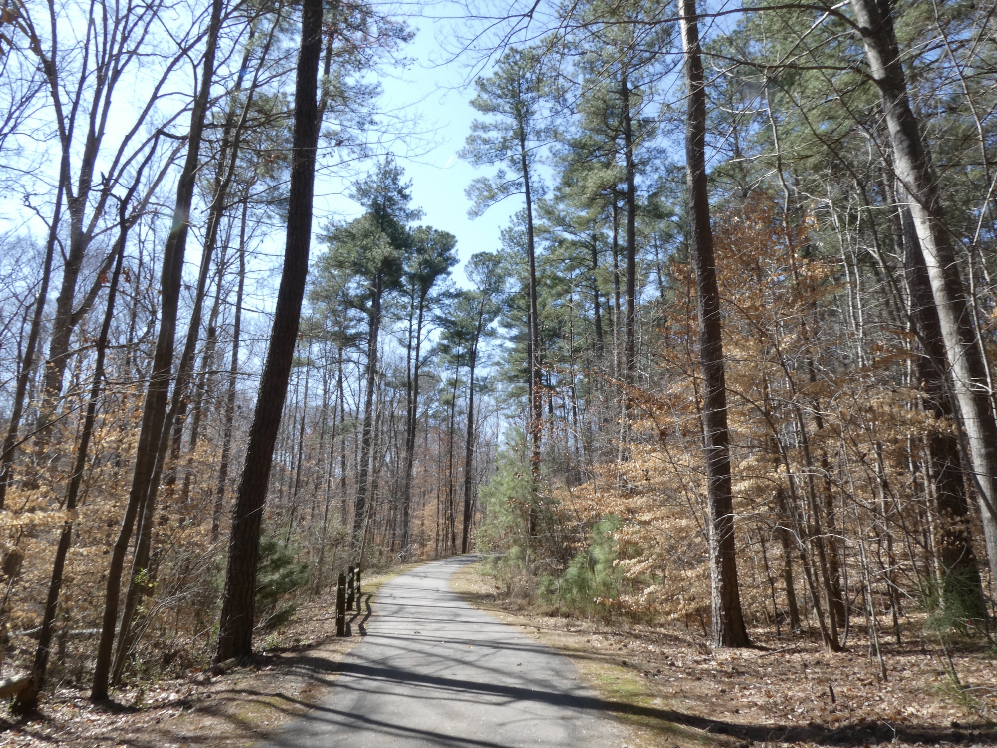 I headed out from home at just past 11:30, once the temperatures had crept into the low 50’s. A short ride through downtown Cary took me to Northwoods Greenway and I was soon back on Black Creek Trail. Today I headed in the opposite direction than on Monday, riding west toward Bond Park where the Black Creek Greenway meets the White Oak Greenway. Coursing through woods on paved trails and along raised boardwalks, White Oak is one of the most popular of the local Greenways. The trail ends at the 22-mile long American Tobacco Trail (ATT), the only bona fide Rail-Trail in North Carolina. The city of Durham is located at the northern terminus of the ATT, but today I turned east after only two miles, heading for Jordan Lake on county roads.