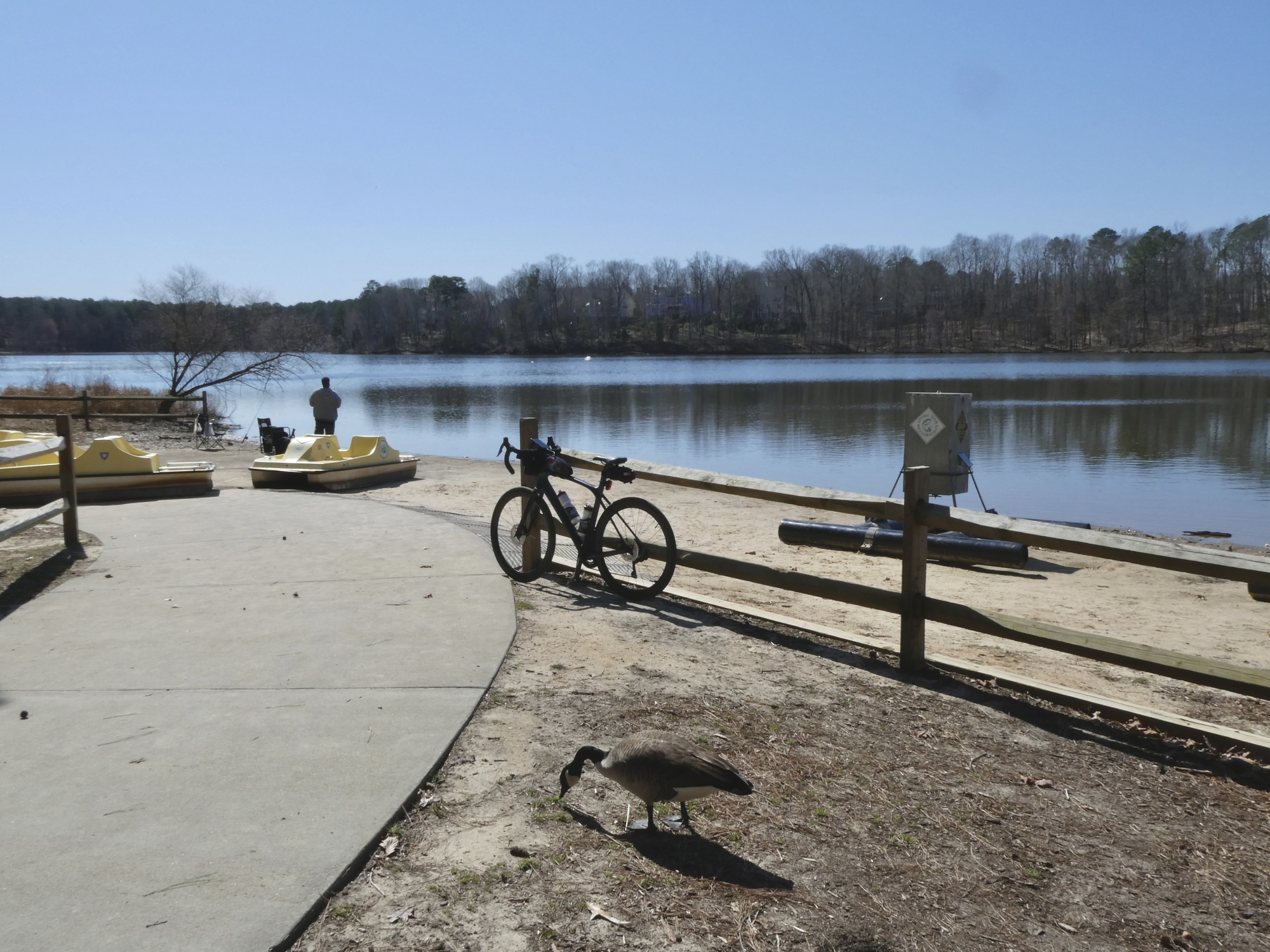 Other than a few paperwork chores, the day was free of commitments. Mostly sunny with temps in the mid-high fifties, it was a day destined for a bike ride. Vivien George was packed away so I pumped up the tires on my road bike, a newish addition to the family who hasn’t quite found a suitable name. I planned a more ambitious ride for today, out to Jordan Lake in Chatham County. It would be a mix of dedicated trails and what I hoped would be low-traffic roads.