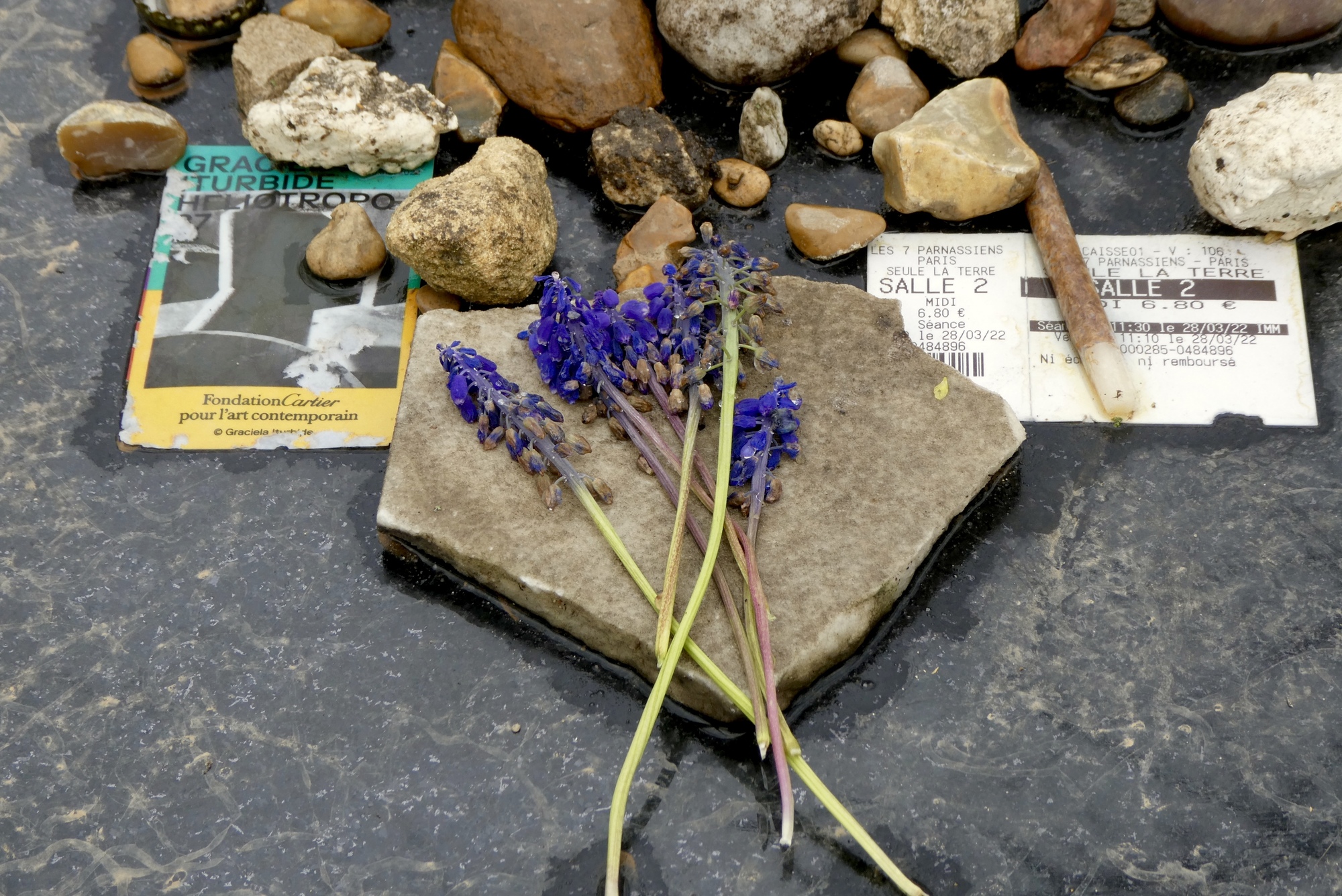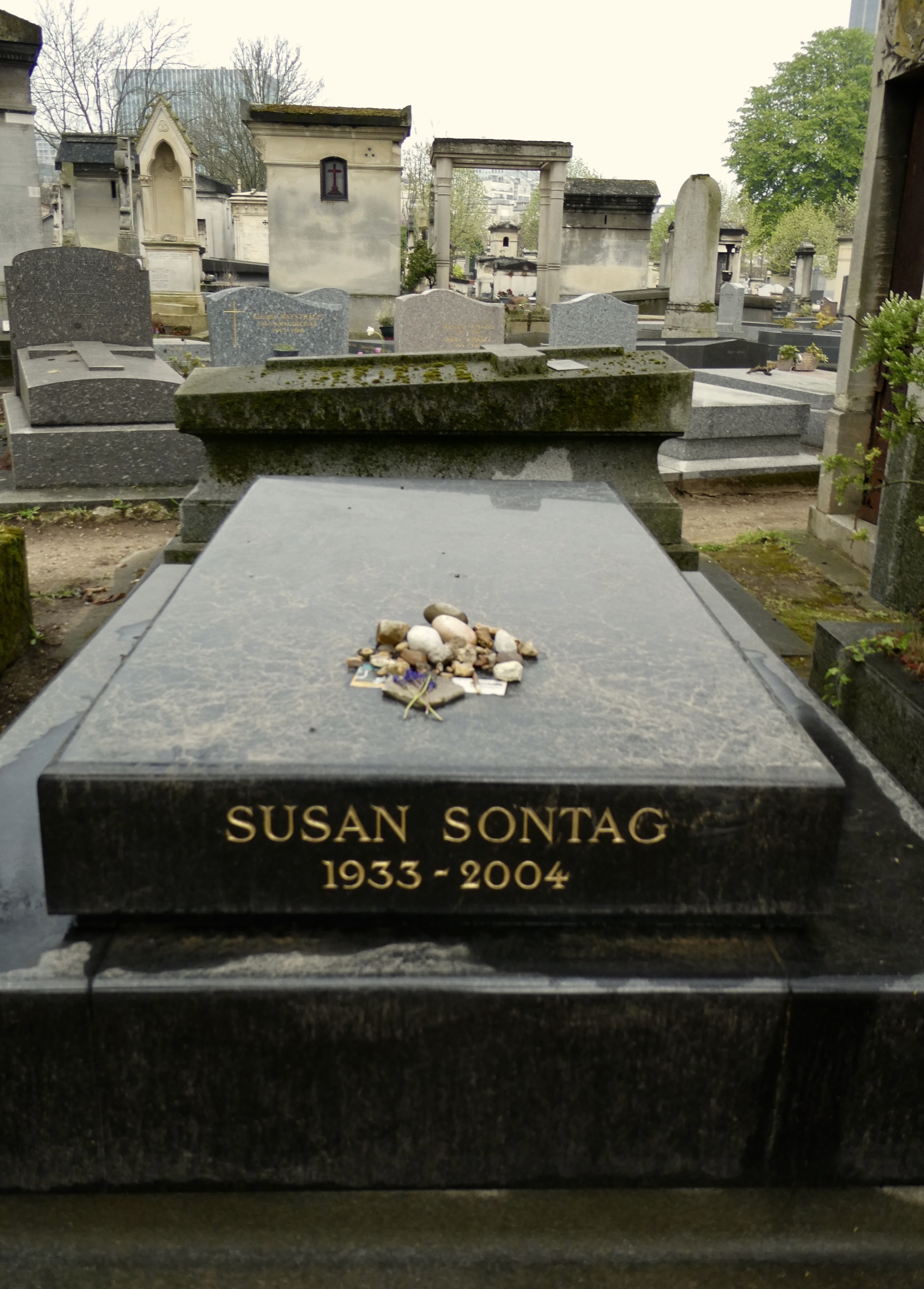 Jean-Paul Sartre and Simone de Beauvoir are buried together, their tomb decorated with kisses from admirers and often, though not today, with Metro tickets. Trinkets also graced the tomb of Susan Sontag – small rocks, flowers, art show and movie stubs. I could not find the tomb of Eric Rohmer – located somewhere in the middle of the expansive section 13. Just one more reason for another visit, perhaps on a quiet summer day.