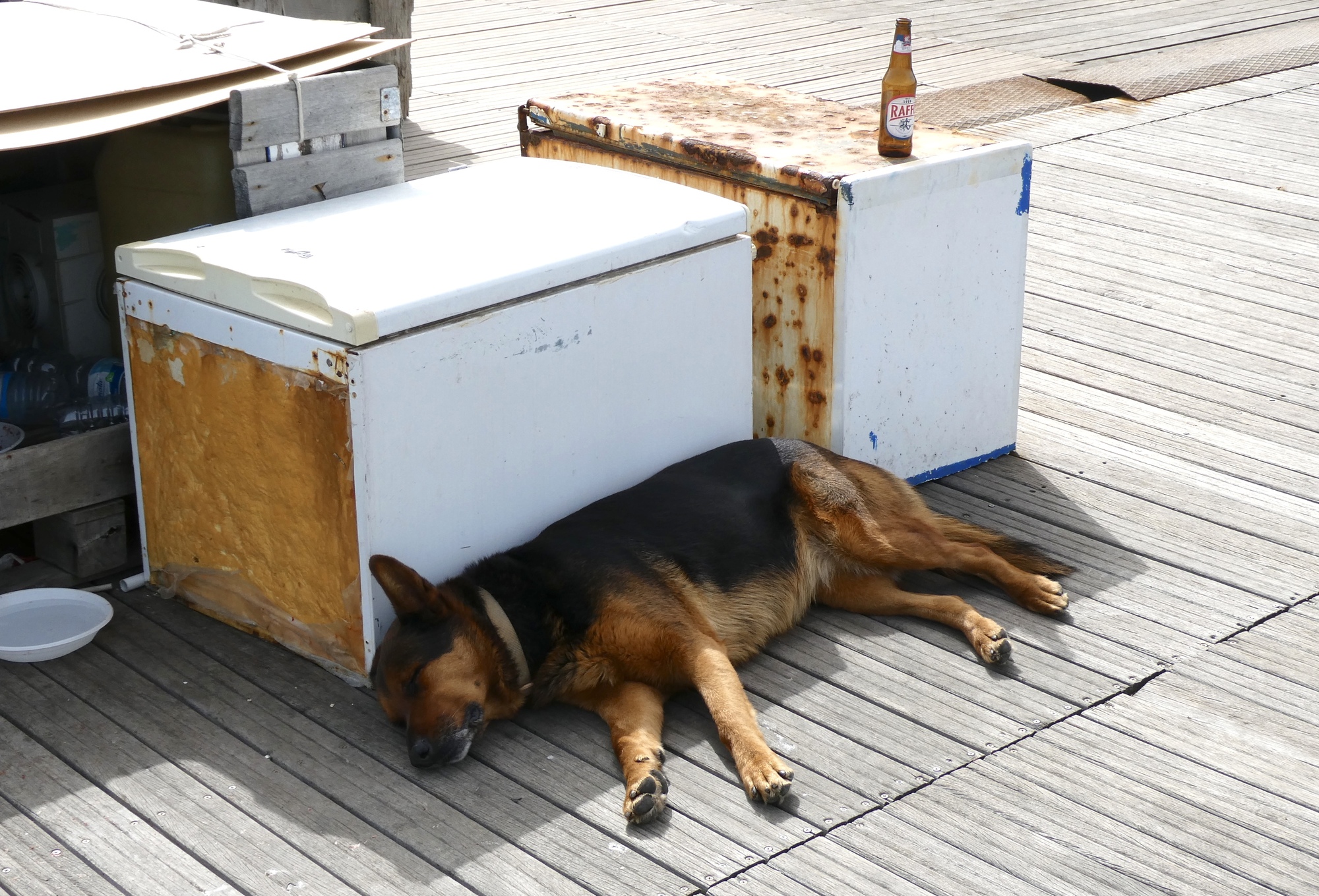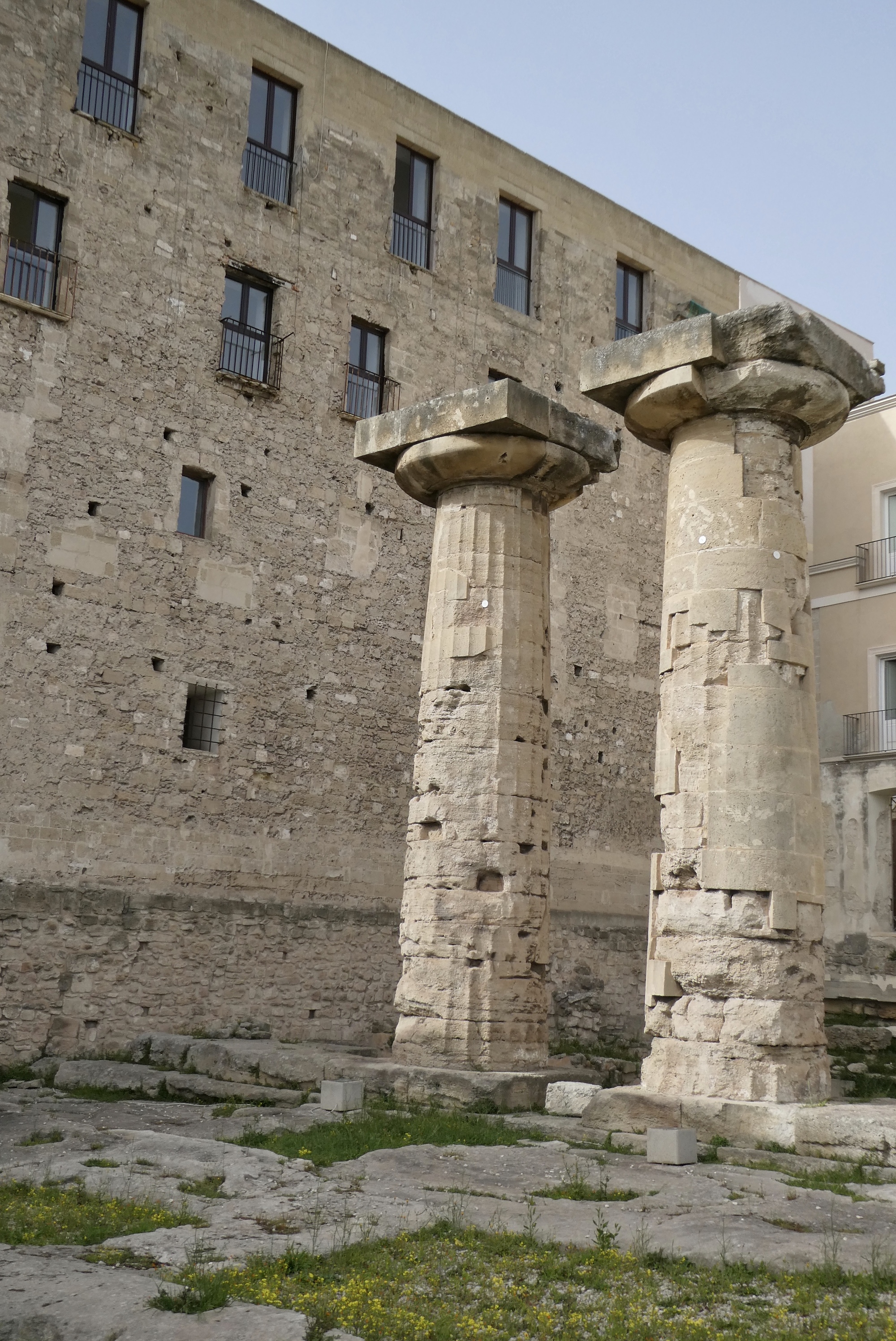 Taranto is a large industrial port city on the Ionian Sea originally founded as a Greek colony around 700 BC. The “Old City” established by ancient Greeks is now an artificial island between two bodies of water referred to as the Big Sea (a large bay in the Ionian Sea) and the Little Sea (a large lagoon). My exploration of this small island started along the Little Sea, where rows of fishing boats were reflected in the still waters of the sound. There was little to no activity on the boats, perhaps they were back from their morning run. In fact, the entire quay was quiet – it’s tranquility best captured by a large dog who’d found a small spot of shade for an afternoon nap. I did spy a pair of bikes with Ortlieb panniers and went over to chat with a couple of touring cyclists from Austria, Hans and Edith, who were on a 9 day trip through Puglia.