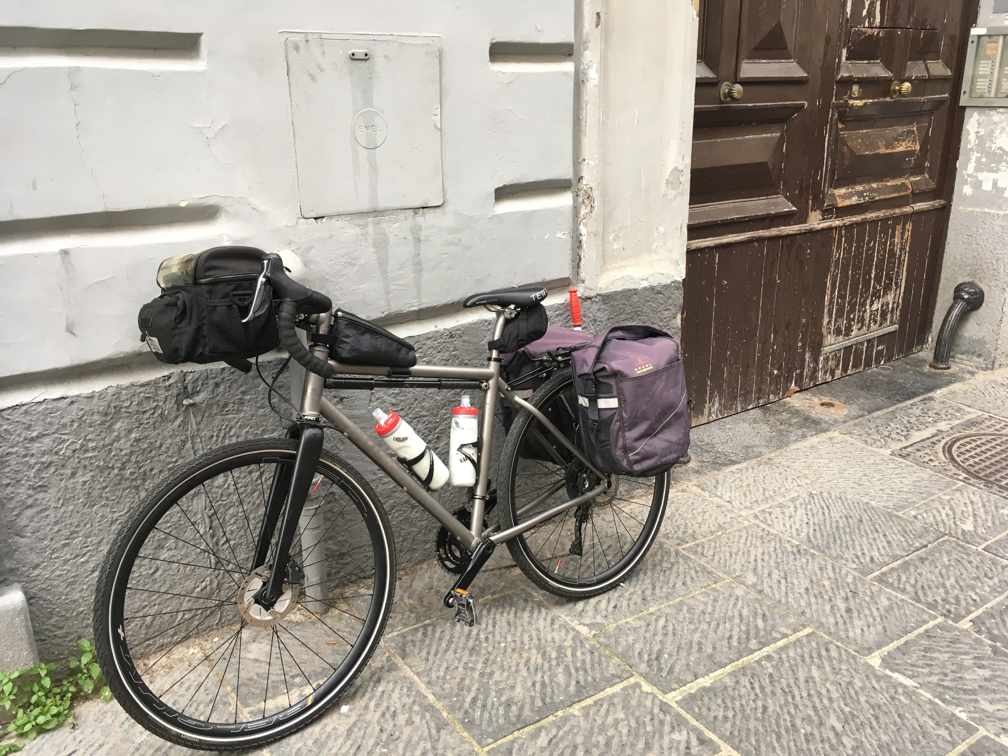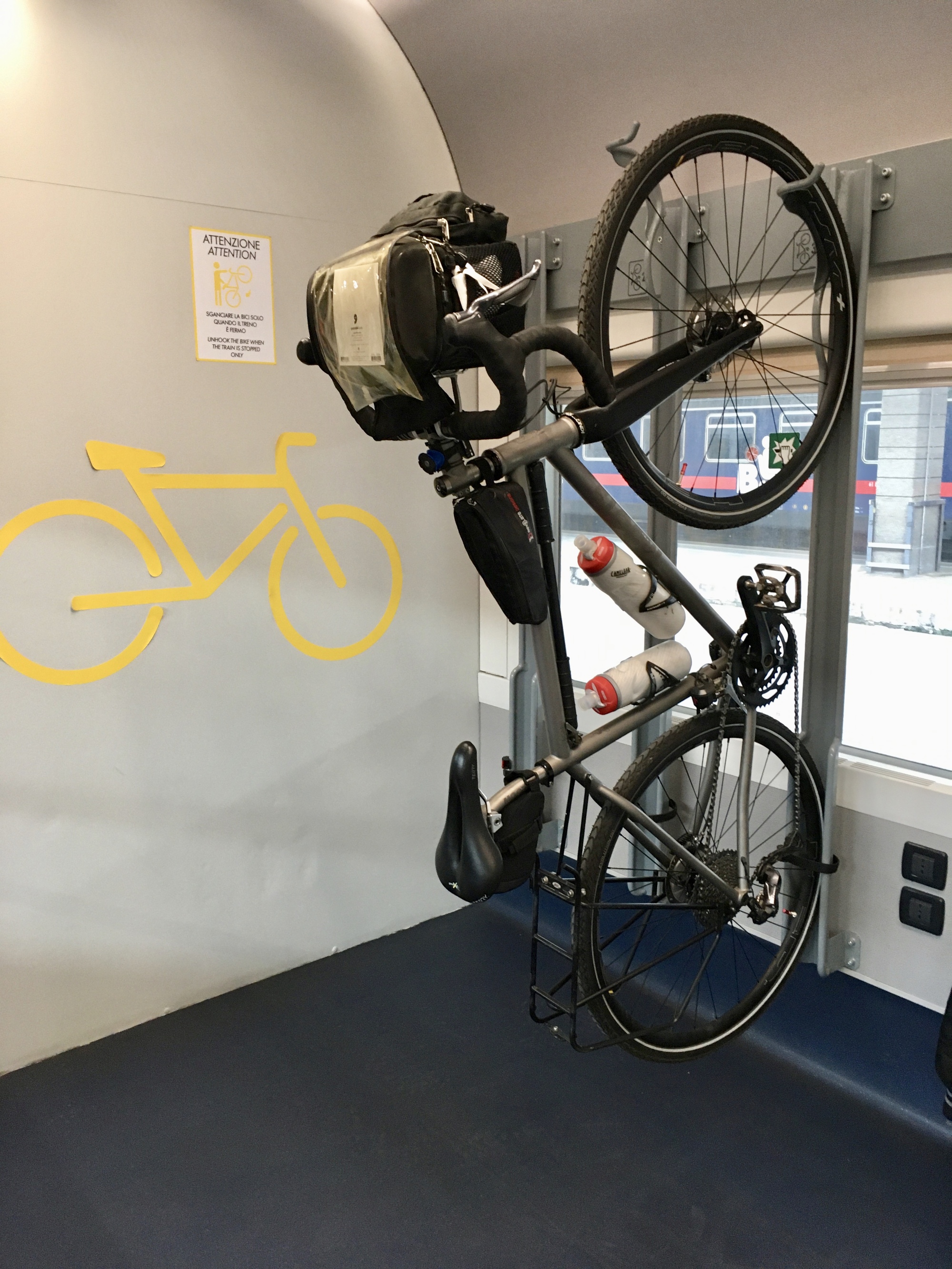 There were three narrow steps up into the car, but I managed everything pretty easily in two trips. As is becoming the norm, the bikes spaces were in vertical racks, with which I often struggle. However, the height of these hooks alternated and I was able to hoist Vivien George up onto a lower hook on the first try. I found my seat and we both settled in the the four+ hour trip to Taranto.