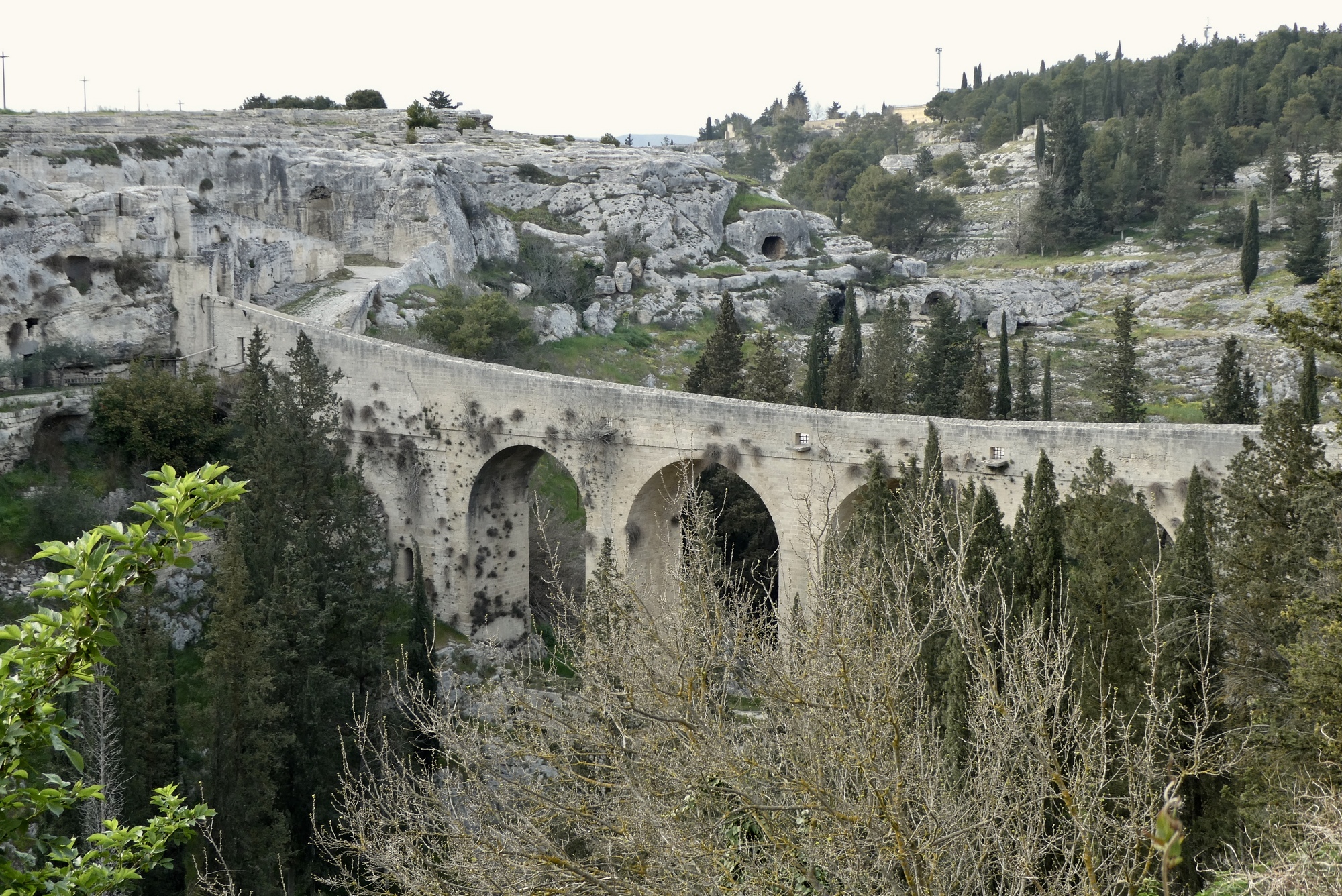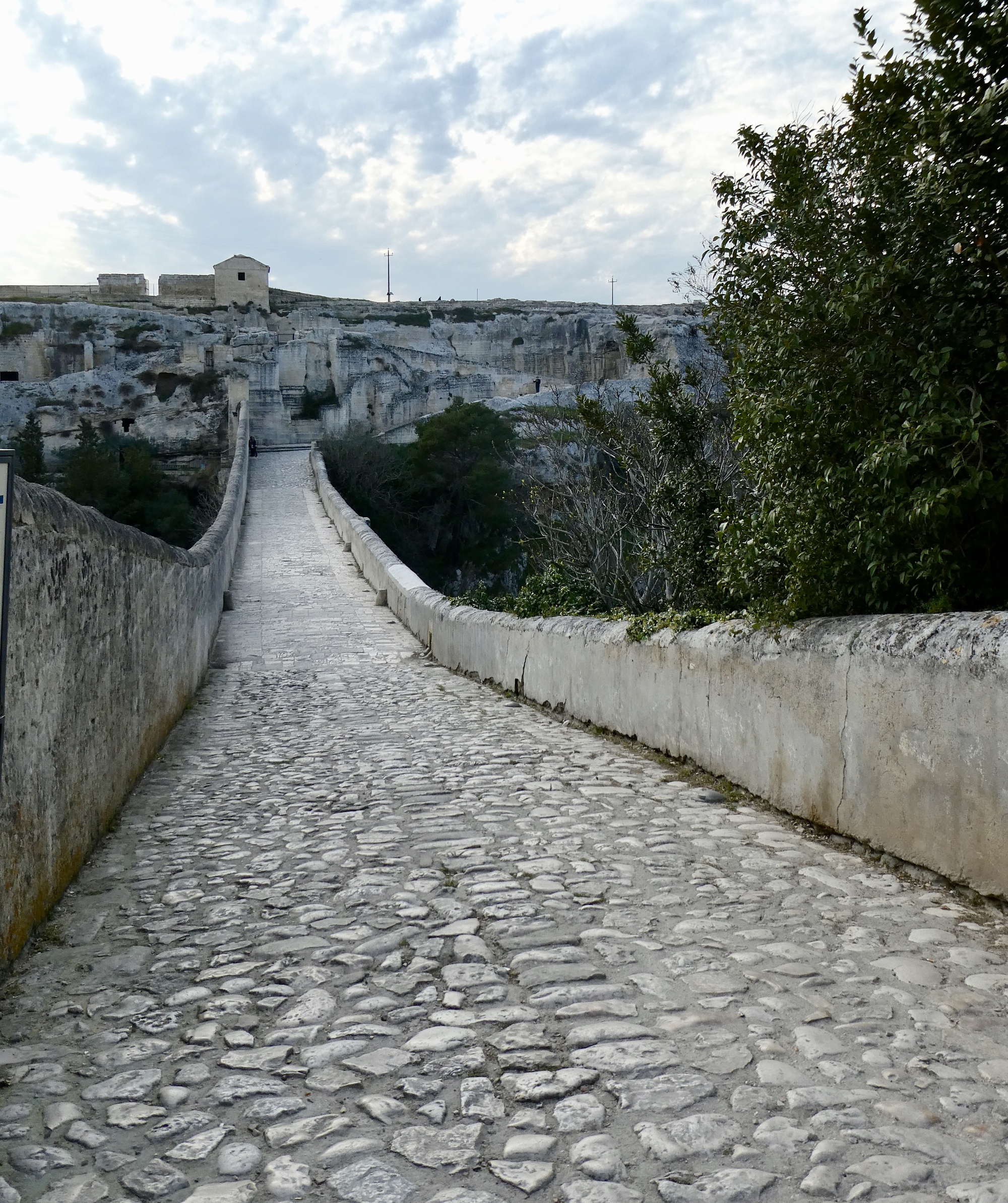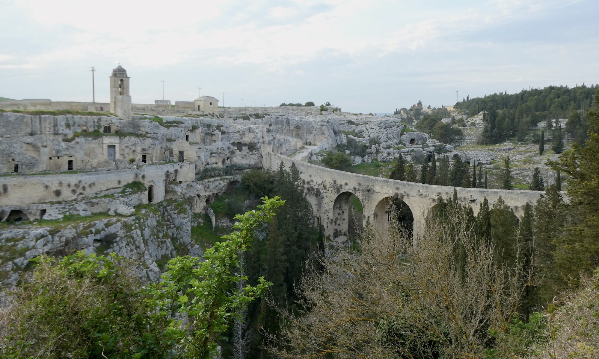 The rock church of the Madonna della Stella sits across the ravine on Botomagno Hill, accessed by crossing the Ponte Acquedotto