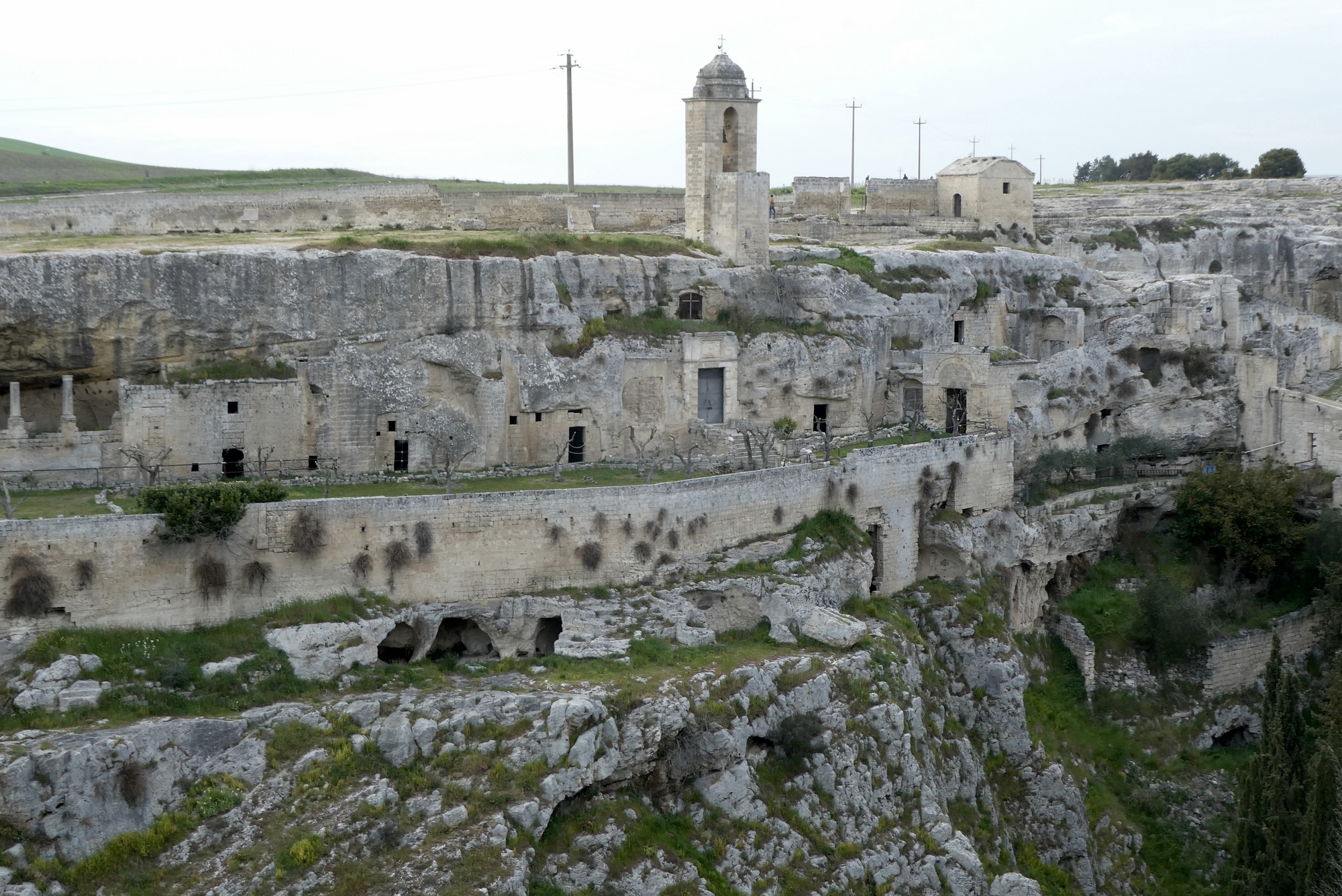 The Chiese rupestre Madonne de Selle sits atop Botromagno Hill while below are several layers of former dwellings carved into the ravine walls. This area below the surface remains an active archeological site and is inaccessible to tourists