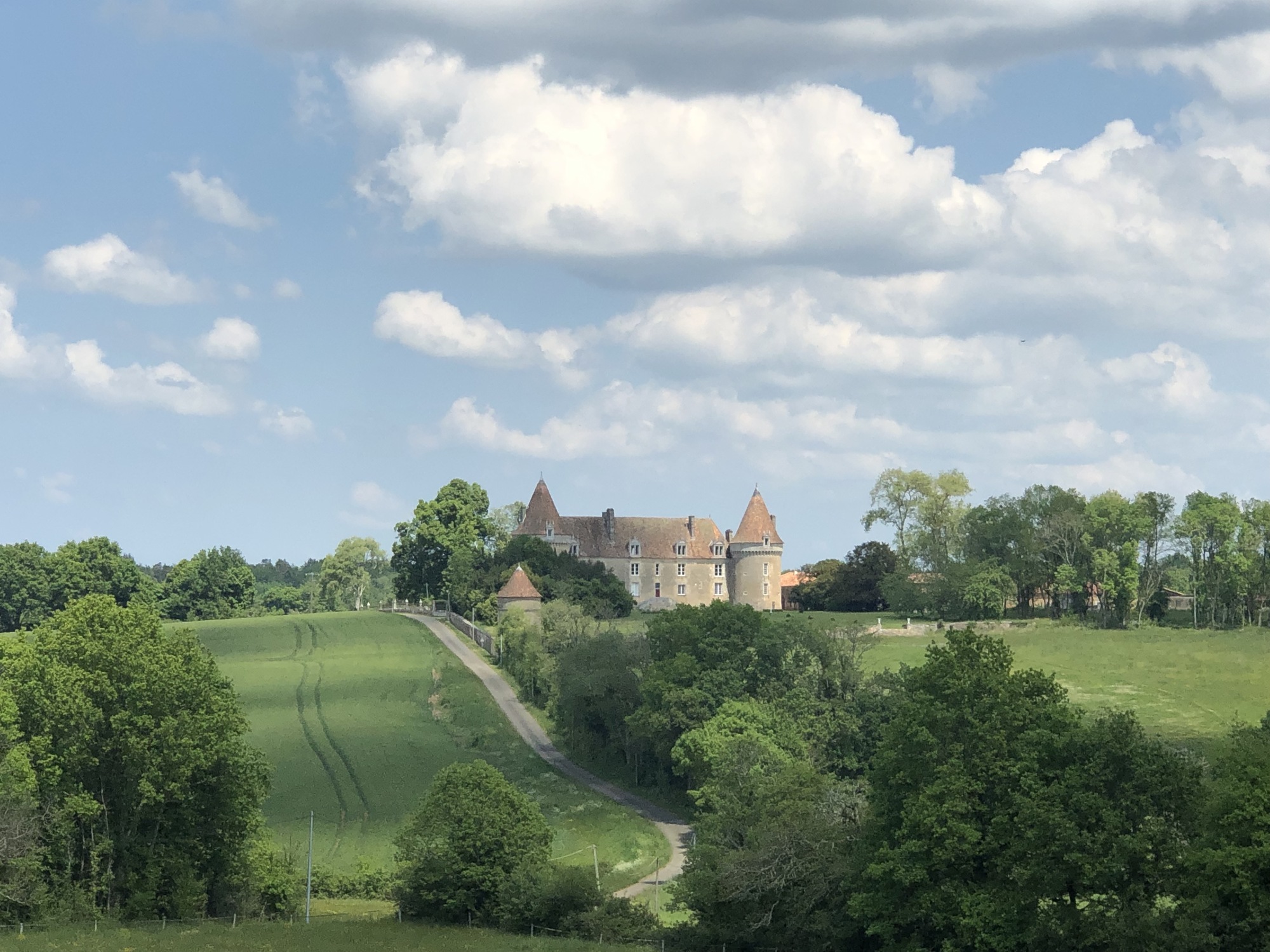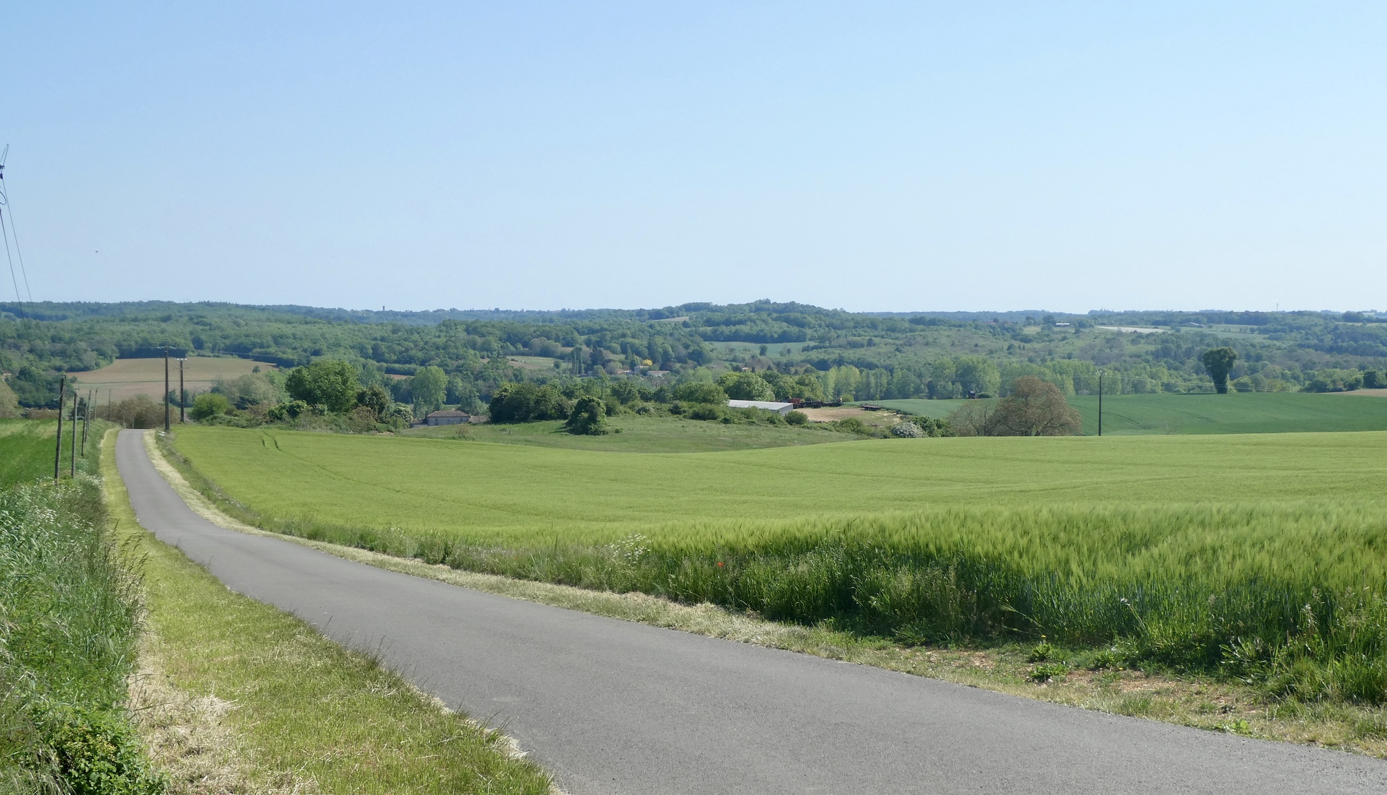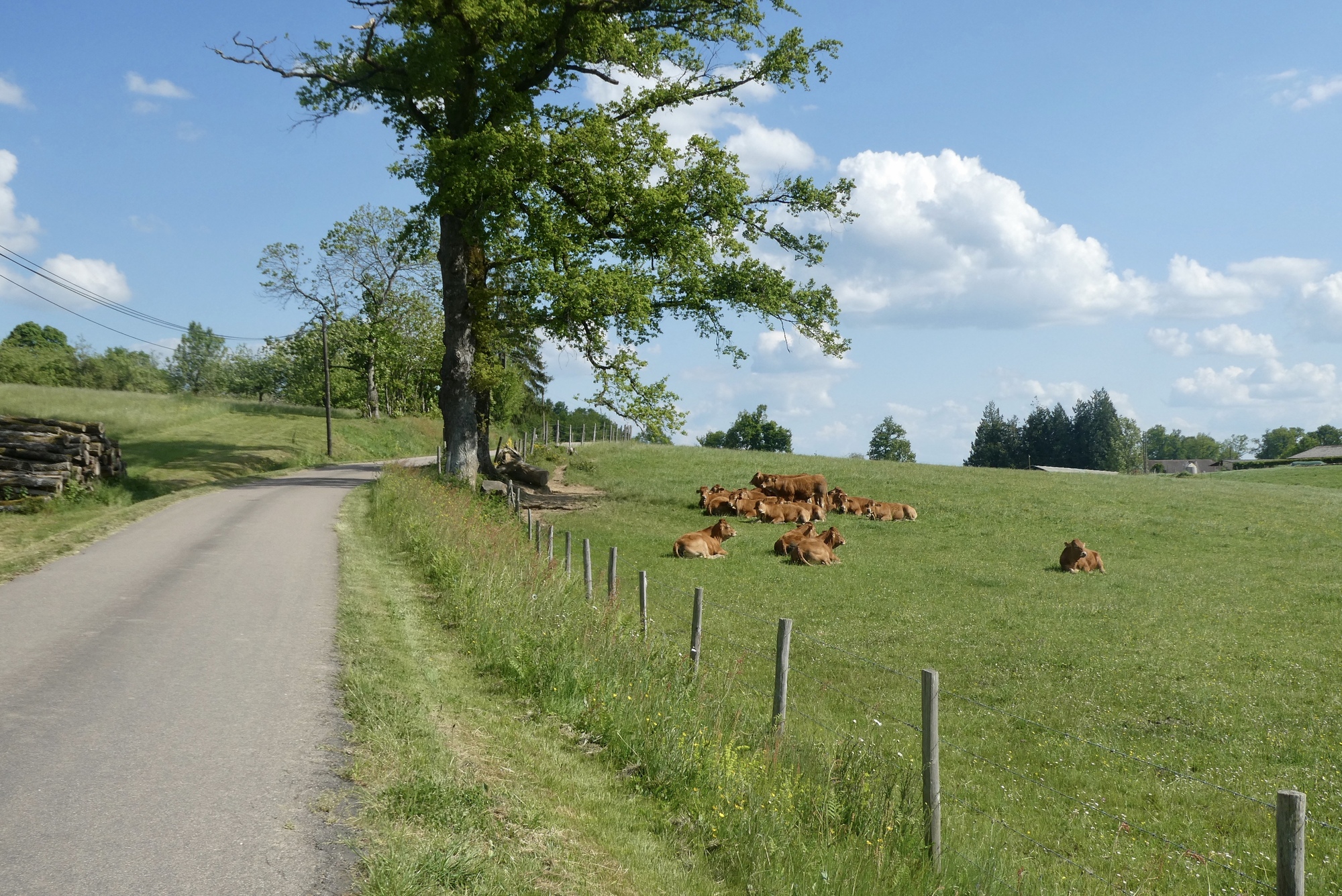 From my little online research, the Périgord-Limoiusin regional park was created in March 1998 and is located on the northwestern outskirts of the Massif Central. Covering over 1800 sq km, it has a diverse landscape of agricultural fields and wooded areas that flank the western foothills of the Massif Central. As I am learning in real life, most of the ridges/foothills seem to run north-south, so my travels eastward necessarily entail a lot of ups and downs, through woods, fields, and farmland.