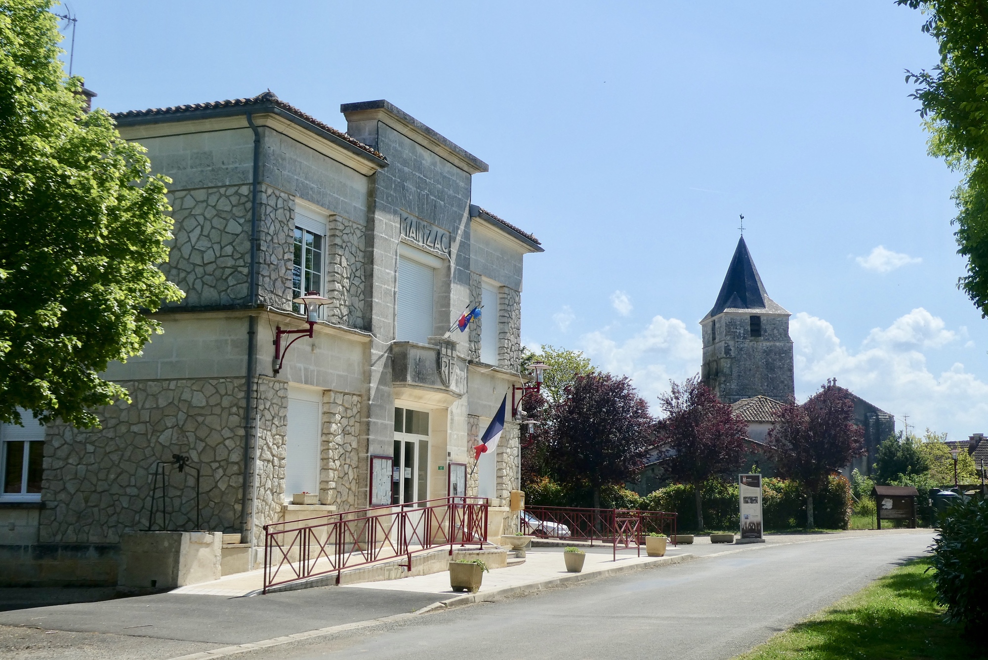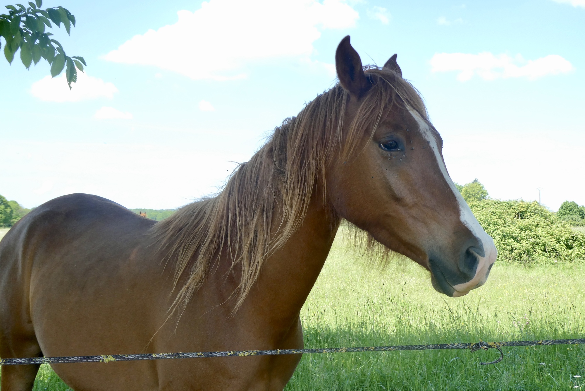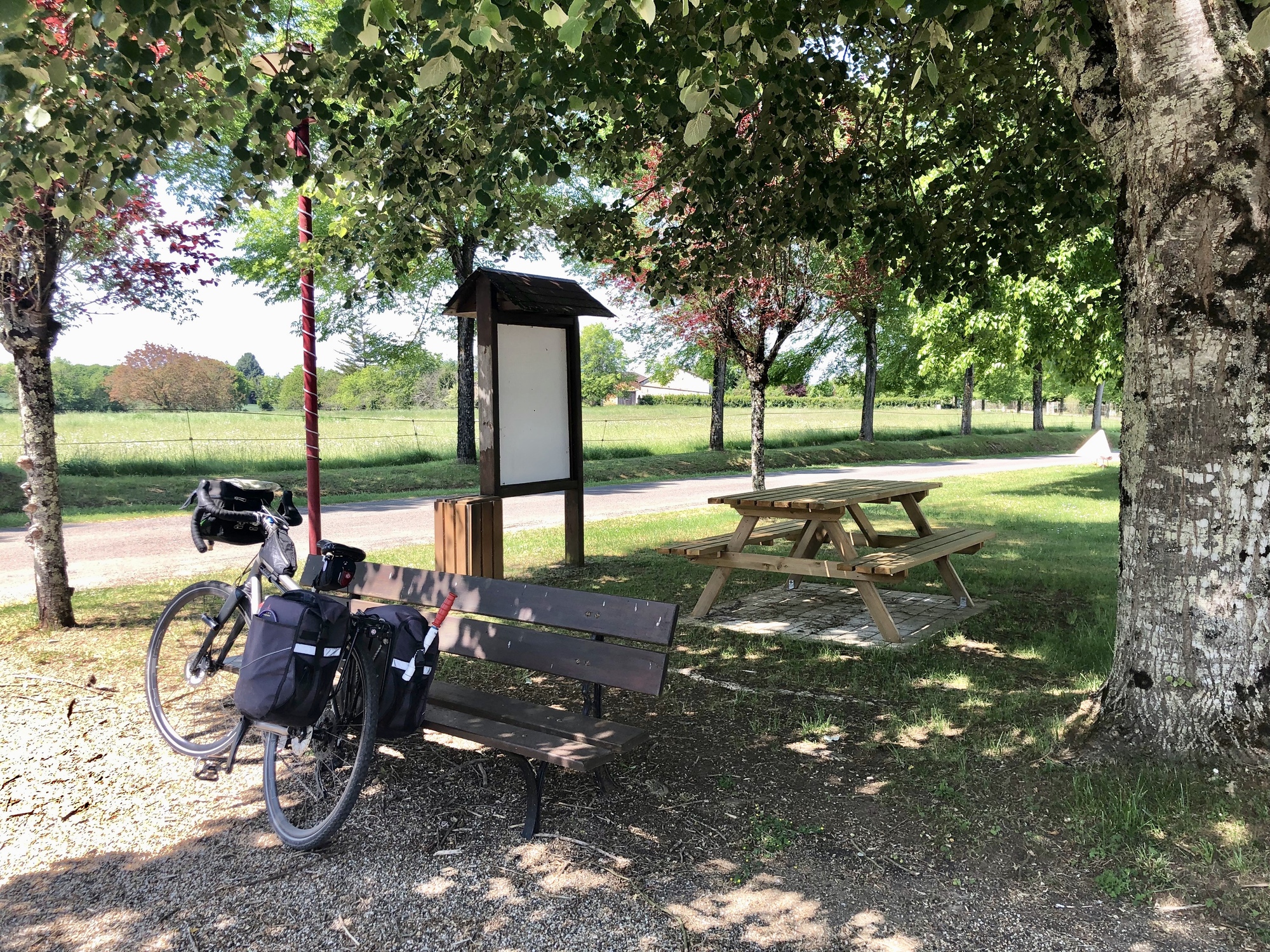 It was a beautiful day for cycling and as I headed up from the Bandiat through the farmlands and woods of the eastern Charente, I forgot my concerns about the pocket knife and just enjoyed the moment. After six miles, I reached my blacksmith friend but he had nothing for me – I can only take comfort in knowing that someone else is enjoying a pretty fine pocketknife. I headed back down the road from whence I’d come, and after a couple of miles turned east toward Mainzac where I stopped for a little snack and was cheered by a small herd of horses.