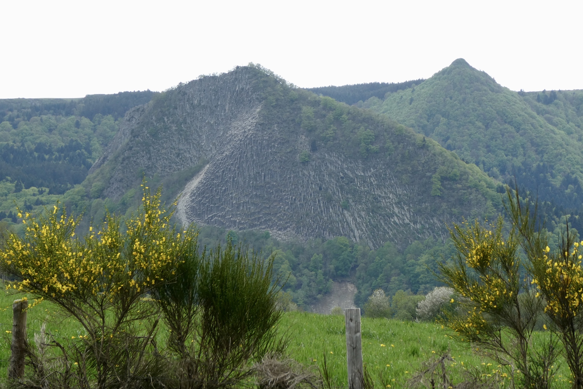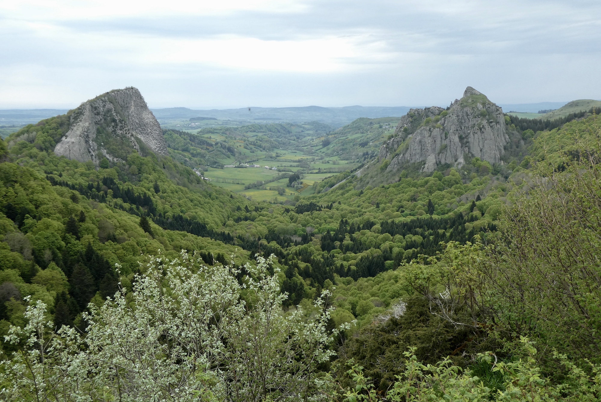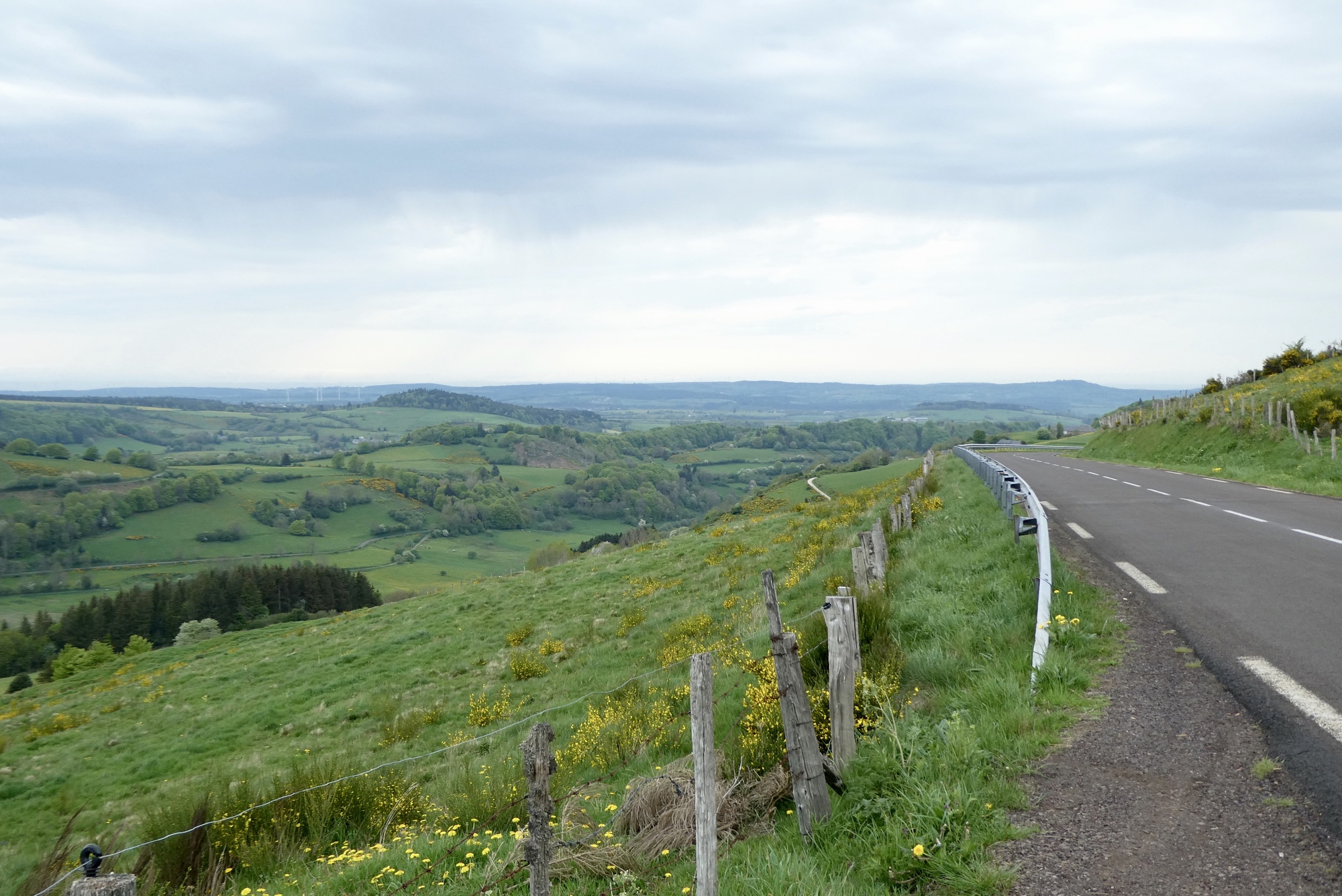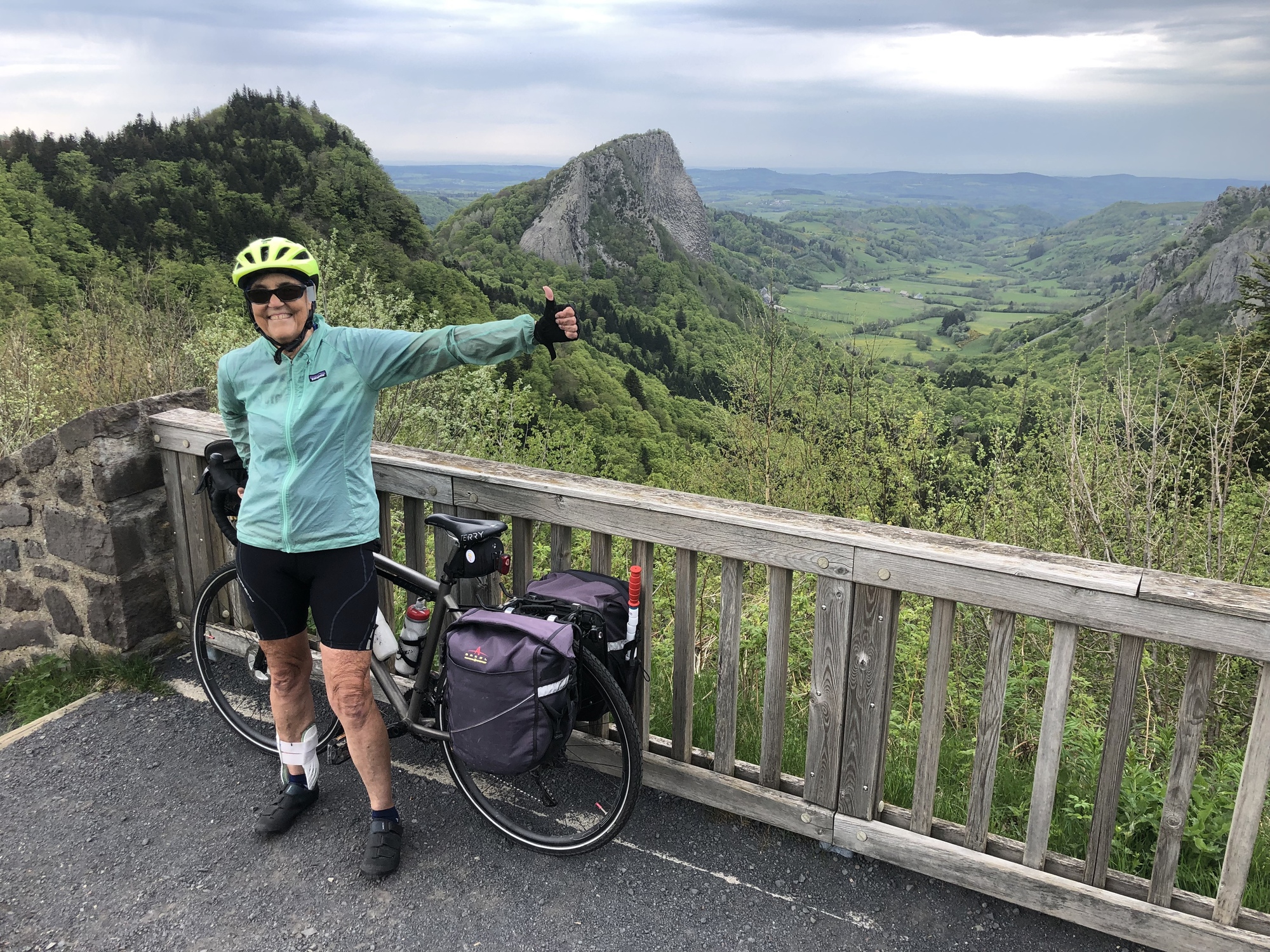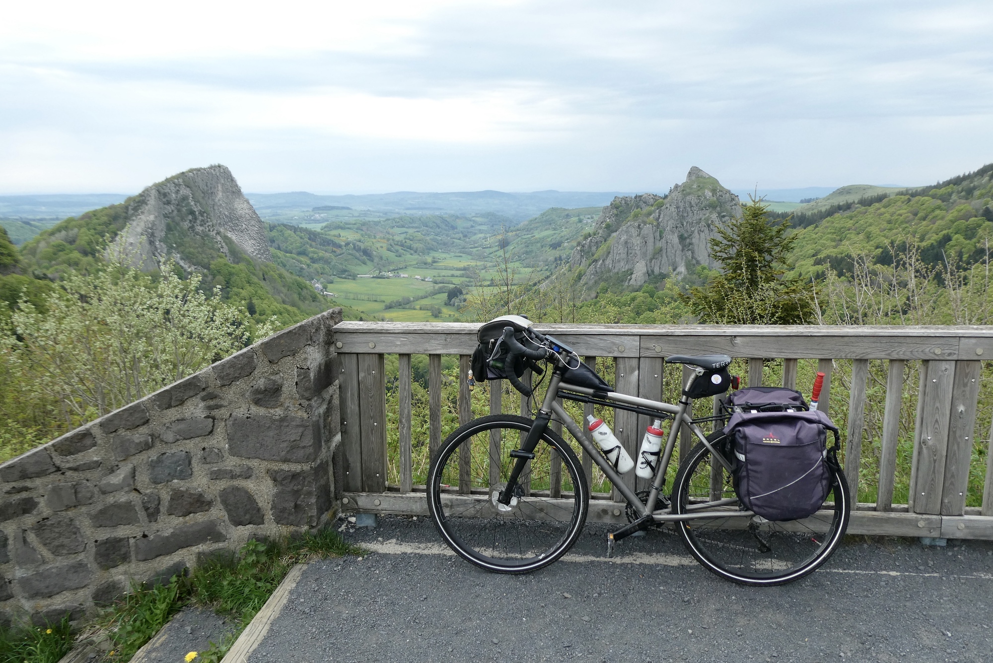 The climb continued on past Mont-Dore, on an excellent road that had no doubt been spiffed up for the 2020 TdF. Most of the route was tree-lined but occasionally opened up to a one of volcanic cinder cones that give the park its name. After five miles I reached Lake Guercy, a wonderful fishing lake formed millions of years ago when lava flow blocked one of the high mountains springs. After a just bit more climbing I came to the top – and was delighted to find I’d ascended the Col de Guercy - I'd obviously done little of my own research on today's route. Thus, when I started downhill I almost passed by the parking lot populated with tour buses, deciding only at almost the last minute to pull into a viewing area. And boy am I glad I did – an unbelievable view over the valley dominated by the volcanic cone Roches Tuilière and Sanadoire. I was gobsmacked.