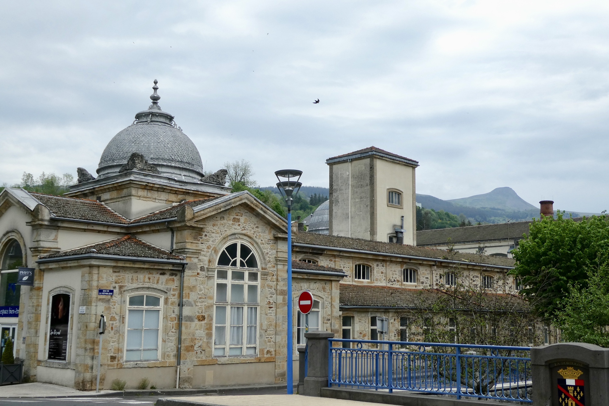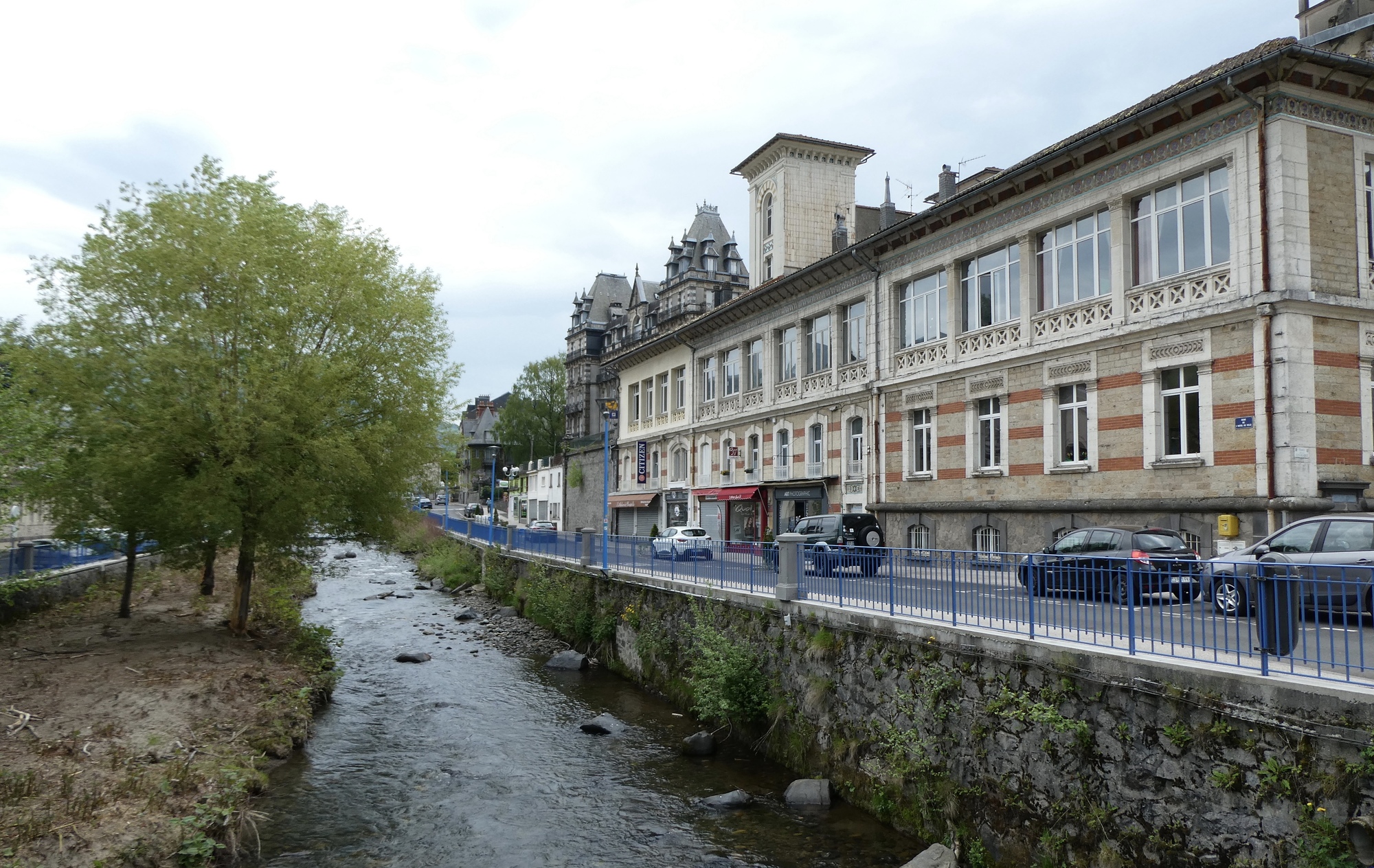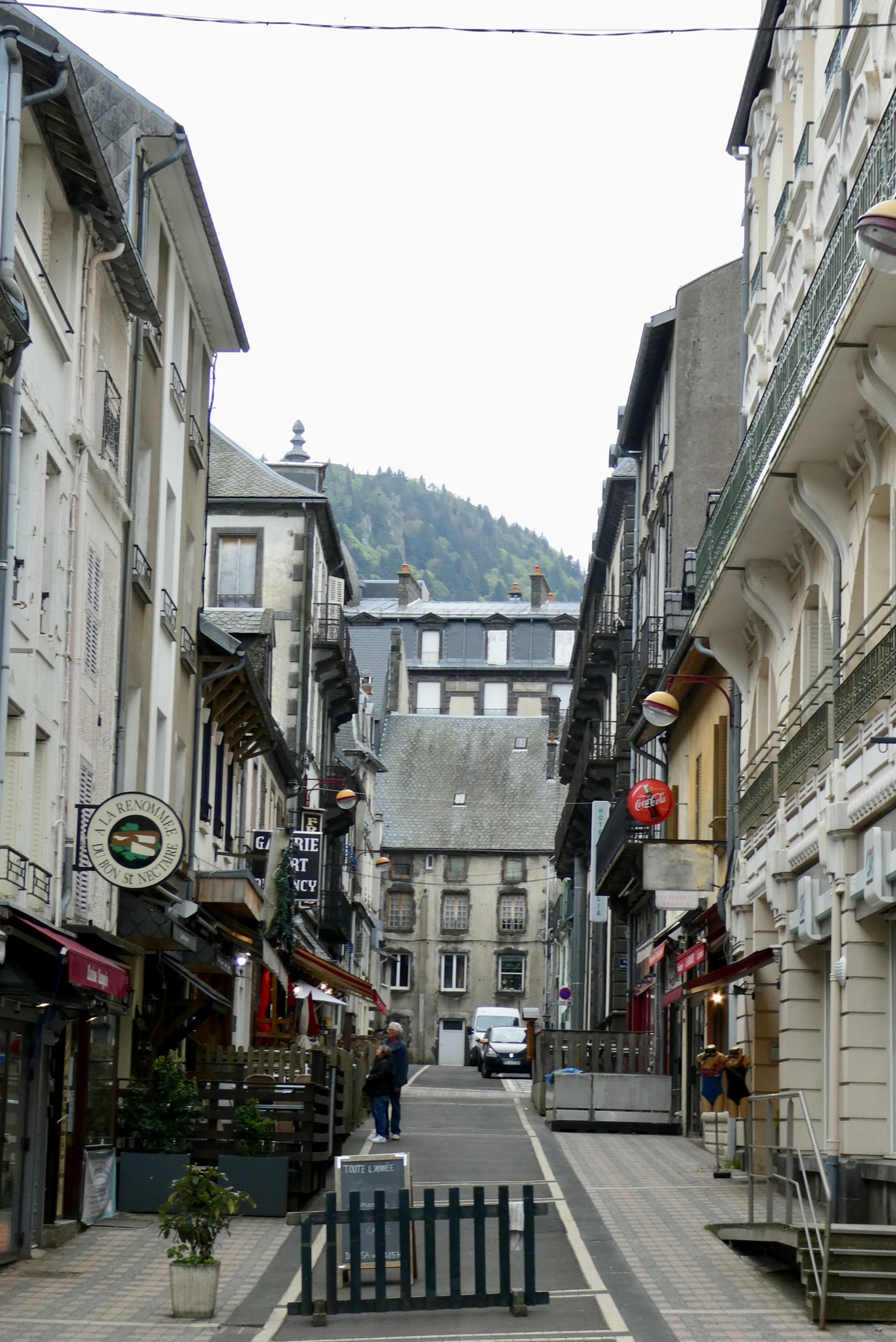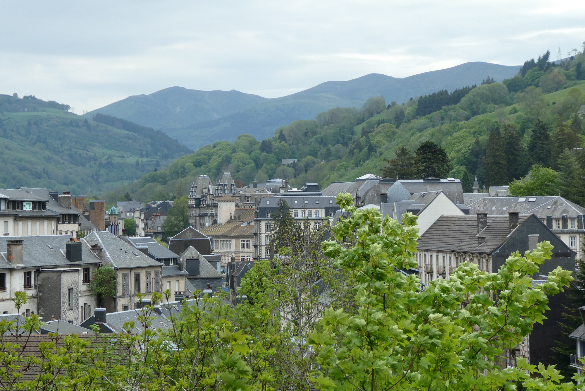 During the next five miles to La Bourboule, I was questioning Jacques definition of spectacular scenery. The route wound through a narrow, tree lined valley along the Dordogne River, and my views were limited to trees and passing automobiles. My first impression of La Bourboule was just as underwhelming, until I rounded a final curve and saw an architecturally interesting town laid out along the two banks of the Dordogne River.